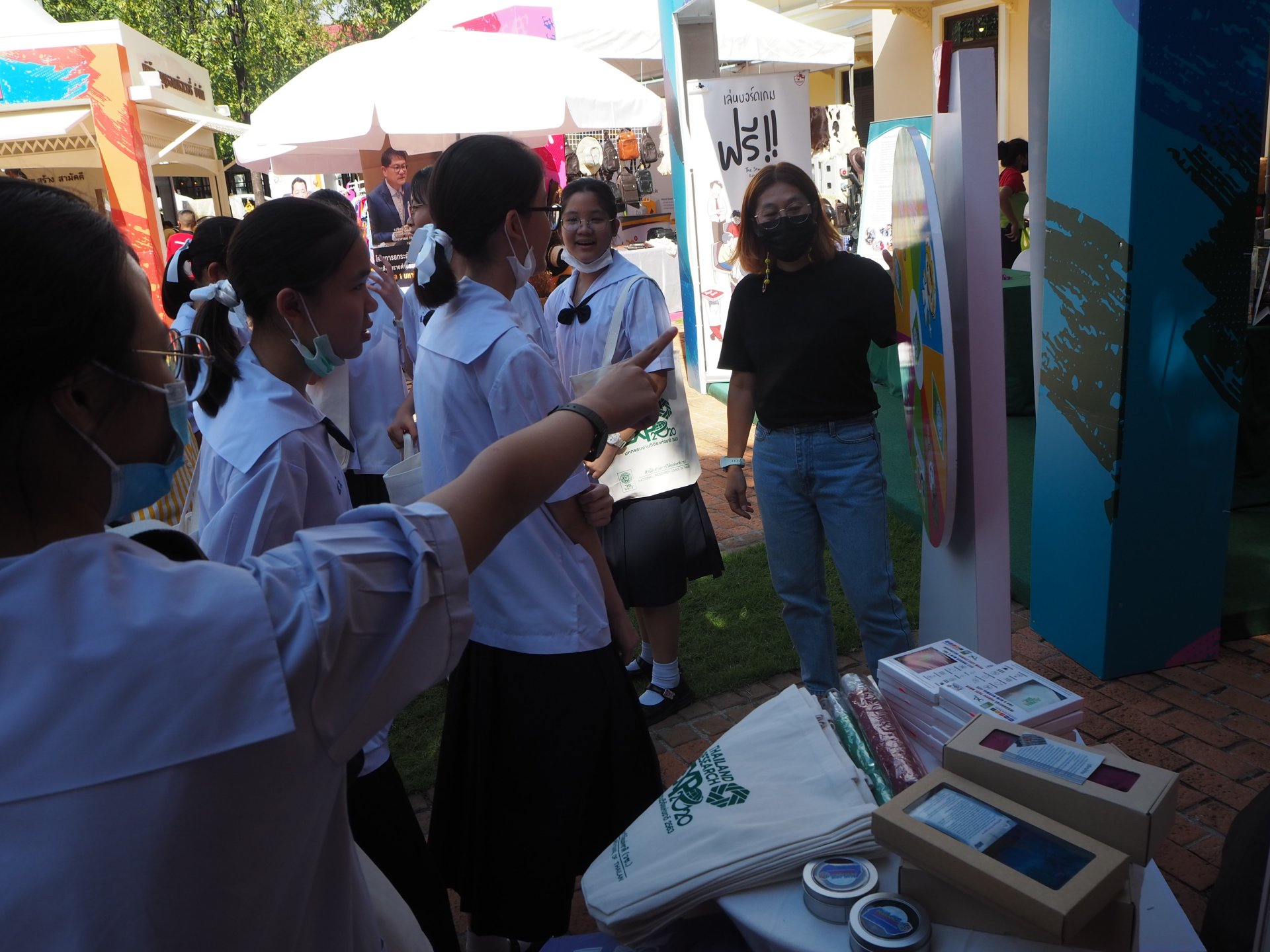 บรรยากาศภายในงานมีนักเรียน เยาวชนและผู้สนใจเข้าร่วมกิจกรรมภายในบูธ วช. กันอย่างคึกคัก ทั้งร่วมกิจกรรมหมุนวงล้อชิงรางวัล กิจกรรมร้อยสร้อยข้อมือจากลูกปัดกะลามะพร้าว รวมทั้งชมผลงานวิจัยที่ได้รับทุน วช. เช่น ชุดกระเป๋าปฐมพยาบาลอัจฉริยะ Walker อเนกประสงค์สำหรับผู้ป่วยและผู้สูงอายุ และแจกันหัตถศิลป์ พร้อมกันนี้ภายในบูธยังจำหน่ายไอศกรีมซึ่งเป็นนวัตกรรมที่ได้จากการวิจัยในราคาพิเศษด้วย