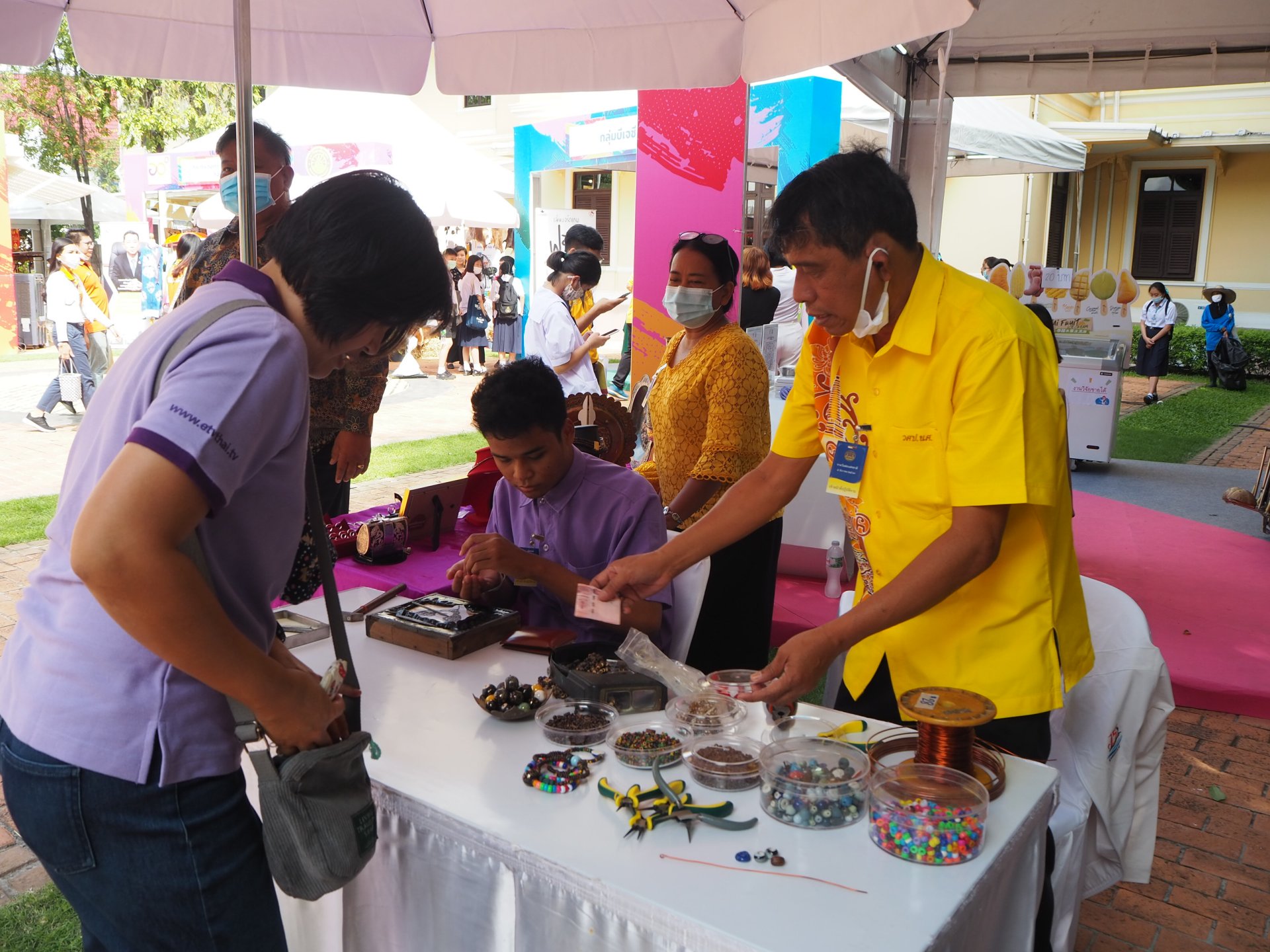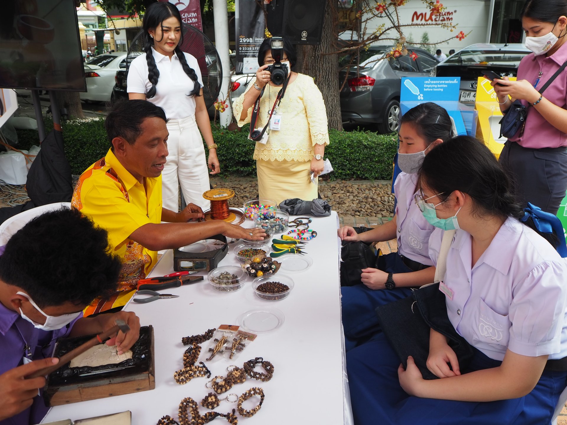 นักเรียน เยาวชนวัยใสและประชาชนร่วมชมสิ่งประดิษฐ์จากทุนวิจัยสำนักงานการวิจัยแห่งชาติ (วช.) กระทรวงการอุดมศึกษา วิทยาศาสตร์ วิจัยและนวัตกรรม (อว.) ภายใน “งานวันพ่อ” ณ มิวเซียมสยาม ร่วมหมุนวงล้อชิงรางวัลกันอย่างคึกคัก ทำกิจกรรมร้อยสร้อยข้อมือจากลูกปัดกะลามะพร้าว และชมผลงานวิจัย