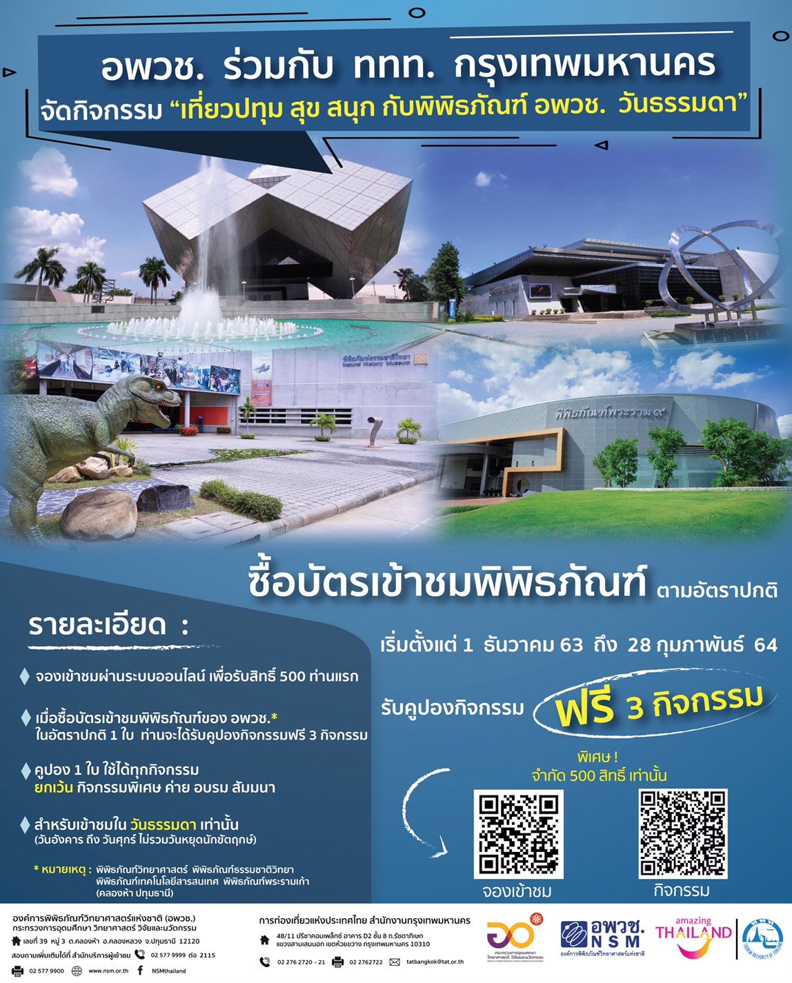 25 พฤศจิกายน 2563 – ปทุมธานี / องค์การพิพิธภัณฑ์วิทยาศาสตร์แห่งชาติ (อพวช.) จับมือ การท่องเที่ยวแห่งประเทศไทย (ททท.) สำนักงานกรุงเทพมหานคร ส่งความพิเศษให้ประชาชนจัดกิจกรรม “เที่ยวปทุม สุข สนุก กับพิพิธภัณฑ์ อพวช. วันธรรมดา” มอบสิทธิ์พิเศษ เพียงซื้อบัตรเข้าชมพิพิธภัณฑ์ในวันธรรมดาของ อพวช. ต.คลองห้า จ.ปทุมธานี รับคูปองร่วมกิจกรรมฟรี 3 กิจกรรม เพื่อส่งเสริมและกระตุ้นการท่องเที่ยวเชิงการเรียนรู้พิพิธภัณฑ์แก่นักท่องเที่ยวในวันธรรมดาเริ่มตั้งแต่เดือน 1 ธันวาคม 2563 – 28 กุมภาพันธ์ 2564