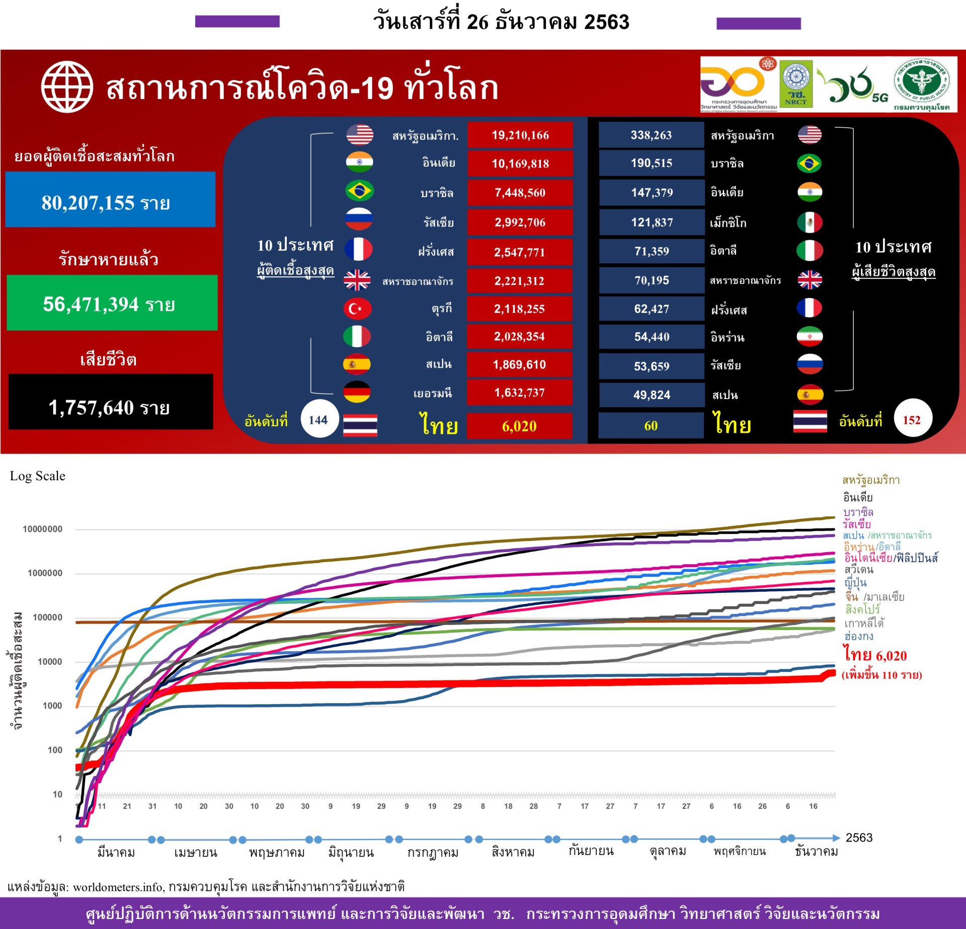 - ยอดผู้ติดเชื้อสะสมทั่วโลกอยู่ที่ 80 ล้านราย โดยมีจำนวนผู้เสียชีวิตสะสมมากกว่า 1.7 ล้านราย
