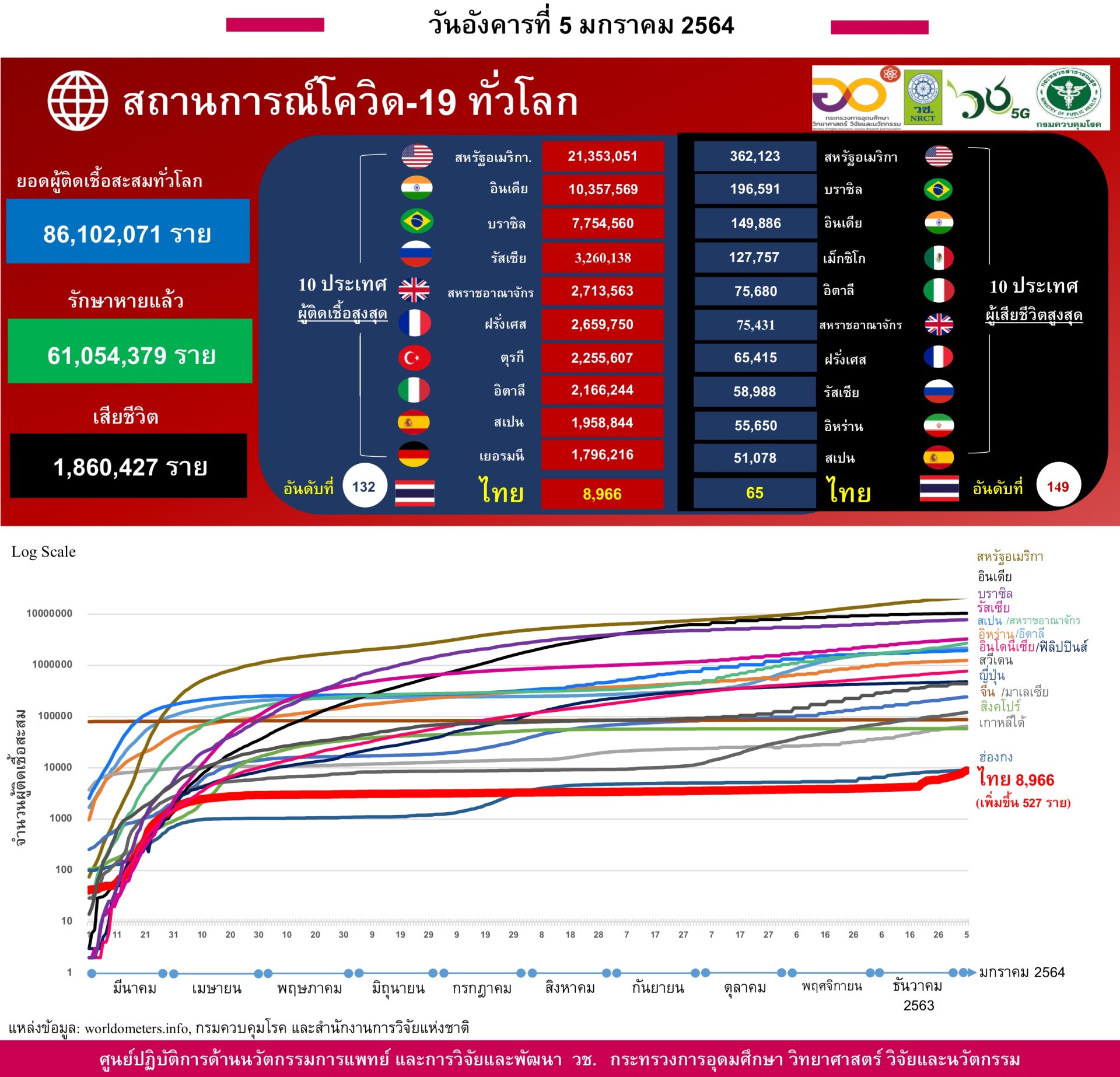 - ยอดผู้ติดเชื้อสะสมทั่วโลกอยู่ที่ 86 ล้านราย "โดยมีจำนวนผู้เสียชีวิตสะสมมากกว่า 1.86 ล้านราย