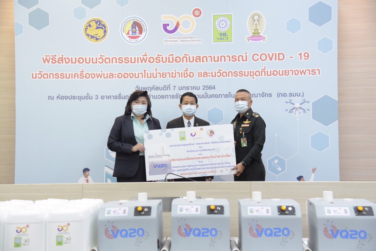 กระทรวงการอุดมศึกษา วิทยาศาสตร์ วิจัยและนวัตกรรม (อว.) โดยสำนักงานการวิจัยแห่งชาติ (วช.) พร้อมด้วยจุฬาลงกรณ์มหาวิทยาลัย ส่งมอบนวัตกรรมเครื่องพ่นละอองนาโนน้ำยาฆ่าเชื้อเพื่อรับมือกับสถานการณ์โควิด-19 ผ่านทางกองอำนวยการรักษาความมั่นคงในราชอาณาจักร (กอ.รมน.) ณ สวนรื่นฤดี กองอำนวยการรักษาความมั่นคงในราชอาณาจักร พร้อมทั้งสาธิตการใช้งานเครื่องพ่นละอองนาโนน้ำยาฆ่าเชื้อ