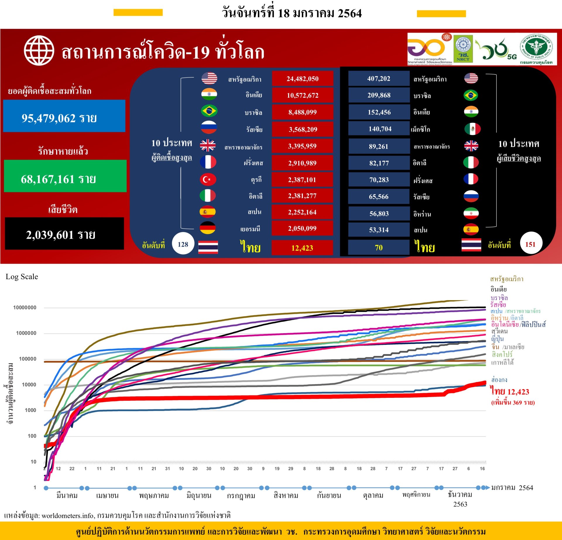 - ยอดผู้ติดเชื้อสะสมทั่วโลก 95 ล้านราย มีจำนวนผู้เสียชีวิตสะสมกว่า 2 ล้านราย