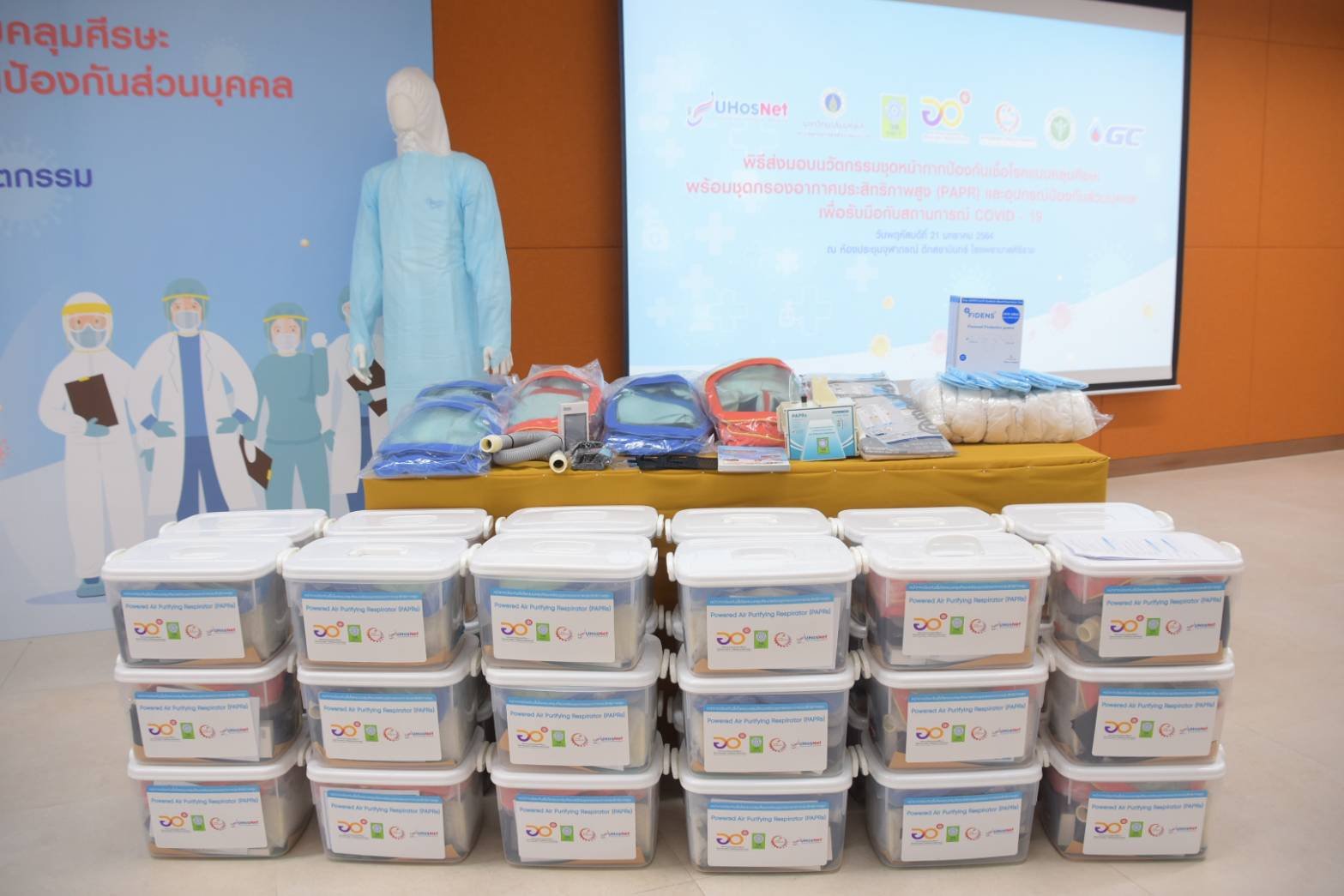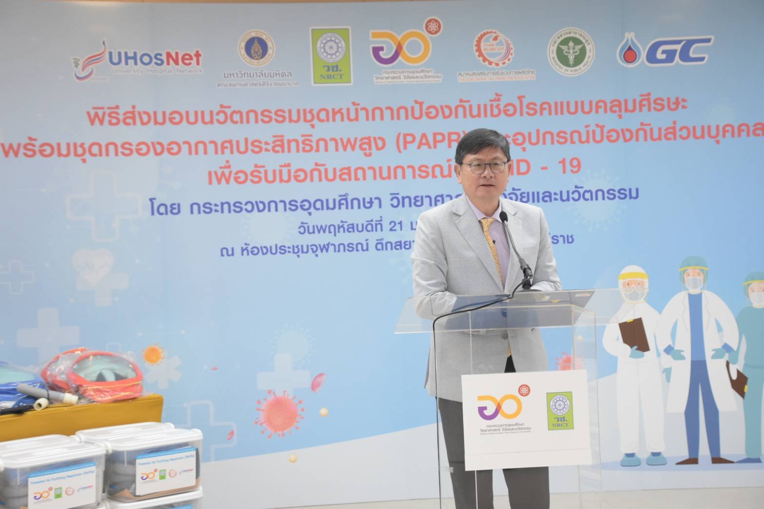 กระทรวงการอุดมศึกษา วิทยาศาสตร์ วิจัยและนวัตกรรม (อว.) ส่งมอบ “ชุดหน้ากากป้องกันเชื้อโรคแบบคลุมศีรษะพร้อมชุดกรองอากาศประสิทธิภาพสูง (PAPR) และอุปกรณ์ป้องกันส่วนบุคคลเพื่อรับมือกับสถานการณ์ COVID – 19” จากผลงานวิจัยที่ได้รับทุนสนับสนุนจากสำนักงานการวิจัยแห่งชาติ (วช.) และผลงานนวัตกรรมจากบริษัท พีทีที โกลบอล เคมิคอล จำกัด (มหาชน) “อุปกรณ์ป้องกันส่วนบุคคลเพื่อรับมือกับสถานการณ์ COVID – 19” ให้แก่เครือข่ายโรงพยาบาลกลุ่มสถาบันแพทยศาสตร์แห่งประเทศไทย (UHosNet) และกระทรวงสาธารณสุขรับมือการระบาดของไวรัสโคโรนาสายพันธุ์ใหม่ 2019
