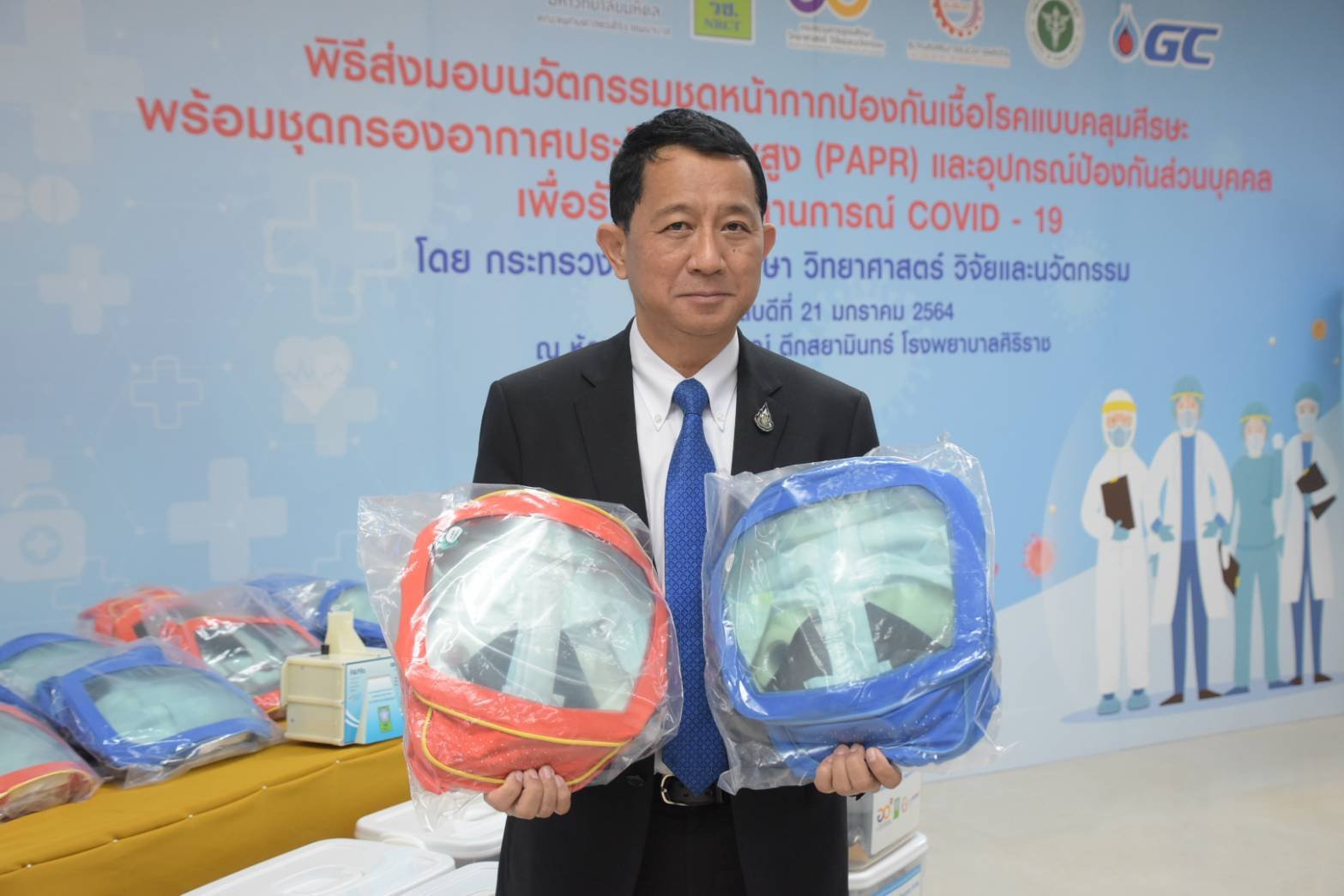 ศ.พิเศษ ดร.เอนก เหล่าธรรมทัศน์ รัฐมนตรีว่าการกระทรวงการอุดมศึกษา วิทยาศาสตร์ วิจัย และนวัตกรรม เป็นประธานส่งมอบ “ชุดหน้ากากป้องกันเชื้อโรคแบบคลุมศีรษะพร้อมชุดกรองอากาศประสิทธิภาพสูง (PAPR) เพื่อรับมือกับสถานการณ์ COVID – 19” ผลงานวิจัยที่ได้รับทุนสนับสนุนจากสำนักงานการวิจัยแห่งชาติ (วช.) และผลงานนวัตกรรมจากบริษัท พีทีที โกลบอล เคมิคอล จำกัด (มหาชน) “อุปกรณ์ป้องกันส่วนบุคคลเพื่อรับมือกับสถานการณ์ COVID –. 19” ผลงานวิจัยที่ได้รับทุนสนับสนุนจากสำนักงานการวิจัยแห่งชาติ (วช.) และผลงานนวัตกรรมจากบริษัท พีทีที โกลบอล เคมิคอล จำกัด (มหาชน) “อุปกรณ์ป้องกันส่วนบุคคลเพื่อรับมือกับสถานการณ์ COVID – 19” ให้แก่เครือข่ายโรงพยาบาลกลุ่มสถาบันแพทยศาสตร์แห่งประเทศไทย (UHosNet) และกระทรวงสาธารณสุข เมื่อวันที่ 21 มกราคม 2564 ณ ห้องจุฬาภรณ์ ตึกสยามินทร์ โรงพยาบาลศิริราช โดยมี รศ.นพ.วิศิษฎ์ วามวาณิชย์ ผู้อำนวยการโรงพยาบาลศิริราช กล่าวต้อนรับ