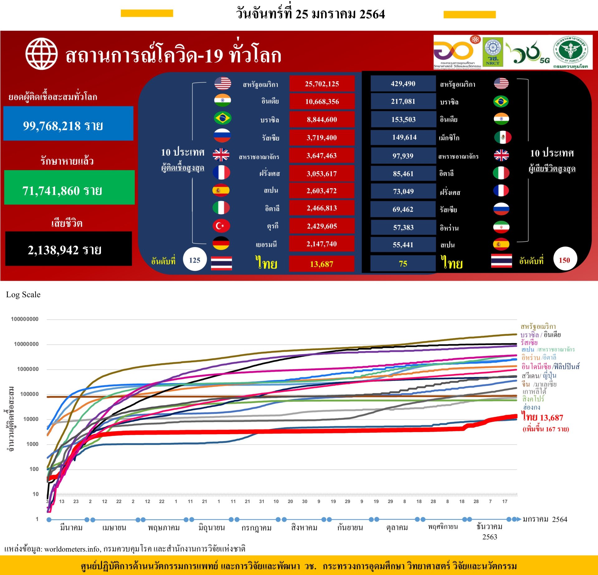- ยอดผู้ติดเชื้อสะสมทั่วโลก 99.7 ล้านราย มีจำนวนผู้เสียชีวิตสะสมกว่า 2 ล้านราย