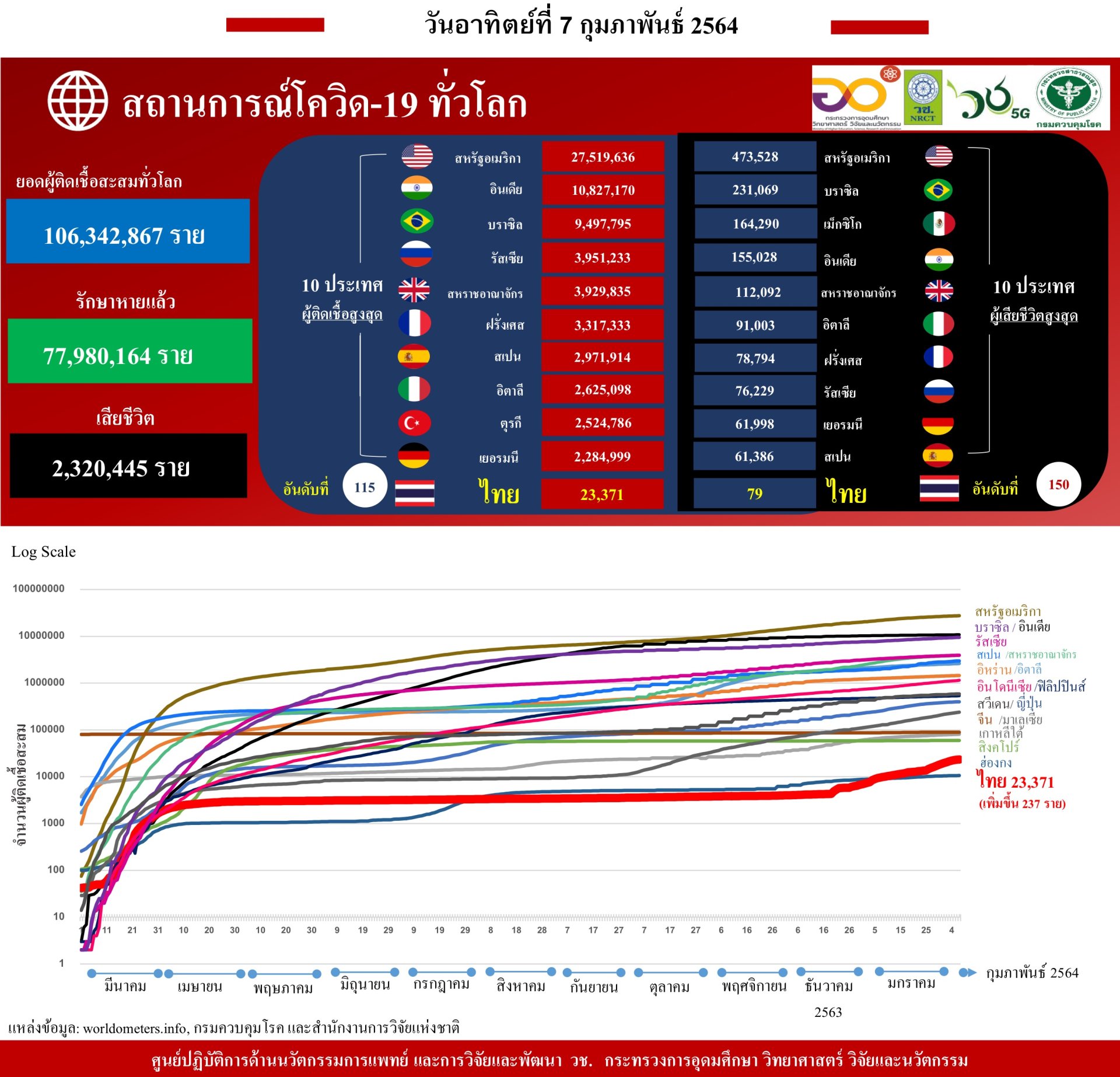- ยอดผู้ติดเชื้อสะสมทั่วโลก 106 ล้านราย มีจำนวนผู้เสียชีวิตสะสมกว่า 2.3 ล้านราย