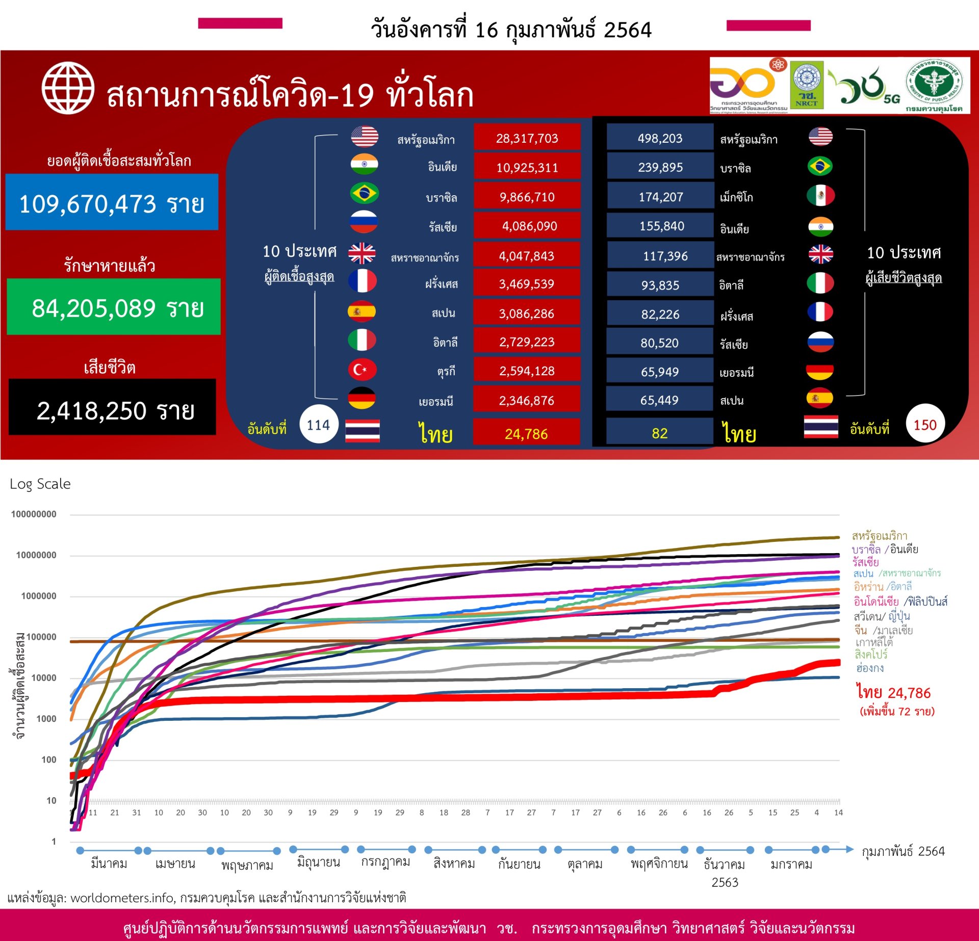 - ยอดผู้ติดเชื้อสะสมทั่วโลก 109 ล้านราย มีจำนวนผู้เสียชีวิตสะสมกว่า 2.4 ล้านราย
