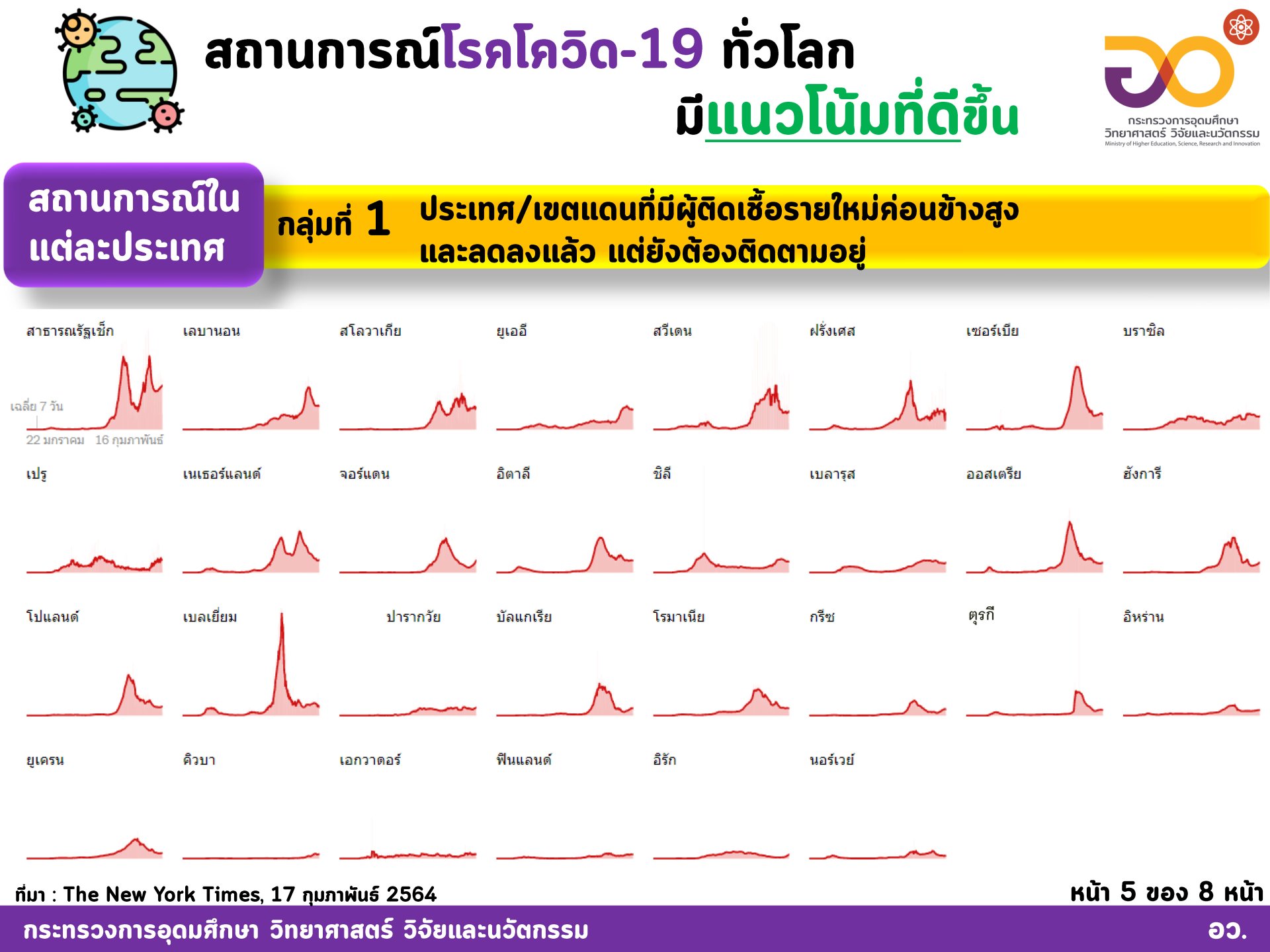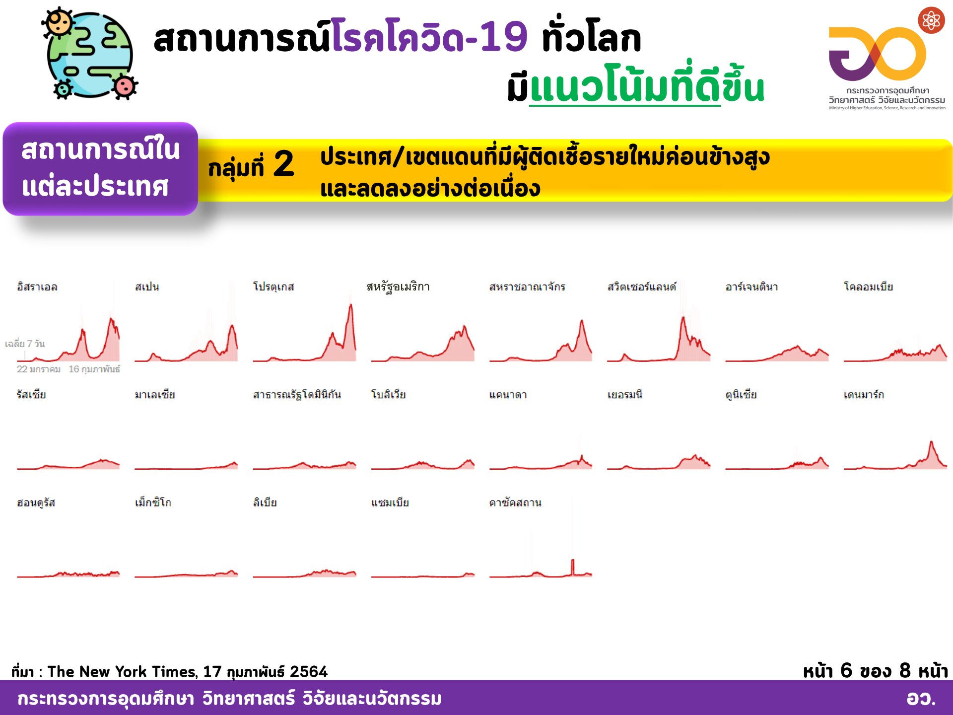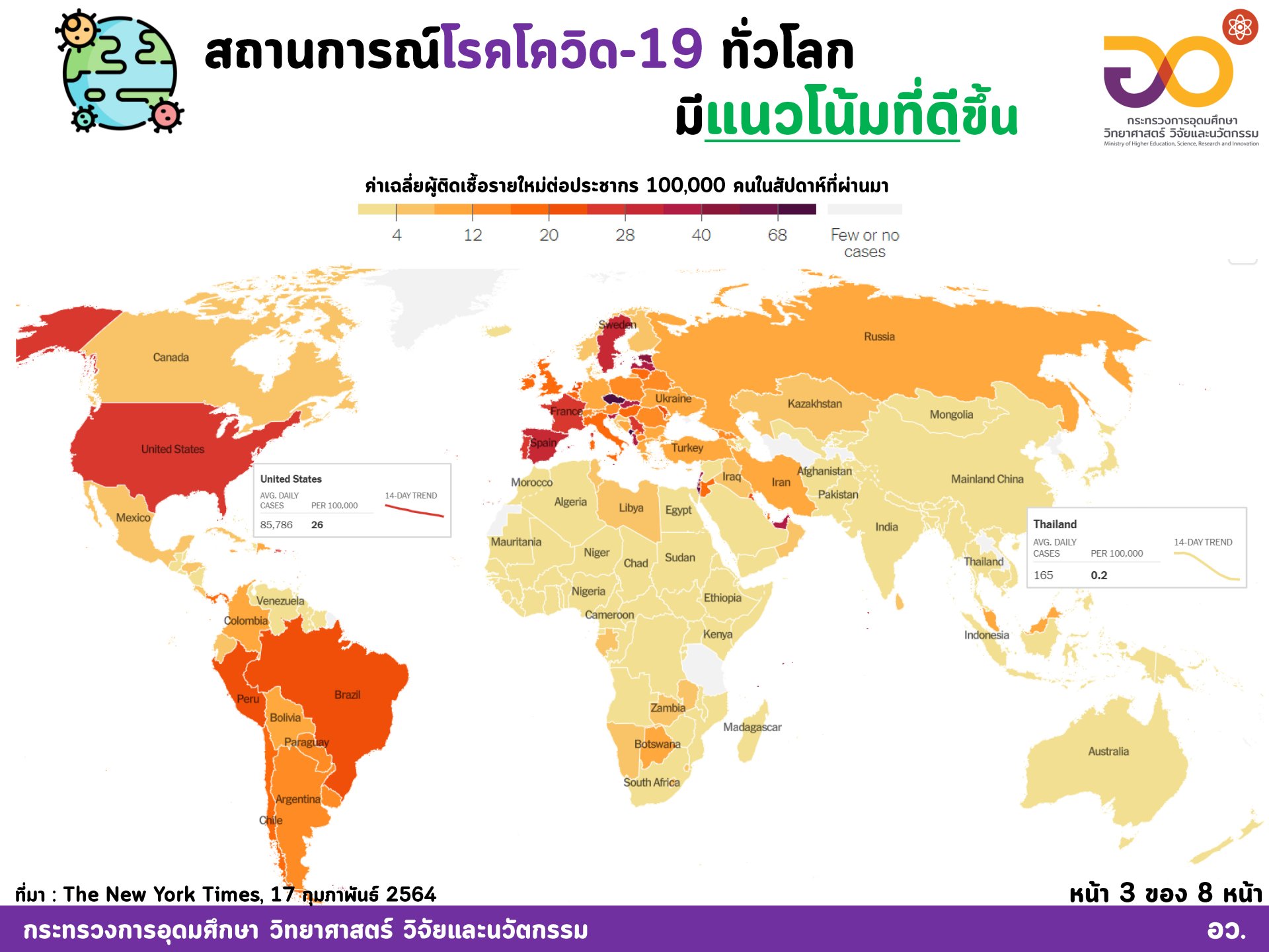 (17 กุมภาพันธ์ 2564) ศาสตราจารย์ ดร. นายแพทย์สิริฤกษ์ ทรงศิวิไล ปลัดกระทรวงการอุดมศึกษา วิทยาศาสตร์ วิจัยและนวัตกรรม (อว.) เปิดเผยผลการประมวลข้อมูลเกี่ยวกับสถานการณ์การระบาดของโรคโควิด-19 ทั่วโลกว่า มีสัญญาณดีขึ้นอย่างต่อเนื่อง จำนวนผู้ติดเชื้อรายใหม่ทั่วโลกได้ลดลงติดต่อกัน 5 สัปดาห์แล้ว โดยยอดผู้ติดเชื้อรายใหม่ในรอบ 14 วันที่ผ่านมาได้ลดลงกว่า 28% ในขณะที่จำนวนผู้เสียชีวิตต่อวันลดลงถึง 20%