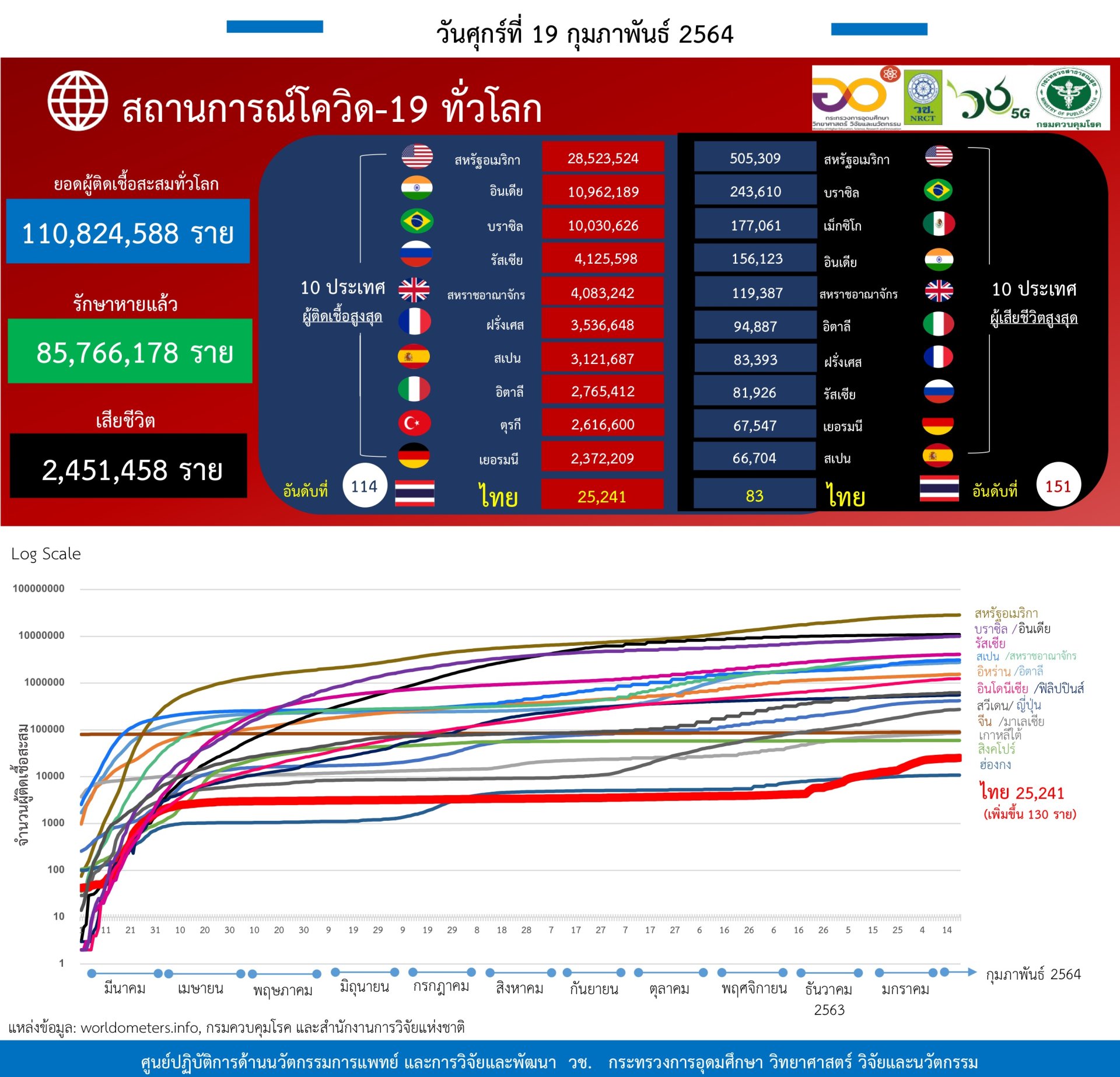- ยอดผู้ติดเชื้อสะสมทั่วโลก 110 ล้านราย มีจำนวนผู้เสียชีวิตสะสมกว่า 2.4 ล้านราย