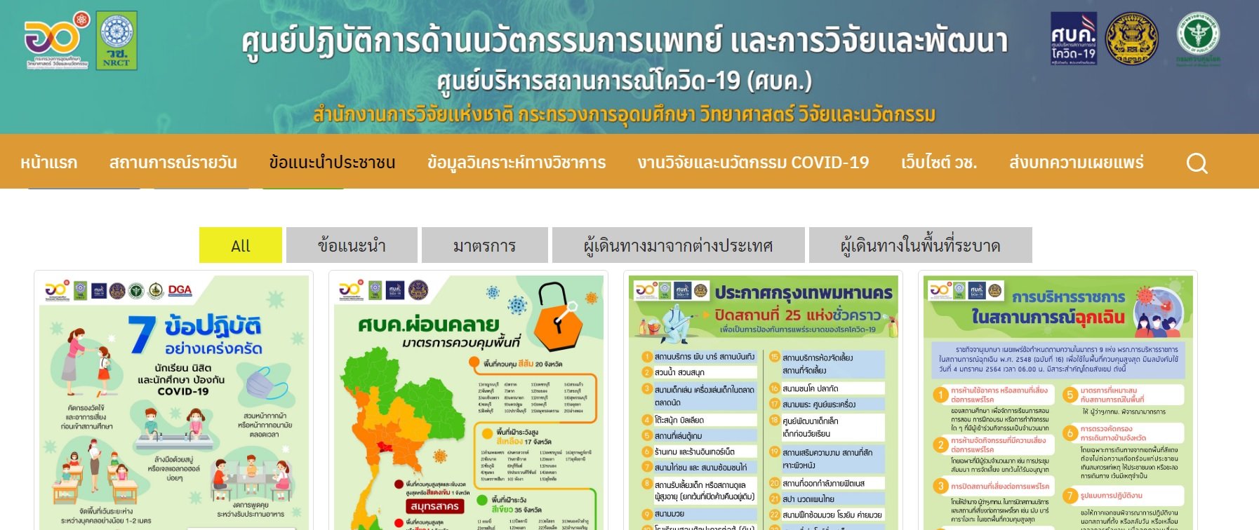 1) ศูนย์ปฏิบัติการด้านนวัตกรรมการแพทย์ และการวิจัยและพัฒนา วช. ได้รับมอบหมายให้รับผิดชอบในส่วนที่เกี่ยวกับนวัตกรรมทางการแพทย์ การวิจัยและการพัฒนา เพื่อสนับสนุนในการแก้ไขสถานการณ์การแพร่ระบาดของโรคโควิด-19 โดยใช้ข้อมูลทางวิชาการการวิจัยและนวัตกรรม มีการผลิตข้อมูลและภาพอินโฟกราฟิกสถานการณ์รายวัน ข้อมูลแนะนำประชาชน ข้อมูลวิเคราะห์ทางวิชาการ และรวมรวบรวมผลงานวิจัยและนวัตกรรม COVID-19 เผยแพร่ในสื่อต่าง ๆ