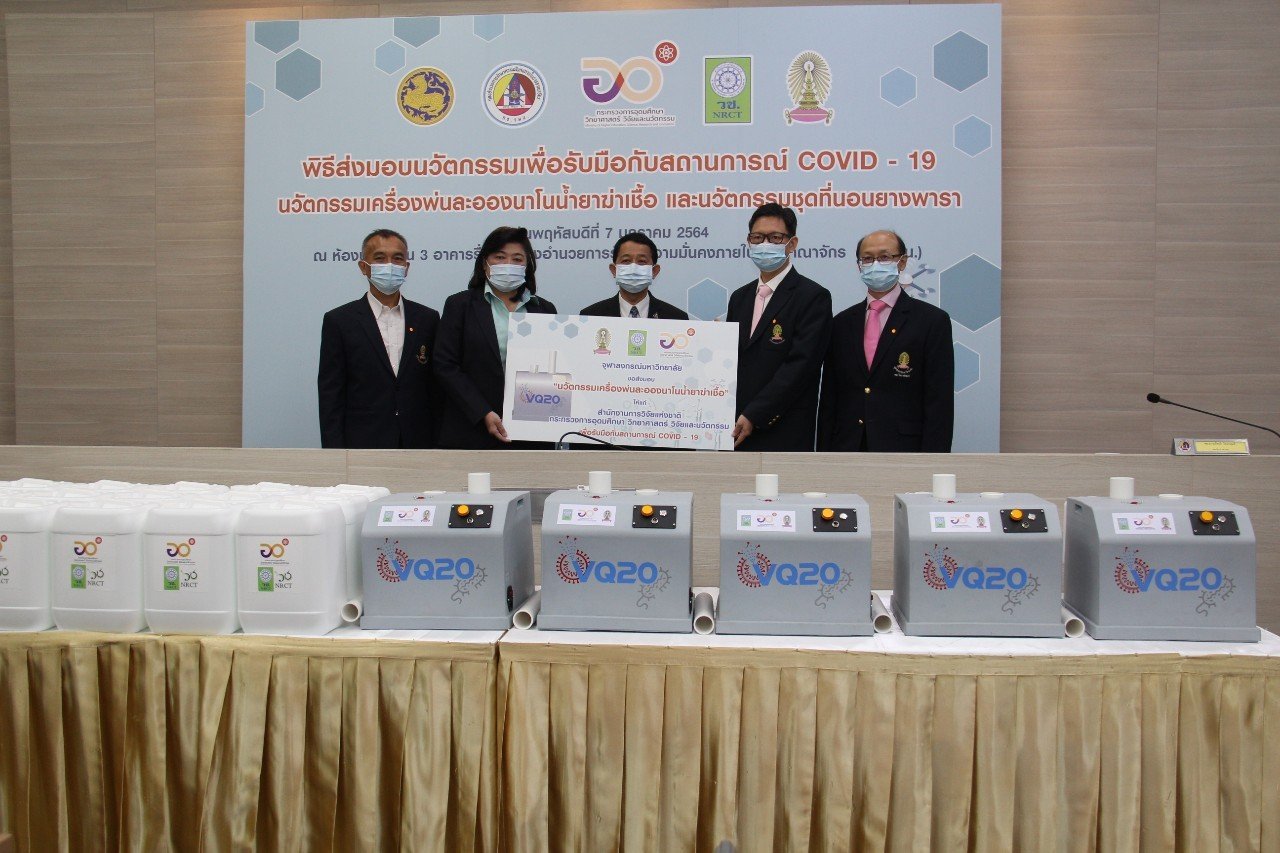 - นวัตกรรมเครื่องพ่นละอองนาโนน้ำยาฆ่าเชื้อ แก่ กองอำนวยการรักษาความมั่นคงในราชอาณาจักร (กอ.รมน.) และนวัตกรรมชุดที่นอนยางพาราเพื่อรับมือกับสถานการณ์ COVID–19 ให้แก่ ศูนย์บริหารสถานการณ์โควิด-19 กระทรวงมหาดไทย