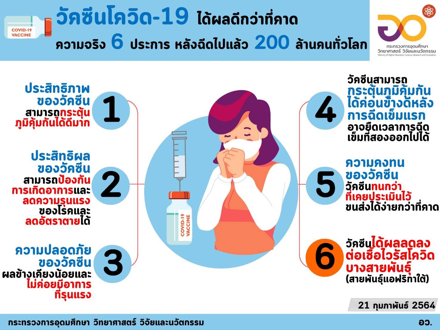 ศาสตราจารย์ ดร. นายแพทย์สิริฤกษ์ ทรงศิวิไล ปลัดกระทรวงการอุดมศึกษา วิทยาศาสตร์ วิจัยและนวัตกรรม (อว.) เผยว่าเมื่อมีการฉีดวัคซีนโควิด-19 ทั่วโลกได้เกินกว่า 200 ล้านโดสในเวลา 2 เดือนนั้น มีการเก็บข้อมูลโดยละเอียดในมิติต่างๆ ทำให้ทราบผลการใช้งานในสถานการณ์จริงพบว่า "ประสิทธิภาพ ประสิทธิผล และความปลอดภัยของวัคซีน ดีกว่าที่คาด"