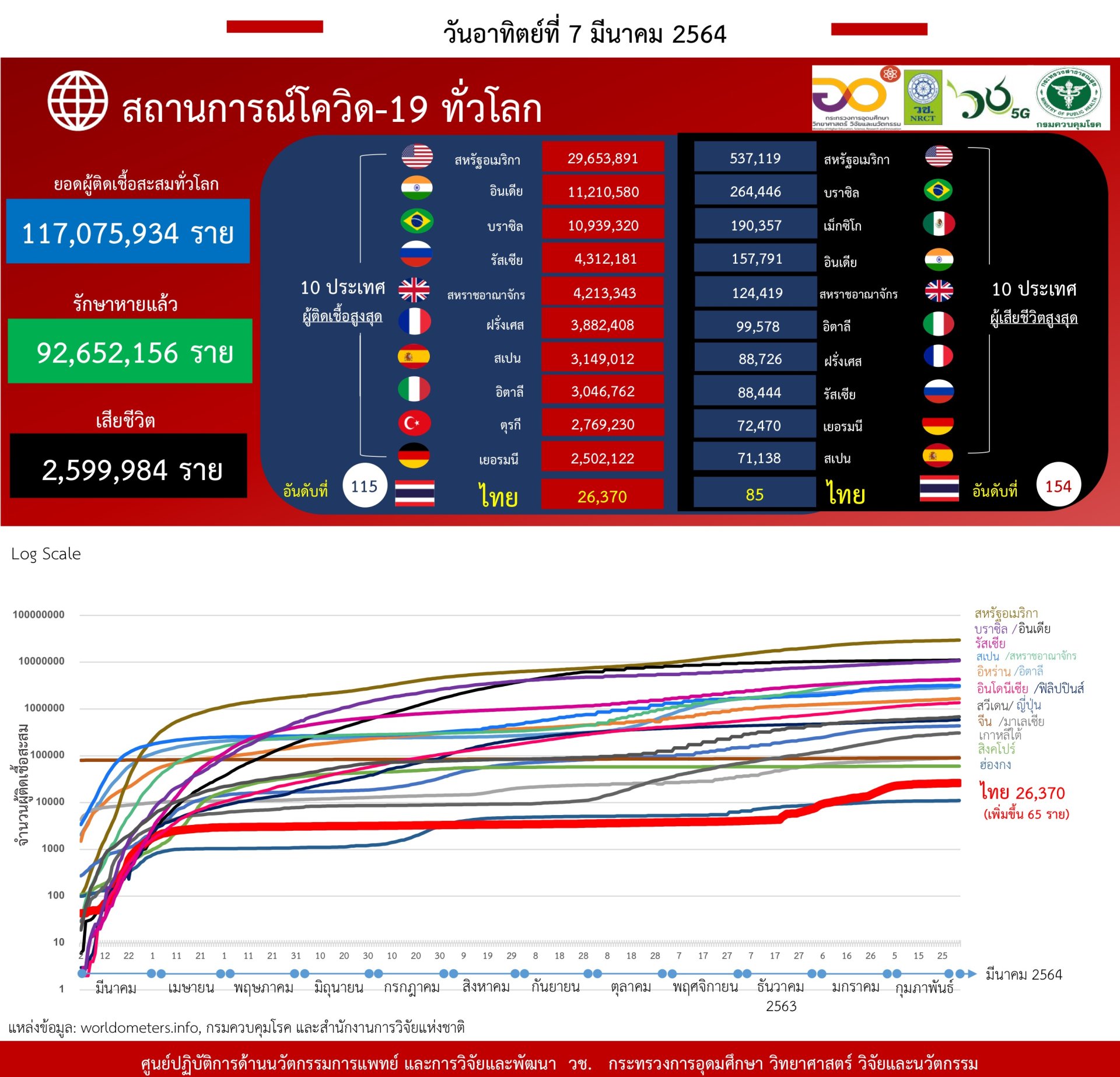 - ยอดผู้ติดเชื้อสะสมทั่วโลก 117 ล้านราย มีจำนวนผู้เสียชีวิตสะสมกว่า 2.59 ล้านราย