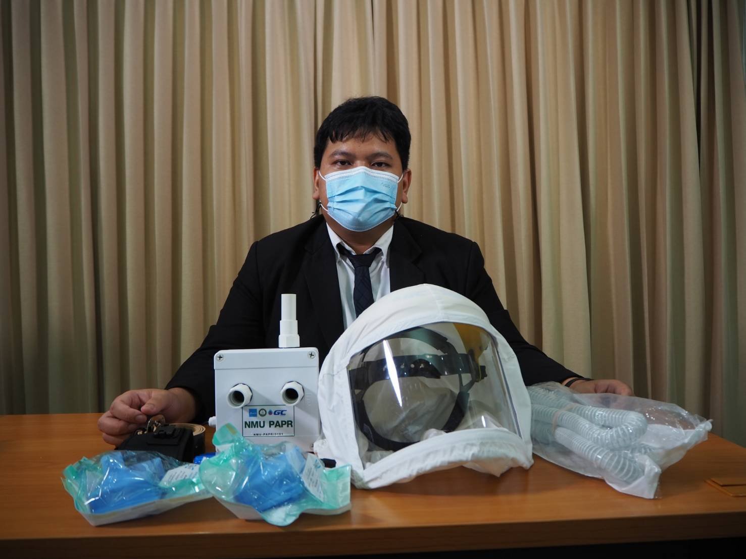 อ.พงศธร ชมดี ตัวแทนทีมวิจัยภาควิชาเทคโนโลยี วิทยาลัยชุมชนเมือง มหาวิทยาลัยนวมินทราธิราช อธิบายว่าหน้ากากป้องกันเชื้อโรคแบบคลุมศีรษะชนิดมีพัดลมพร้อมชุดกรองอากาศประสิทธิภาพสูงหรือหน้ากาก PAPR ที่พัฒนาขึ้นมานั้น มี 2 รูปแบบ รูปแบบแรกที่พัฒนาขึ้นมาก่อนประยุกต์ใช้หมวกนิรภัยสำหรับอุตสาหกรรม มีพัดลมและชุดกรองอากาศที่เป่าลมเข้าไปในหมวกเพื่อให้แรงดันในหมวกเป็นบวกเป็นไปตามมาตรฐาน ซึ่งช่วยป้องกันอากาศจากภายนอกเข้าไปในหมวก ใช้พลังงานจากแบตเตอรีสำรองไฟหรือพาวเวอร์แบงก์ ซึ่งใช้งานได้นาน 4 - 6 ชั่วโมง จากนั้นได้พัฒนาอีกรูปแบบที่ประยุกต์หน้ากากดำน้ำมาใช้ โดยมีหลักการทำงานคล้ายกัน แตกต่างเพียงขนาดและความคล่องตัวในการใช้งาน