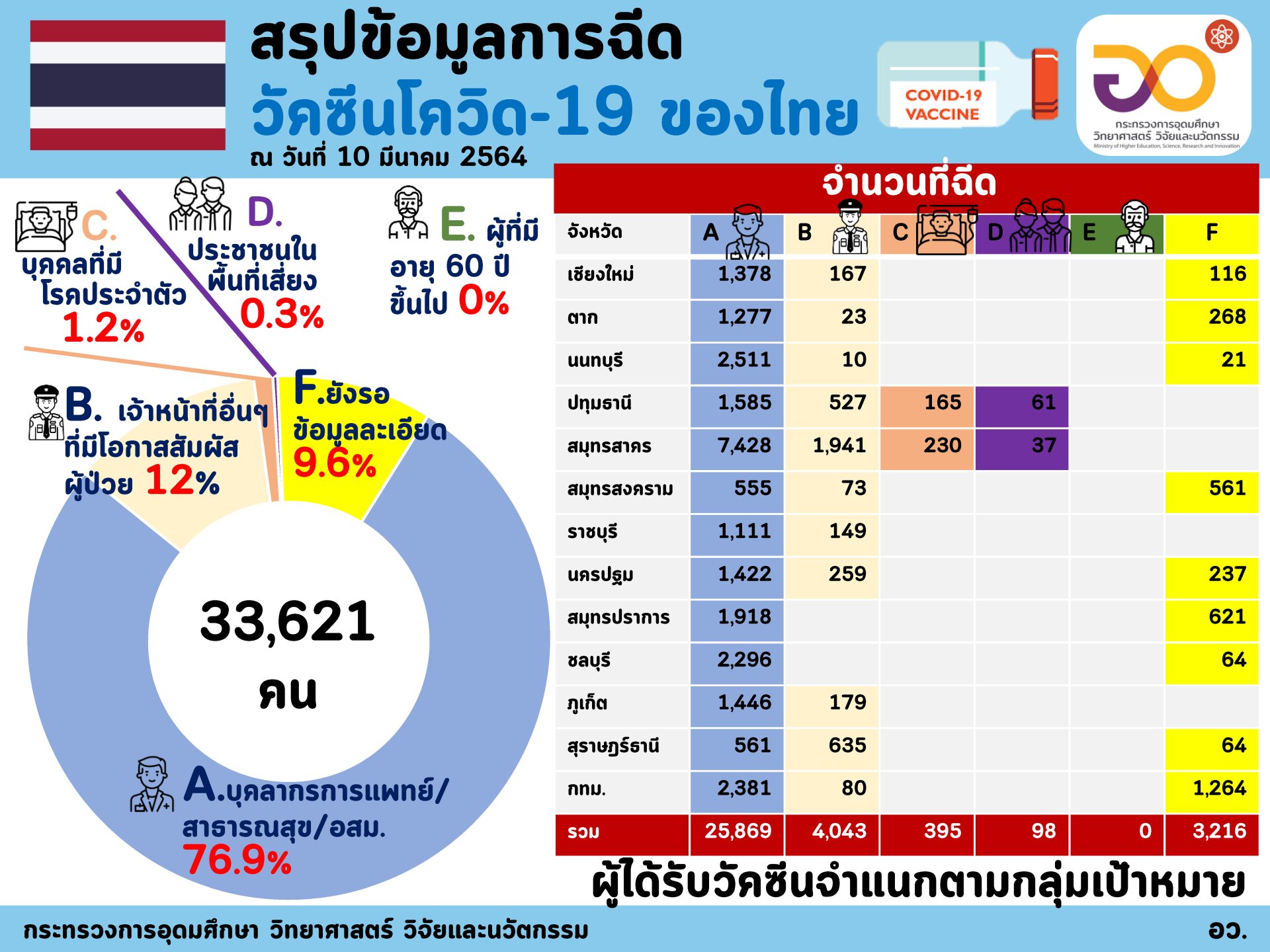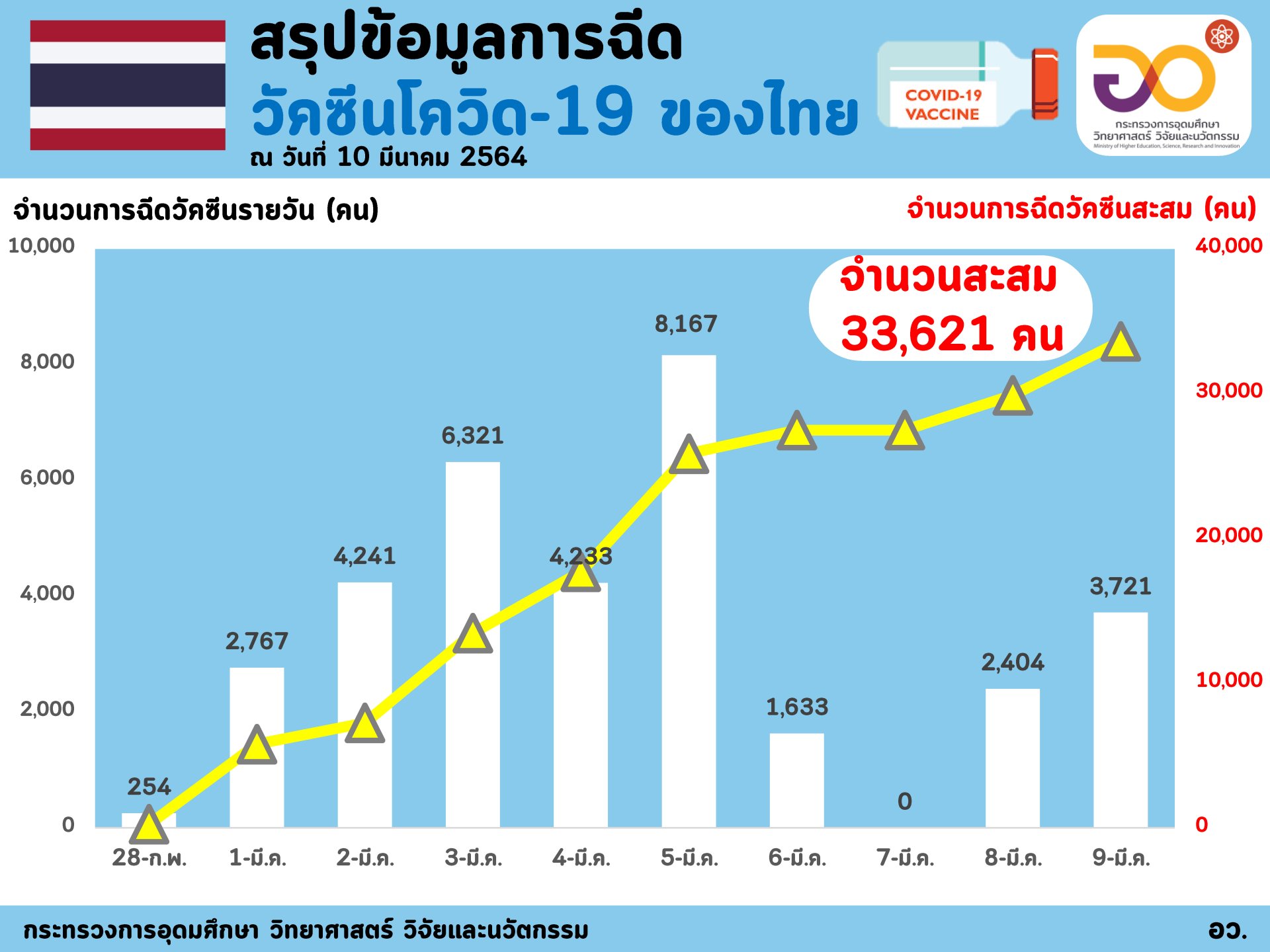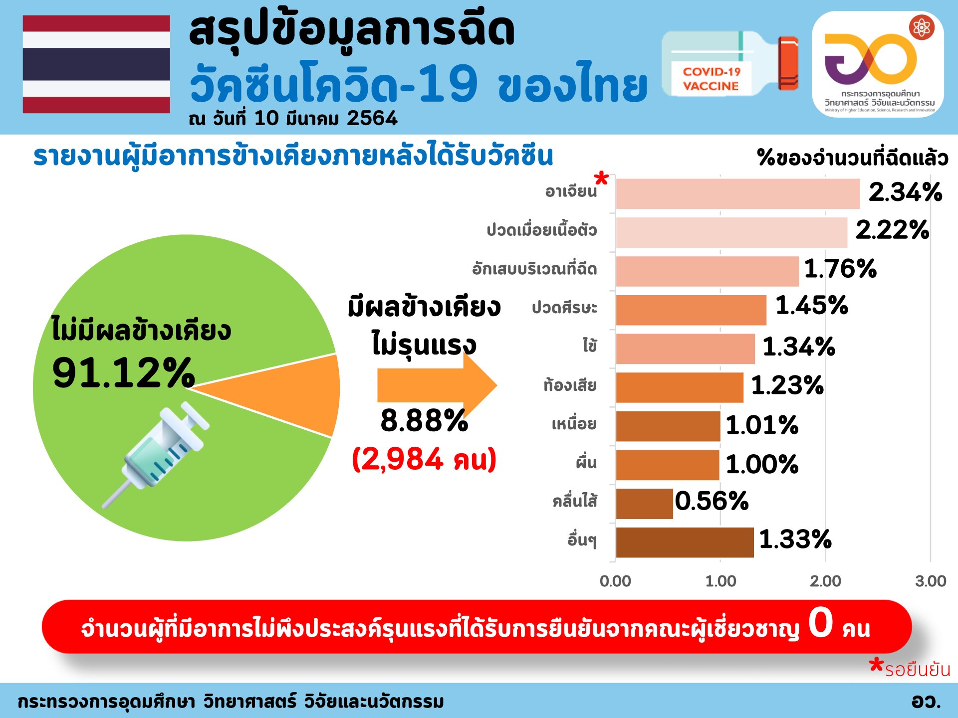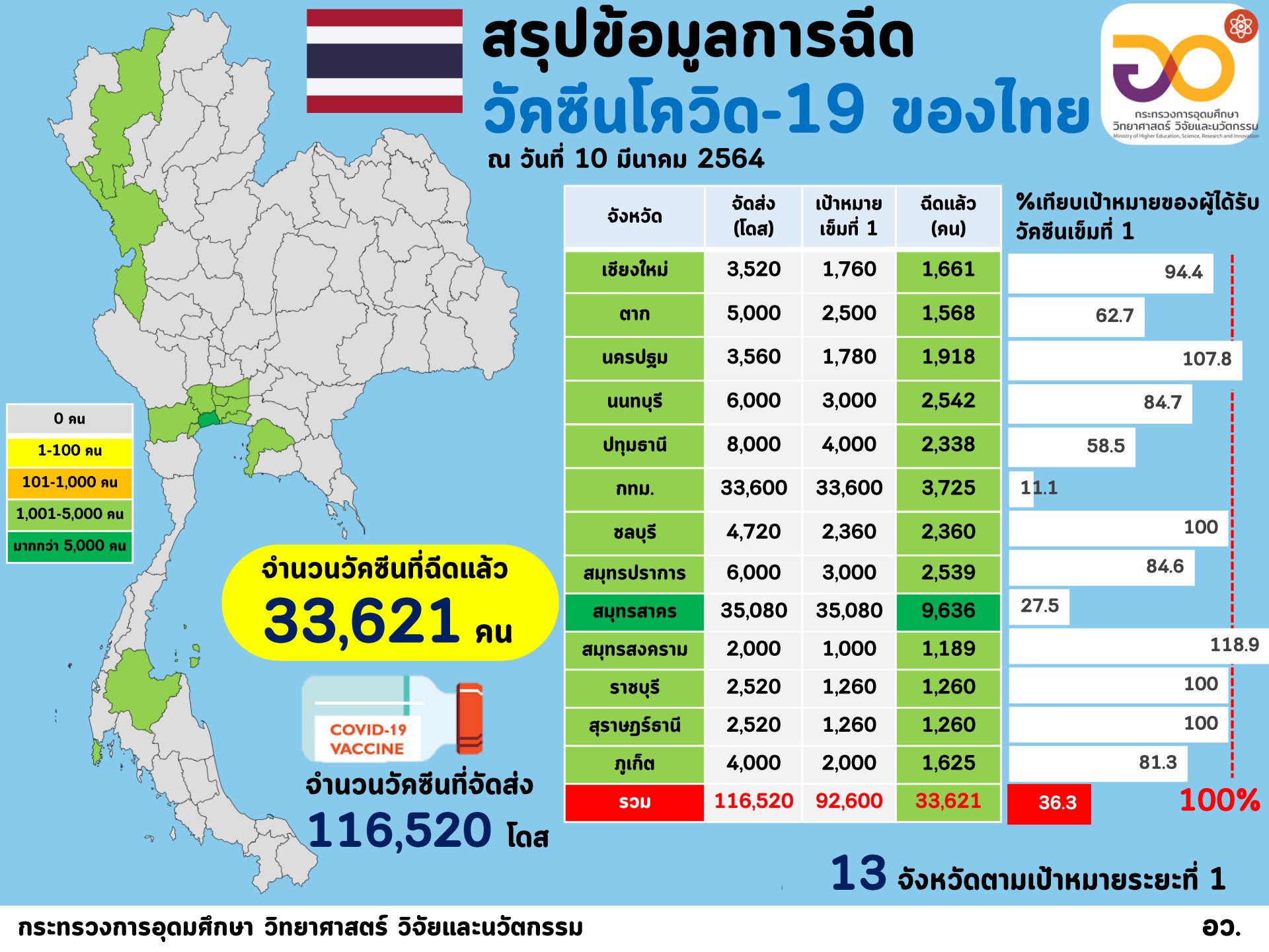 (10 มีนาคม 2564) ศาสตราจารย์ ดร. นายแพทย์สิริฤกษ์ ทรงศิวิไล ปลัดกระทรวงการอุดมศึกษา วิทยาศาสตร์ วิจัยและนวัตกรรม (อว.) รายงานว่า กระทรวง อว. ได้ร่วมกับกระทรวงสาธารณสุข ติดตามและประมวลผลการฉีดวัคซีนโควิด-19 ในคนไทยในเชิงรุก โดยสรุปว่า "ขณะนี้ประเทศไทยได้ฉีดวัคซีนโควิด-19 แล้ว จำนวน 33,621 คน ใน 13 จังหวัด ทั้งหมดเป็นวัคซีนของซิโนแวค ผู้ได้รับวัคซีนในระยะแรกนี้ส่วนใหญ่ (76.9%) เป็นบุคลากรการแพทย์/สาธารณสุข/อสม. โดยจังหวัดสมุทรสาครฉีดวัคซีนแล้วจำนวนมากที่สุด ตามด้วยกรุงเทพมหานคร สมุทรปราการ นนทบุรี ชลบุรี ทั้งนี้ผู้ที่ได้รับวัคซีนมากกว่า 91% ไม่มีผลข้างเคียง โดยพบผลข้างเคียงใน 8.88% ของผู้ได้รับวัคซีน แต่อาการไม่รุนแรง"