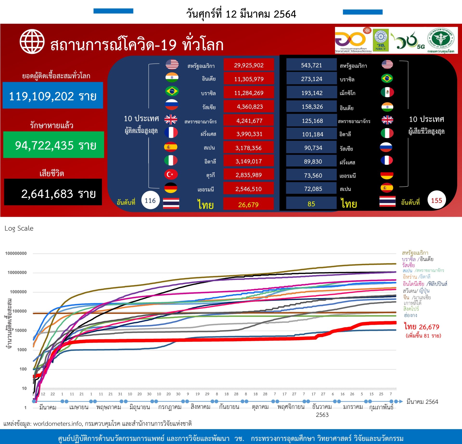 - ยอดผู้ติดเชื้อสะสมทั่วโลก 119 ล้านราย มีจำนวนผู้เสียชีวิตสะสมกว่า 2.6 ล้านราย