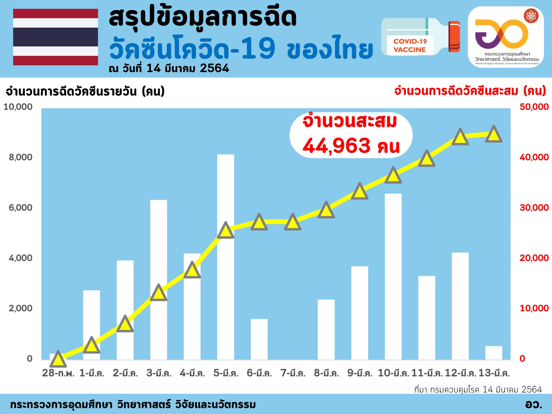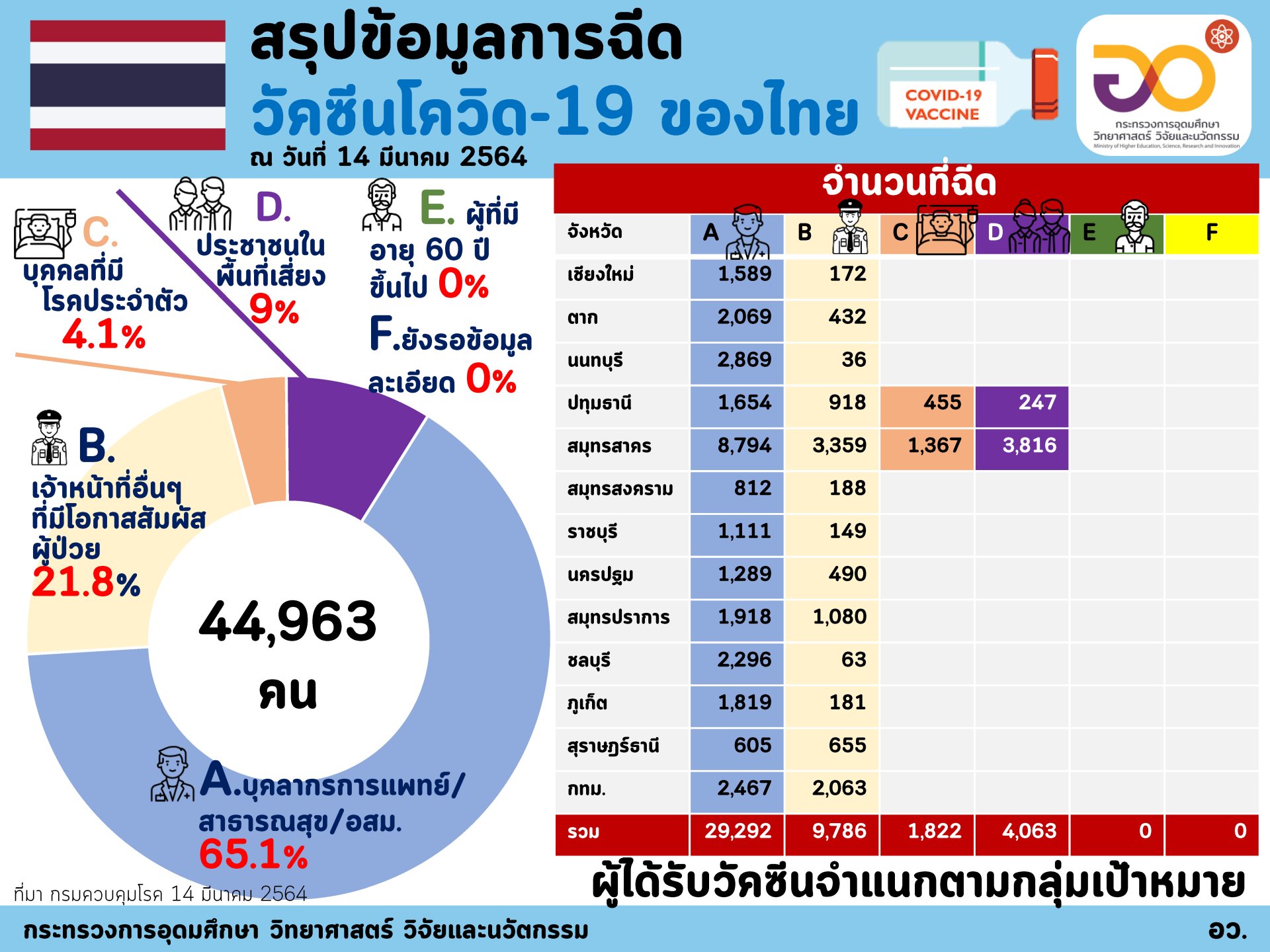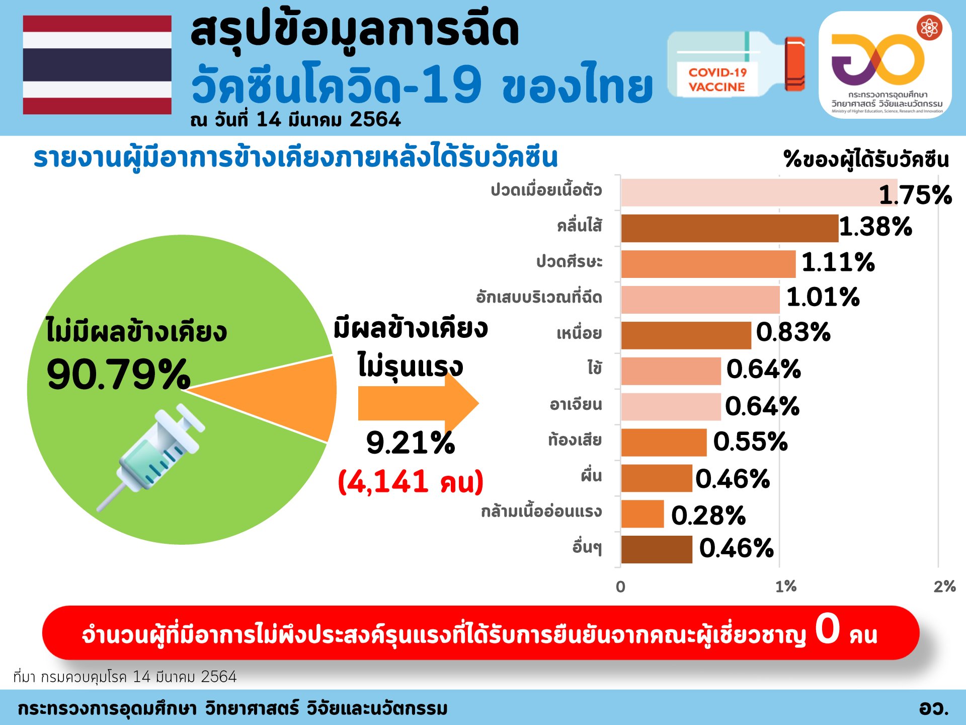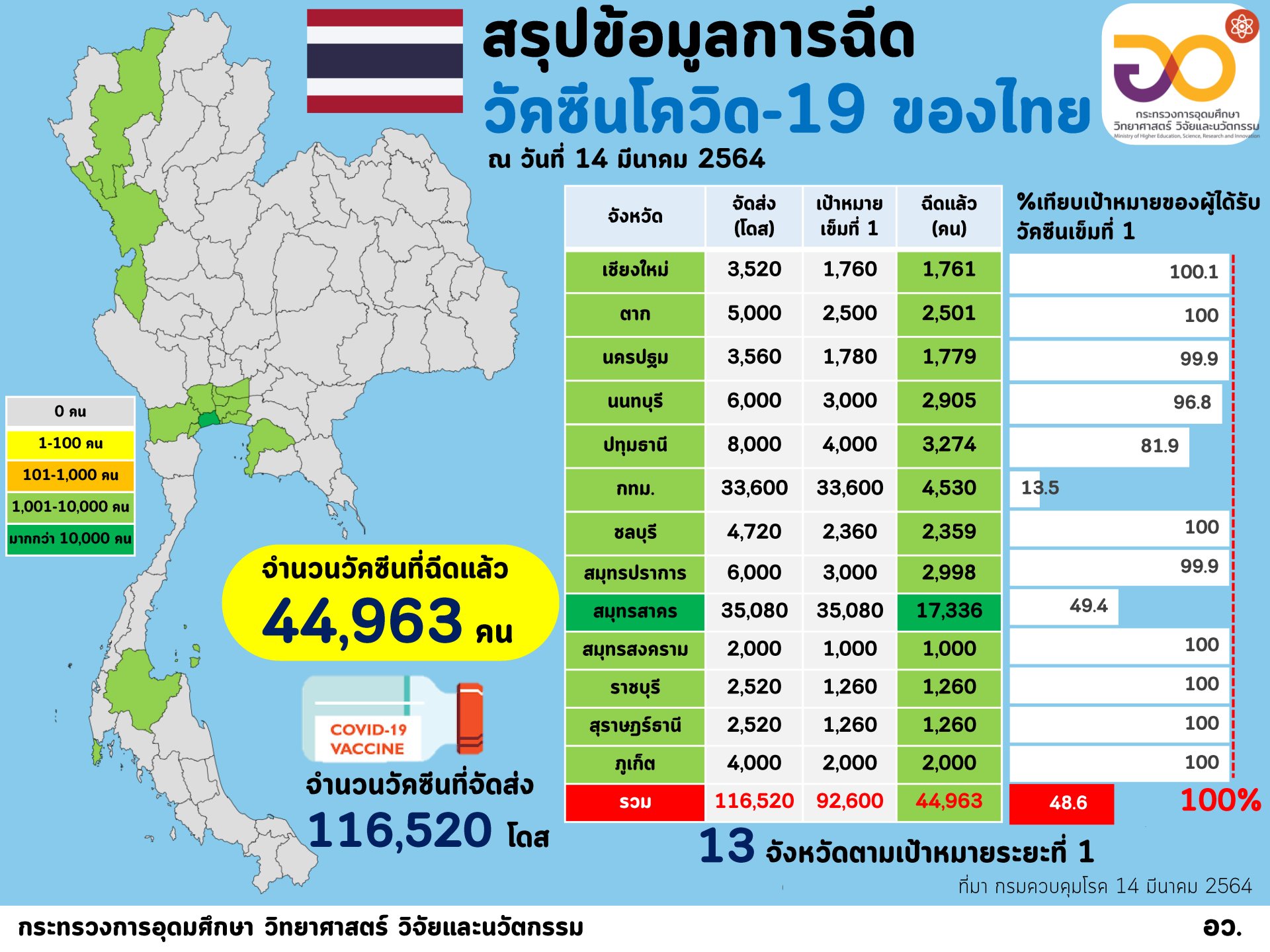 ศาสตราจารย์ ดร. นายแพทย์สิริฤกษ์ ทรงศิวิไล ปลัดกระทรวงการอุดมศึกษา วิทยาศาสตร์ วิจัยและนวัตกรรม (อว.) รายงานว่า กระทรวง อว. ได้ร่วมกับกระทรวงสาธารณสุข ติดตามและประมวลผลการฉีดวัคซีนโควิด-19 ในคนไทยหลังฉีดแล้ว 2 สัปดาห์ โดยสรุปว่า "ขณะนี้ประเทศไทยได้ฉีดวัคซีนโควิด-19 แล้ว จำนวน 44,963 คน ใน 13 จังหวัด ทั้งหมดเป็นวัคซีนของซิโนแวคตามแผนระยะที่ 1