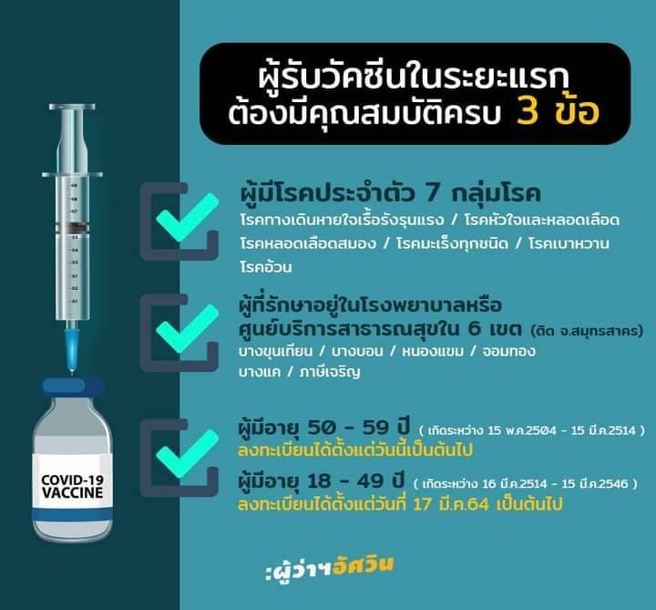 - ผู้มีอายุระหว่าง 18-49 ปี (เกิดระหว่างวันที่ 16 มี.ค 2514 - 15 มี.ค. 2546) เริ่มลงทะเบียนตั้งแต่วันที่ 17 มี.ค.นี้ โดยกลุ่มนี้จะได้รับวัคซีนในลำดับถัดไป