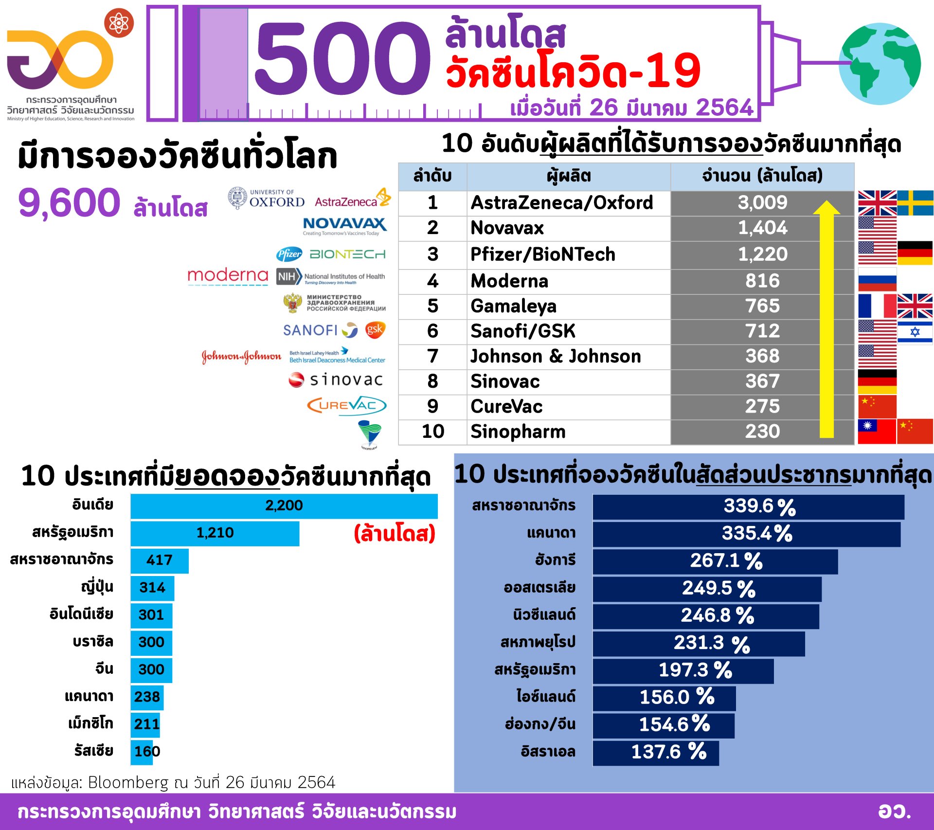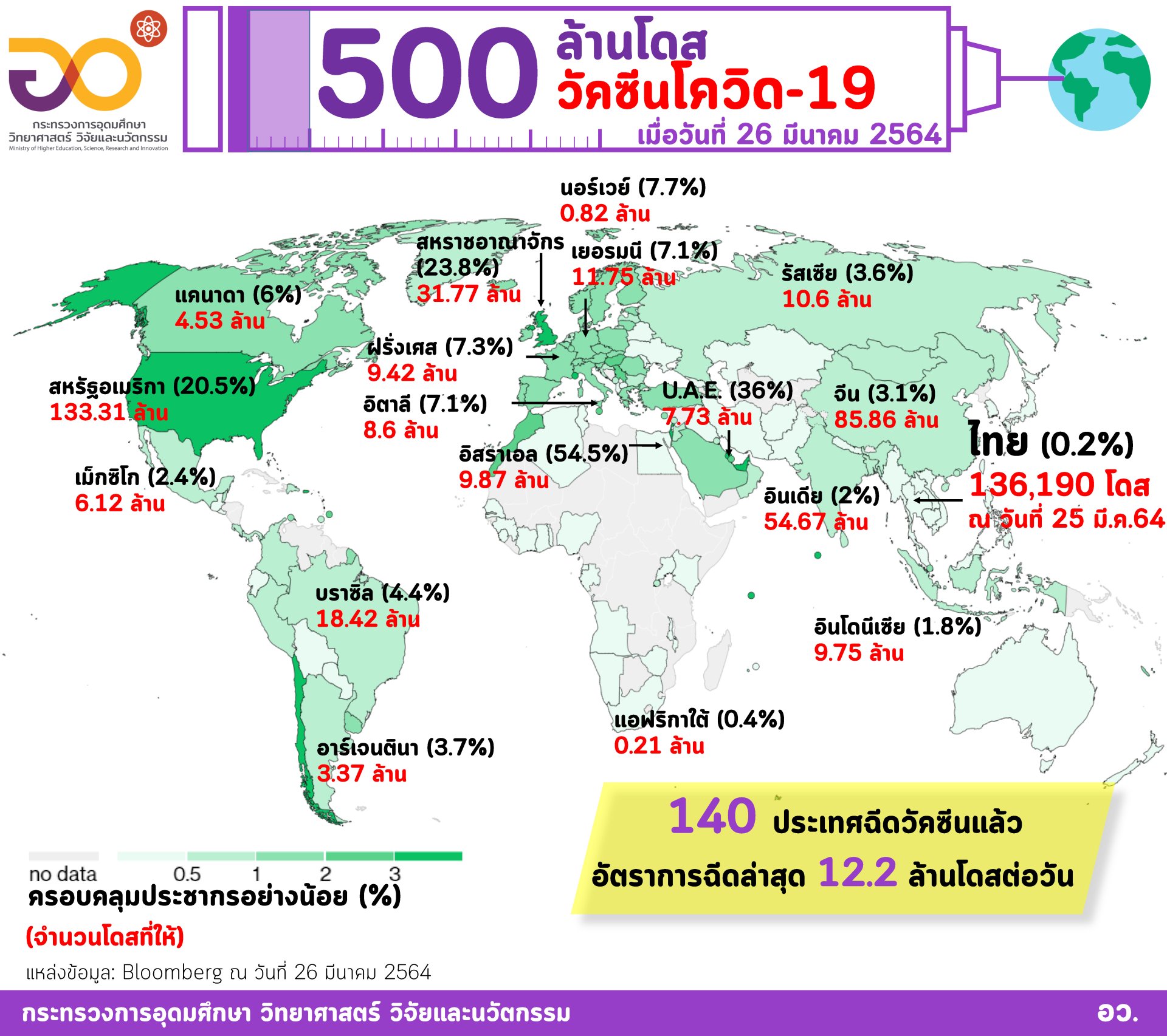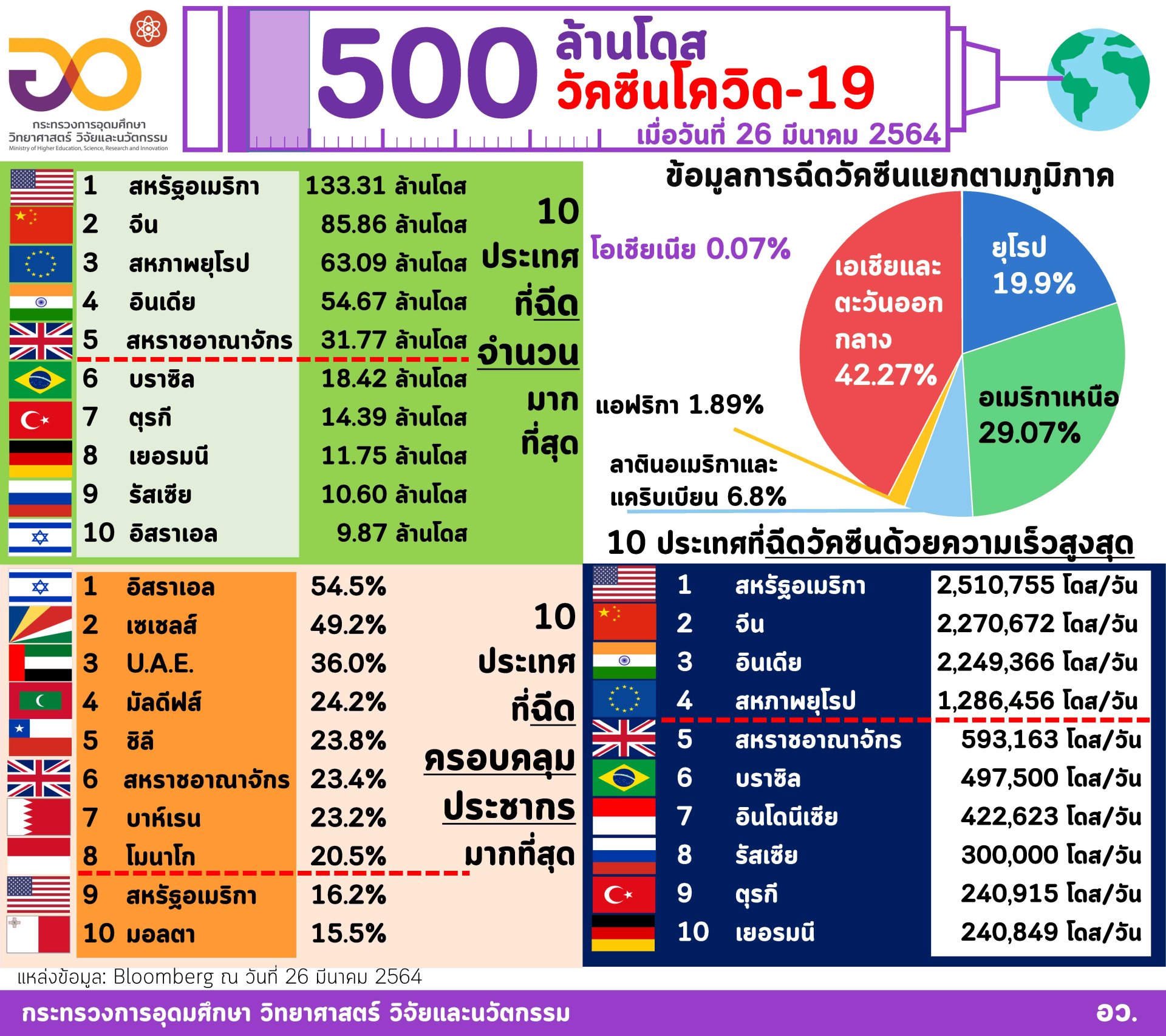 (26 มีนาคม 2564) ศาสตราจารย์ ดร. นายแพทย์สิริฤกษ์ ทรงศิวิไล ปลัดกระทรวงการอุดมศึกษา วิทยาศาสตร์ วิจัยและนวัตกรรม (อว.) เผยว่า "ขณะนี้จำนวนการฉีดวัคซีนโควิด-19 ทั่วโลก เกินกว่า 500 ล้านโดสแล้ว ใน 140 ประเทศ/เขตปกครอง ใช้เวลาเพียง 108 วัน และความเร็วในการฉีดรวดเร็วมากขึ้นอย่างต่อเนื่อง โดย 100 ล้านโดสหลังนี้ ใช้เวลาเพียง 8 วันเท่านั้น”