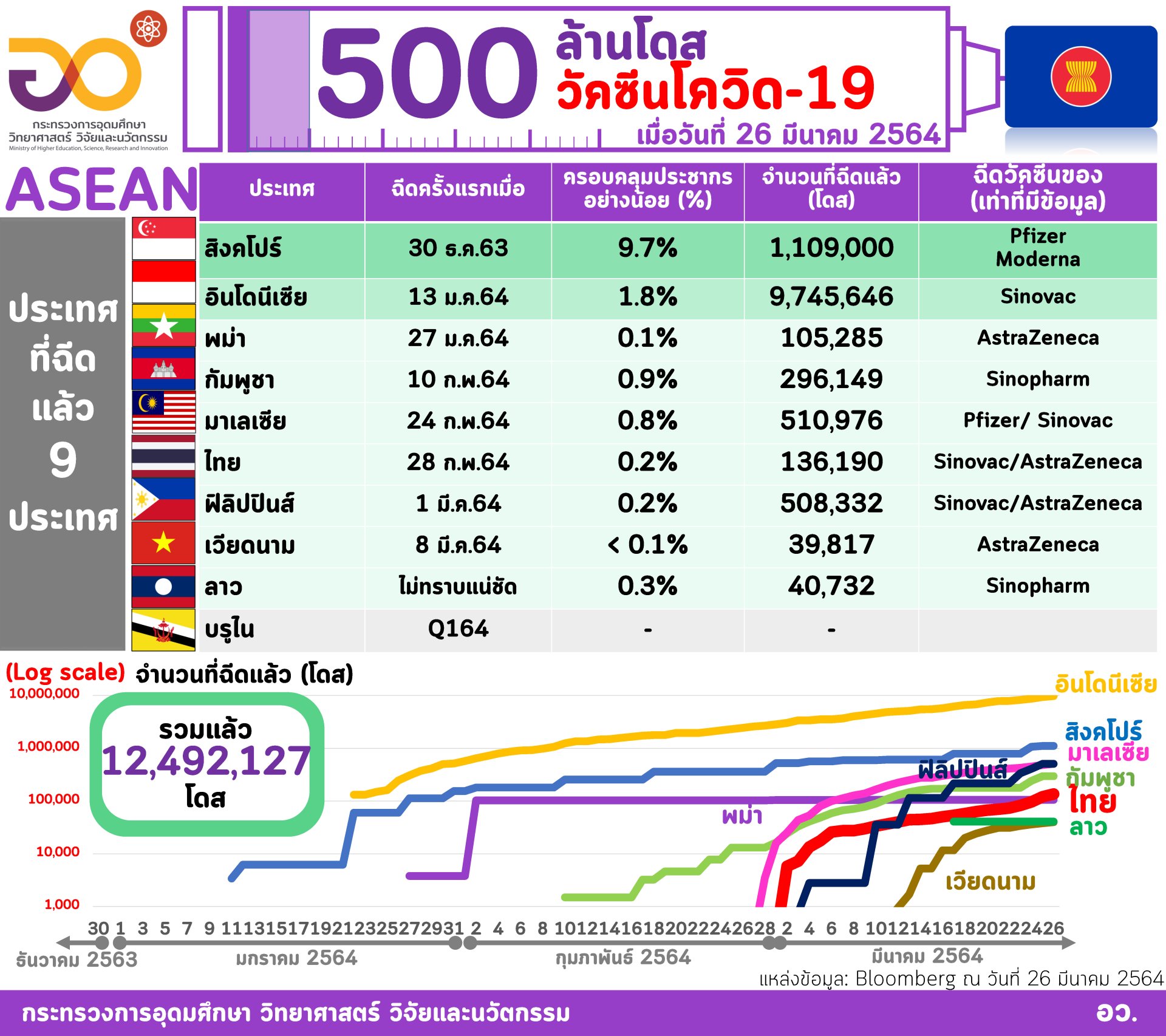 7.ในภูมิภาคอาเซียน ได้ฉีดวัคซีนแล้ว 12,492,127 โดส ใน 9 ประเทศ ได้แก่
