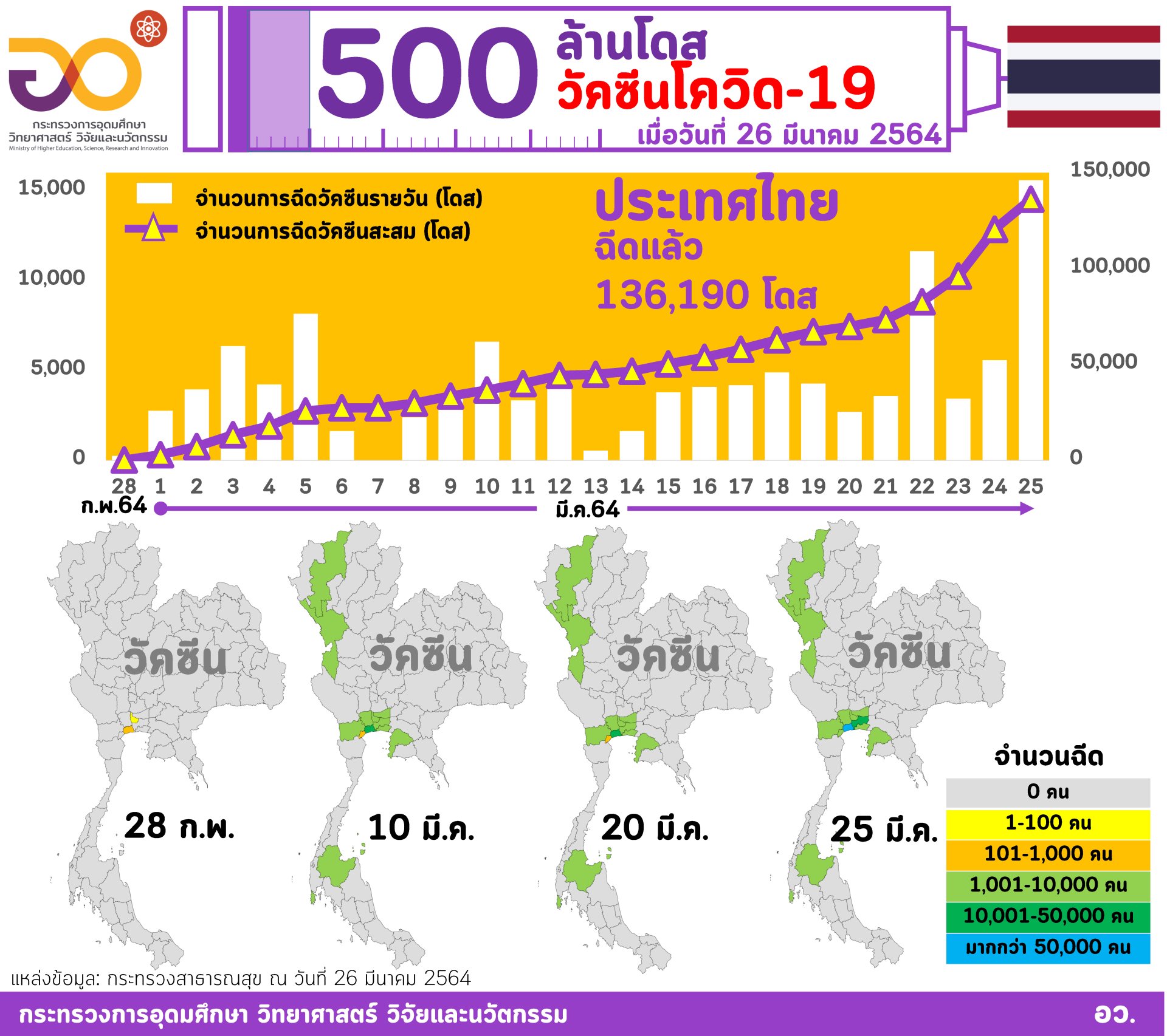สำหรับประเทศไทยมีการฉีดวัคซีนแล้วใน 13 จังหวัด จำนวนรวม 136,190 คน ณ วันที่ 25 มีนาคม 2564”