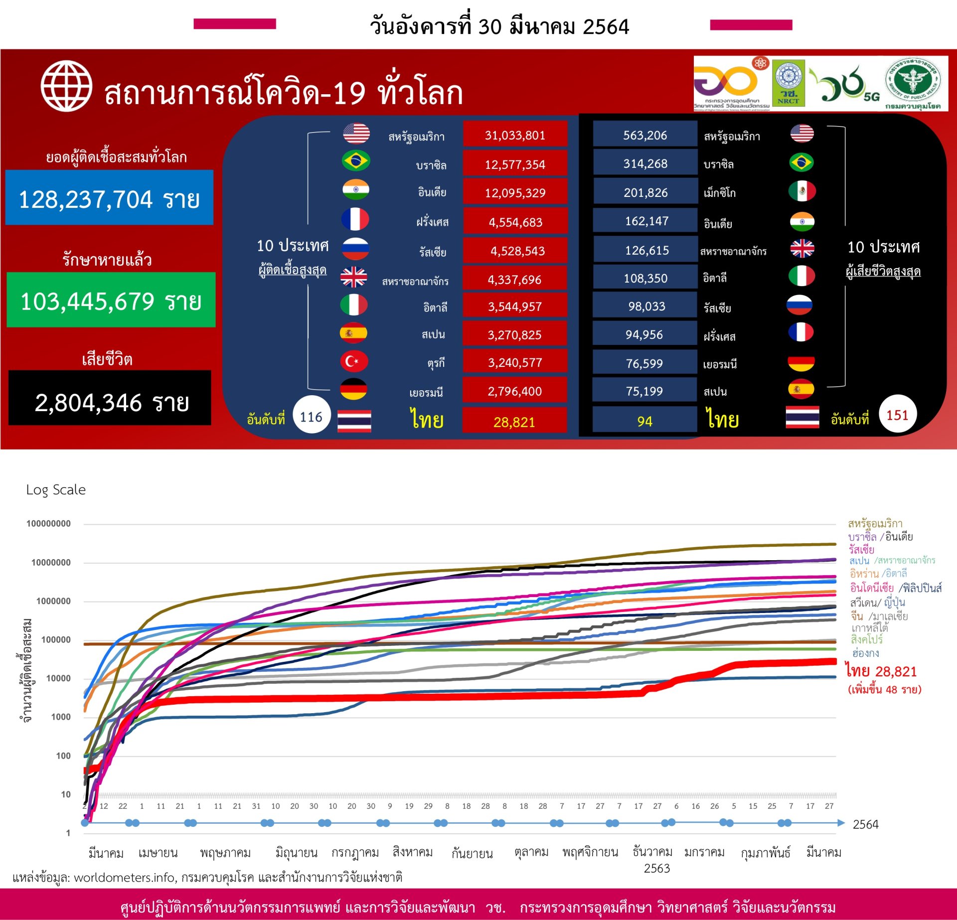 - ยอดผู้ติดเชื้อสะสมทั่วโลก 128 ล้านราย มีจำนวนผู้เสียชีวิตสะสมกว่า 2.8 ล้านราย