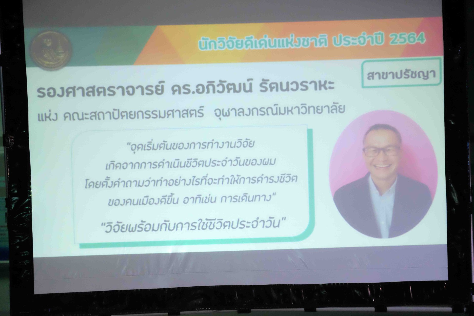 ดร.วิภารัตน์ ดีอ่อง ผู้อำนวยการสำนักงานการวิจัยแห่งชาติ เปิดบ้านงานวิจัยและนวัตกรรม By NRCT (in-House) : 1 ในนักวิจัยดีเด่นแห่งชาติประจำปีงบประมาณ 2564 ครั้งที่ 4 เพื่อเชิดชูเกียรตินักวิจัยไทยที่มีผลงานโดดเด่น สร้างคุณูปการให้กับวงวิชาการและประเทศชาติ รวมทั้งเป็นกิจกรรมที่ส่งเสริมการสร้างแรงจูงใจของนักประดิษฐ์ และนักวิจัยในอันที่จะพัฒนานวัตกรรมทางความคิด และภูมิปัญญาที่เป็นประโยชน์ สร้างความก้าวหน้าในศาสตร์แขนงต่าง ๆ โดย วช. ได้มอบรางวัลให้กับ รองศาสตราจารย์ ดร.อภิวัฒน์ รัตนวราหะ แห่งคณะสถาปัตยกรรมศาสตร์ จุฬาลงกรณ์มหาวิทยาลัย นักวิจัยดีเด่นแห่งชาติ สาขาปรัชญาประจำปี 2564 ซึ่งเป็นนักวิจัยที่ได้อุทิศตนเพื่อศึกษาวิจัยด้านนโยบายสาธารณะที่เกี่ยวกับการพัฒนาเมืองทั้งในประเทศไทย และต่างประเทศ เช่น นโยบายและการบริหารจัดการที่ดิน ทั้งภาพรวมในระดับประเทศและระดับเมือง นโยบายการขนส่งสาธารณะ โดยเฉพาะการขนส่งนอกระบบทางการ อย่างต่อเนื่อง ซึ่ง วช. ได้สนับสนุนทุนวิจัย ให้แก่ รองศาสตราจารย์ ดร.อภิวัฒน์ รัตนวราหะ ศึกษาวิจัยโครงการปริทัศน์สถานภาพความรู้เศรษฐกิจที่ดินของประเทศไทย เมื่อปีงบประมาณ 2555 และโครงการนโยบายการพัฒนาโครงข่ายและการเชื่อมต่อในบริเวณสถานีรถไฟฟ้าเพื่อรองรับแนวคิดการพัฒนาพื้นที่รอบสถานีขนส่งมวลชนในบริบทไทย เมื่อปีงบประมาณ 2557 รวมถึงยังได้จัดทำหนังสือผลงานวิชาการ เรื่อง “เศรษฐกิจที่ดินของประเทศไทย : ปริทัศน์สภานภาพความรู้” เมื่อปี 2558
