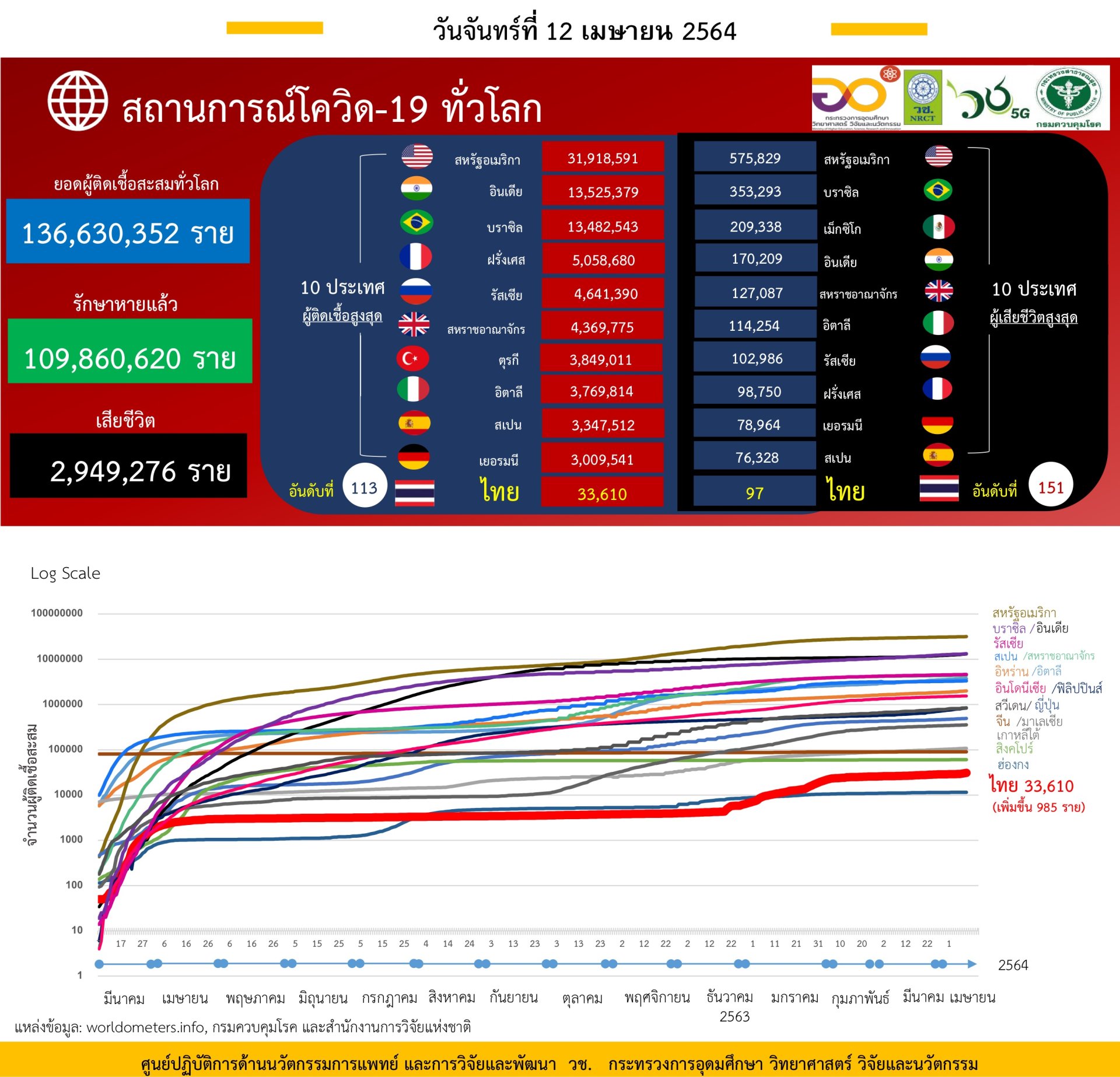 - ยอดผู้ติดเชื้อสะสมทั่วโลก 136.6 ล้านราย มีจำนวนผู้เสียชีวิตสะสมกว่า 2.9 ล้านราย