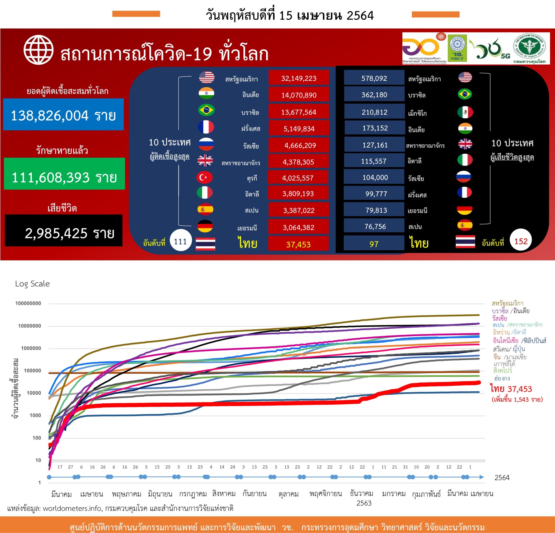 - ยอดผู้ติดเชื้อสะสมทั่วโลก 138.8 ล้านราย มีจำนวนผู้เสียชีวิตสะสมกว่า 2.98 ล้านราย