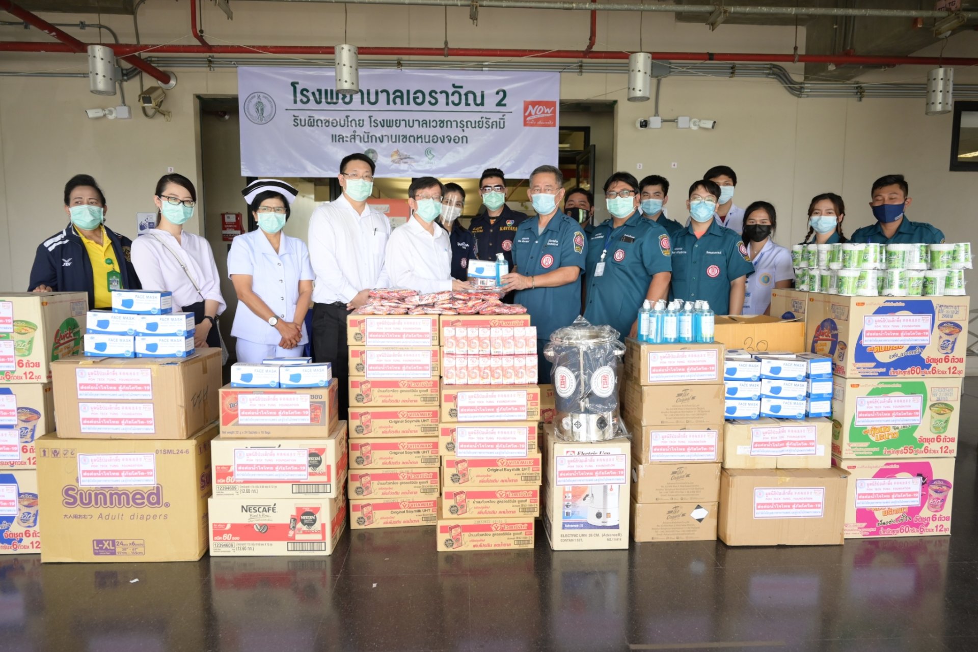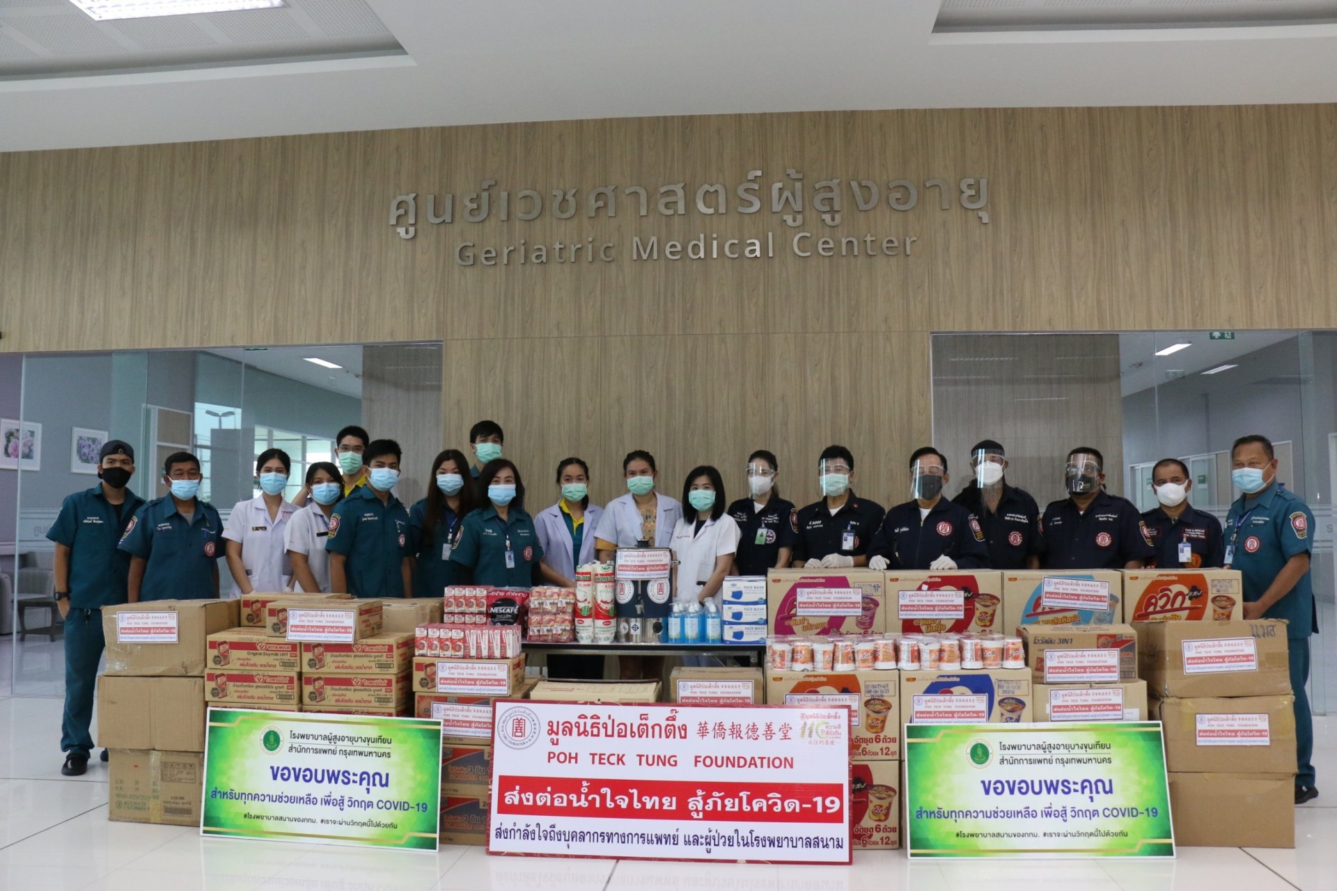 วันนี้ (วันที่ 22 เมษายน 2564 มูลนิธิป่อเต็กตึ๊ง โดย นายวิเชียร เตชะไพบูลย์ ประธานกรรมการ มอบหมายให้นายอรัณย์ โตทวด ผู้จัดการมูลนิธิป่อเต็กตึ๊ง จัดทีมสังคมสงเคราะห์ นำโดย นายพินัย ศรีพนาสณฑ์ ผู้จัดการฝ่ายสังคมสงเคราะห์ นำสิ่งของเครื่องใช้จำเป็น ประกอบด้วย หม้อต้มน้ำไฟฟ้า ขนาด 14 ลิตร กาแฟ และโอวัลติน 3 in 1 นมถั่วเหลือง บะหมี่กึ่งสำเร็จรูป(ชนิดถ้วย) หน้ากากอนามัย และเจลแอลกอฮอล์ล้างมือ แก่โรงพยาบาลสนาม 5 แห่ง ได้แก่ ศูนย์กีฬาเฉลิมพระเกียรติ 84 พรรษา หรือ โรงพยาบาลสนามเอราวัณ 1 เขตบางบอน ศูนย์กีฬาบางกอกอารีนา หรือ โรงพยาบาลสนามเอราวัณ 2 เขตหนองจอก โรงพยาบาลสนามราชพิพัฒน์ เขตทวีวัฒนา โรงพยาบาลผู้สูงอายุบางขุนเทียน เขตบางขุนเทียน กรุงเทพฯ และโรงพยาบาลสนามธรรมศาสตร์ จ.ปทุมธานี ในโครงการ“ส่งต่อน้ำใจไทย สู้ภัยโควิด-19” ส่งกำลังใจถึงบุคลากรทางการแพทย์และผู้ป่วยในโรงพยาบาลสนาม โดยมูลนิธิฯ ได้มอบชุด PPE (Personal Protective Equipment) จำนวน 200 ชุด แก่โรงพยาบาลสนามธรรมศาสตร์เพิ่มอีก 1 รายการ รวมมูลค่าเป็นเงินทั้งสิ้น 345,564 บาท (สามแสนสี่หมื่นห้าพันห้าร้อยหกสิบสี่บาทถ้วน) โดยมีคณะผู้บริหารและผู้แทนบุคลากรทางการแพทย์แต่ละแห่ง ได้แก่ ผศ.นพ.ปรีดิ์ นิมมานนิตย์ ผู้ช่วยผู้อำนวยการฝ่ายวางแผนและงบประมาณ รพ.ธรรมศาสตร์เฉลิมพระเกียรติ นพ.สุรชัย ภูพิพัฒน์ผล ผู้อำนวยการโรงพยาบาลเวชการุณย์รัศมิ์ พญ.ณัฐนรี โชควิริยากร ผู้อำนวยการโรงพยาบาลเอราวัณ 1 นพ.ชัยยศ เด่นอริยะกูล ผู้อำนวยการโรงพยาบาลราชพิพัฒน์ และนางสาวสกุลนา ประเสริฐศักดิ์ นักรังสีการแพทย์โรงพยาบาลผู้สูงอายุบางขุนเทียน เป็นผู้รับมอบ พร้อมด้วยอาสาสมัครศิลปินมูลนิธิป่อเต็กตึ๊ง นำโดย นายศรสุทธา กลั่นมาลี (ถั่วแระ เชิญยิ้ม) นายสัญญา พรนารายณ์ นายสดใส โรจนวิชัย (สดใส รุ่งโพธิ์ทอง) นางสาวพัชร์สิตา