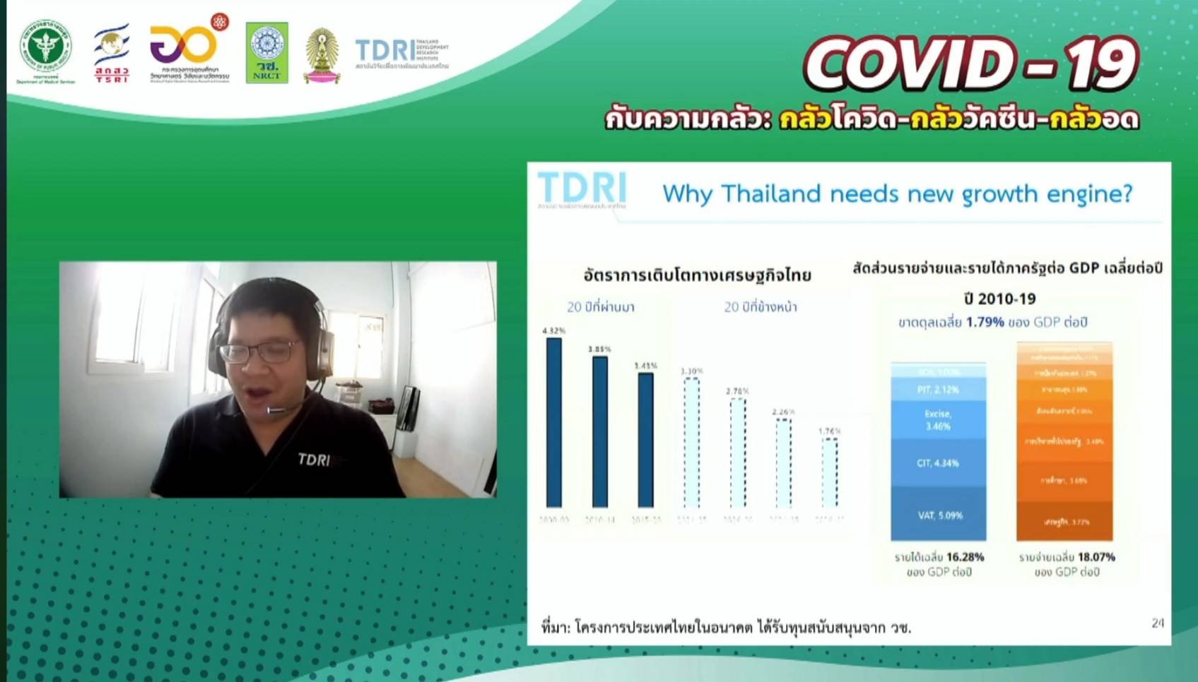 ดร.นณริฏ พิศลยบุตร สถาบันวิจัยเพื่อการพัฒนาประเทศไทย (TDRI) กล่าวในวงเสวนาว่า โครงการประเทศไทยในอนาคต ที่ได้รับการสนับสนุนทุนจาก สำนักงานการวิจัยแห่งชาติ (วช.) สะท้อนให้เห็นภาพการกังวลใจในอนาคตว่า ฐานะทางการคลังจะมีปัญหามากขึ้น การเจริญเติบโตของไทยตกลงเรื่อย ๆ ทุก ๆ 5 ปี ถ้าเฉลี่ยดู พบว่าเศรษฐกิจเคยโตถึง 4 % แต่ตอนนี้หล่นลงมาอยู่ที่ 3.8% และนะตอนนี้ เหลือ 3.4% ซึ่งในอนาคตถ้าไม่มีเครื่องจักรทำเงินใหม่ จะยิ่งตกลงเรื่อย ๆ ส่วนด้านการคลัง 10 ปีที่ผ่านมา รัฐบาลหารายได้เพียง 16.28% GDP แต่ประเทศไทยใช้จ่ายไปถึง 18.07 % GDP นั้นหมายความว่าทุกปี การคลังของประเทศไทยจะติดลบประมาณ 1.79% GDP และนี้ก็เป็นการสะท้อนว่าในอนาคต ประเทศไทยจะมีหนี้เพิ่มสูงขึ้นเรื่อย ๆ โดยเฉลี่ยในระยะยาวการเสวนาในครั้งนี้ วช. จะรวบรวมเอาองค์ความรู้ต่าง ๆ ไปเป็นข้อมูลเชิงประจักษ์ โดยนำมาออกแบบเป็นนโยบาย หรือมาตรการ ให้เป็นรูปธรรมชัดเจนยิ่งขึ้น