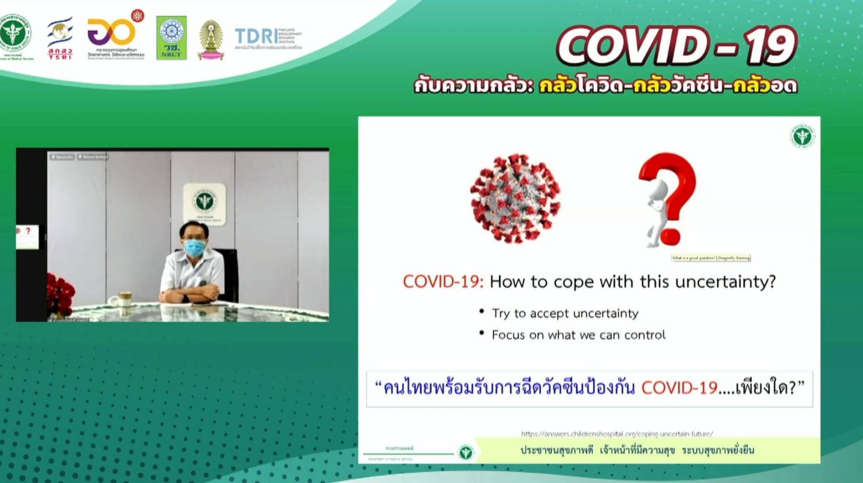 การเสวนาโควิด-19 กับความกลัว : กลัวโควิด กลัววัคซีน กลัวอด เพื่อให้ประชาชนได้เข้าถึงผลงานวิจัยและนวัตกรรมและคลายข้อสงสัย ลดความกังวลใจ เพิ่มความเชื่อมั่นในการเข้ารับการฉีดวัคซีนที่ใช้ภายในประเทศ และยังรวมถึงการรับทราบผลกระทบและผลข้างเคียง รวมถึงแนวทางแก้ไขทั้งด้านสังคมและเศรษฐกิจ จากองค์ความรู้งานวิจัยและนวัตกรรมของประเทศอย่างแท้จริง ผู้ร่วมเสวนาเป็นวิทยากรที่มีประสบการณ์ และมีความรู้ในเรื่องการวิจัยและนวัตกรรมจากโรคโควิด-19 ประกอบด้วย ศาสตราจารย์กิตติคุณ นายแพทย์สุทธิพร จิตต์มิตรภาพ ประธานคณะกรรมการส่งเสริมวิทยาศาสตร์ วิจัย และนวัตกรรม (กสว.), นายแพทย์สมศักดิ์ อรรฆศิลป์ อธิบดีกรมการแพทย์, ศาสตราจารย์ นายแพทย์ยง ภู่วรวรรณ จุฬาลงกรณ์มหาวิทยาลัย, และ ดร.นณริฏ พิศลยบุตร สถาบันวิจัยเพื่อการพัฒนาประเทศไทย (TDRI) โดยมี ศาสตราจารย์ นายแพทย์สมเกียรติ วัฒนศิริชัยกุล กรรมการดำเนินงานสนับสนุนการวิจัยและนวัตกรรมประเด็นโรคติดเชื้อไวรัสโคโรนา 2019 (โควิด-19) วช. เป็นผู้ดำเนินงานในการเสวนาฯ