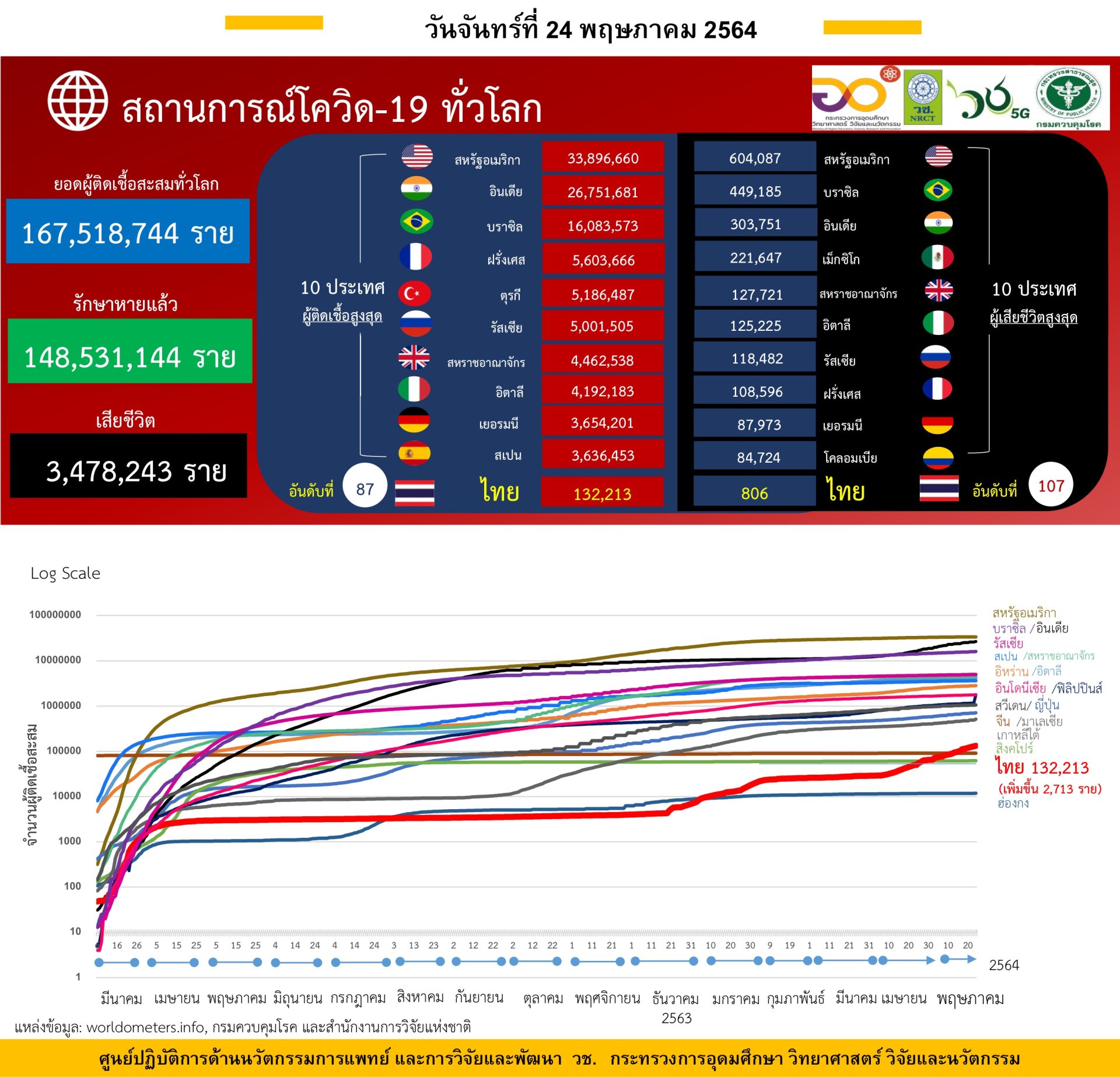 - ยอดผู้ติดเชื้อสะสมทั่วโลก 167.5 ล้านราย มีจำนวนผู้เสียชีวิตสะสมกว่า 3.4 ล้านราย