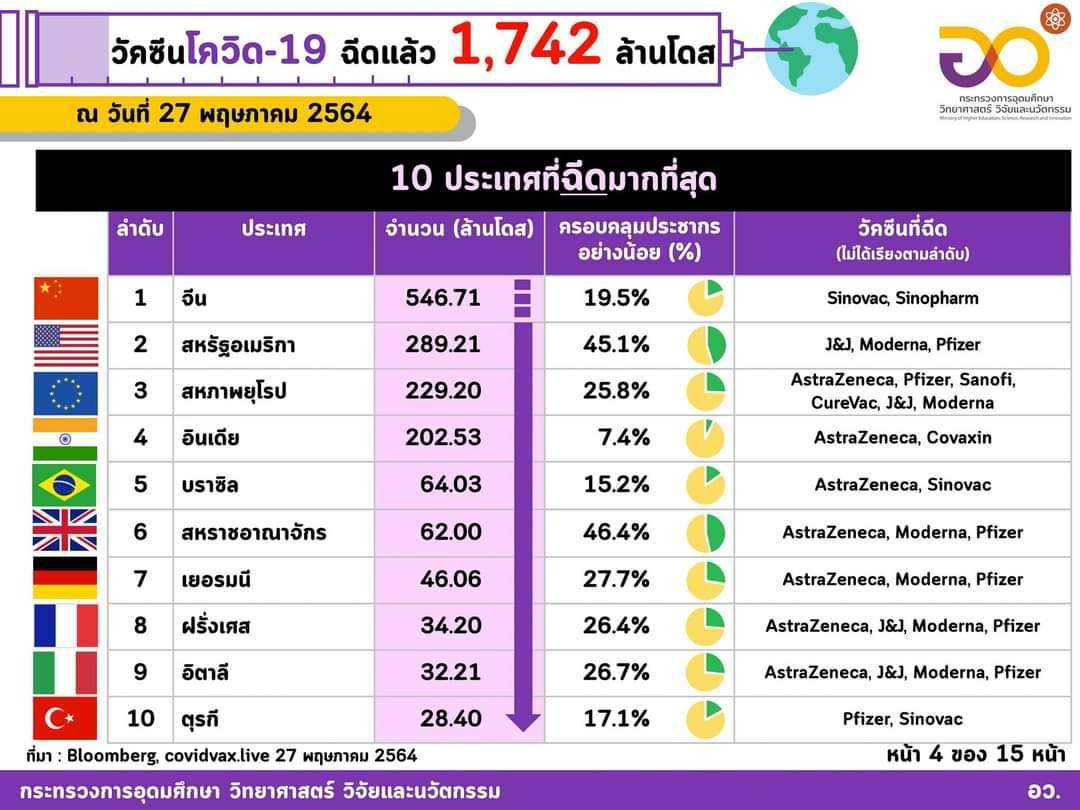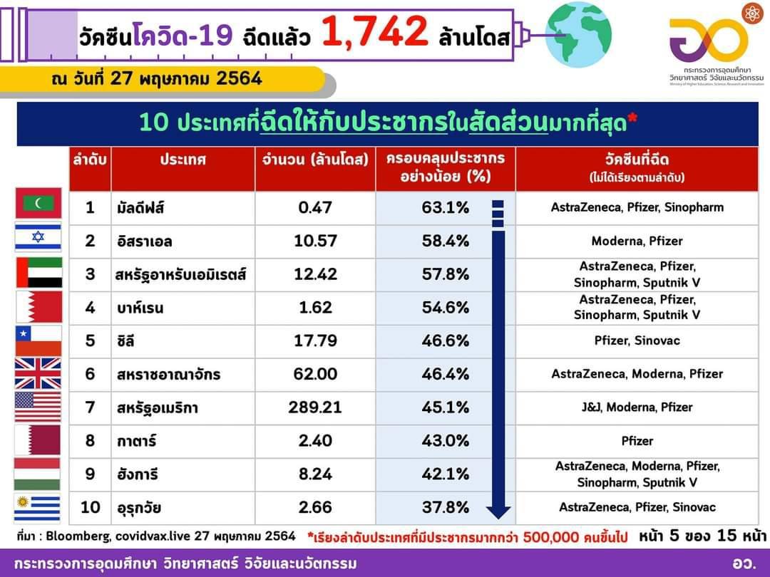 (27 พฤษภาคม 2564) กระทรวงการอุดมศึกษา วิทยาศาสตร์ วิจัยและนวัตกรรม (อว.) เผยข้อมูลสถิติการฉีดวัคซีนโควิด-19 ทั่วโลกแล้ว 1,742 ล้านโดส ใน 197 ประเทศ/เขตปกครอง โดยขณะนี้อัตราการฉีดล่าสุดรวมกันทั่วโลกที่ 29.8 ล้านโดสต่อวัน และมีแนวโน้มที่เพิ่มขึ้นอย่างต่อเนื่อง เมื่อพิจารณารายประเทศพบว่าอิสราเอลได้ฉีดวัคซีนครอบคลุมเกินครึ่งของประชากรแล้ว ในขณะที่สหรัฐอเมริกามีจำนวนการฉีดวัคซีนสูงที่สุดที่ 289 ล้านโดส โดยมีชาวอเมริกันกว่า 132 ล้านคนได้รับวัคซีนครบ 2 โดสแล้ว"