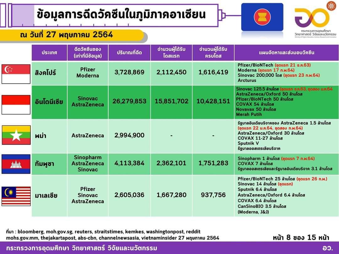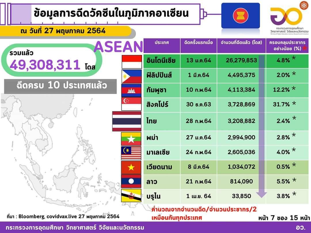 4. ในภูมิภาคอาเซียน ได้ฉีดวัคซีนแล้วครบ 10 ประเทศ รวมจำนวน 49,308,311 โดส ได้แก่