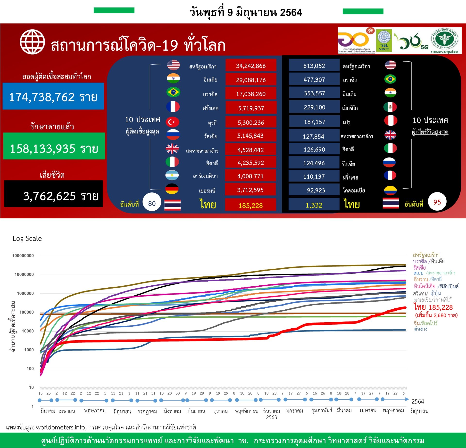 - ยอดผู้ติดเชื้อสะสมทั่วโลก 174.7 ล้านราย มีจำนวนผู้เสียชีวิตสะสมกว่า 3.7 ล้านราย