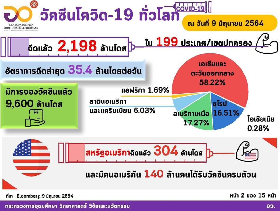 (9 มิถุนายน 2564) กระทรวงการอุดมศึกษา วิทยาศาสตร์ วิจัยและนวัตกรรม (อว.) เผยข้อมูลสถิติการฉีดวัคซีนโควิด-19 ทั่วโลกแล้ว 2,198 ล้านโดส ใน 197 ประเทศ/เขตปกครอง โดยขณะนี้อัตราการฉีดล่าสุดรวมกันทั่วโลกที่ 35.4 ล้านโดสต่อวัน และมีแนวโน้มที่เพิ่มขึ้นอย่างต่อเนื่อง เมื่อพิจารณารายประเทศพบว่าอิสราเอลได้ฉีดวัคซีนครอบคลุมเกินครึ่งของประชากรแล้ว ในขณะที่สหรัฐอเมริกามีจำนวนการฉีดวัคซีนสูงที่สุดที่ 304 ล้านโดส โดยมีชาวอเมริกันกว่า 140 ล้านคนได้รับวัคซีนครบ 2 โดสแล้ว"