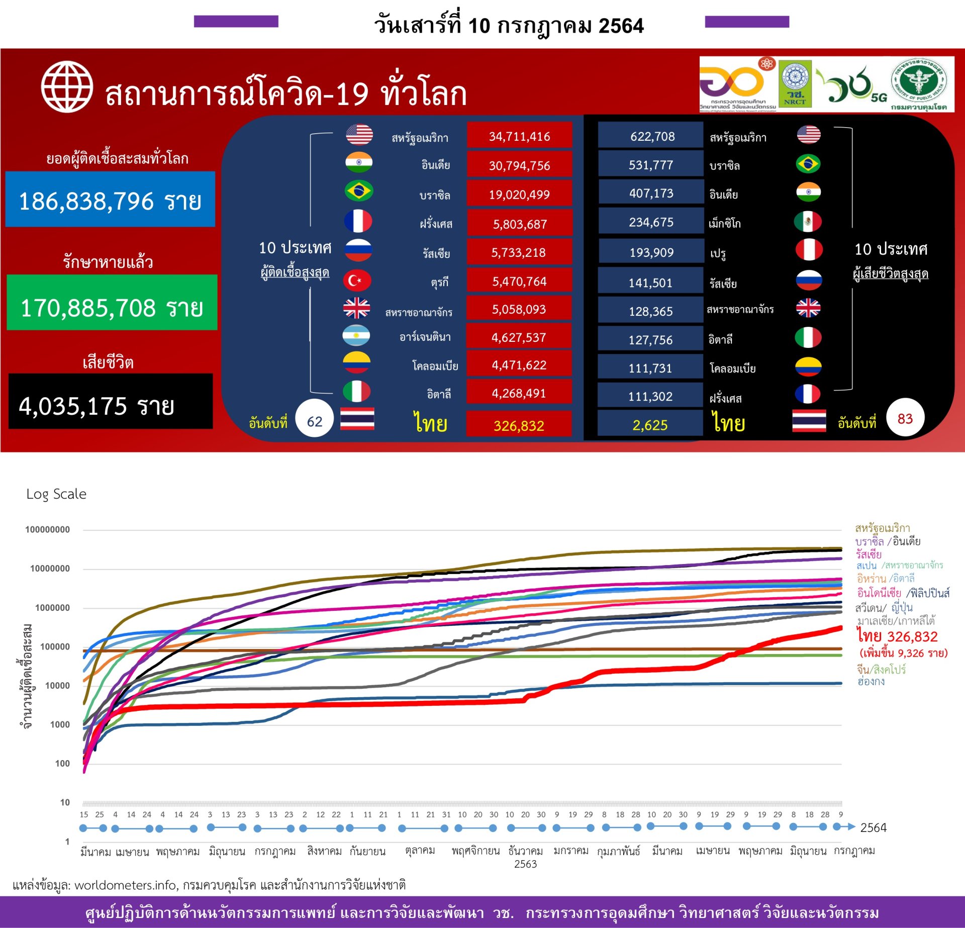 - ยอดผู้ติดเชื้อสะสมทั่วโลก 186.8 ล้านราย มีจำนวนผู้เสียชีวิตสะสมกว่า 4 ล้านราย