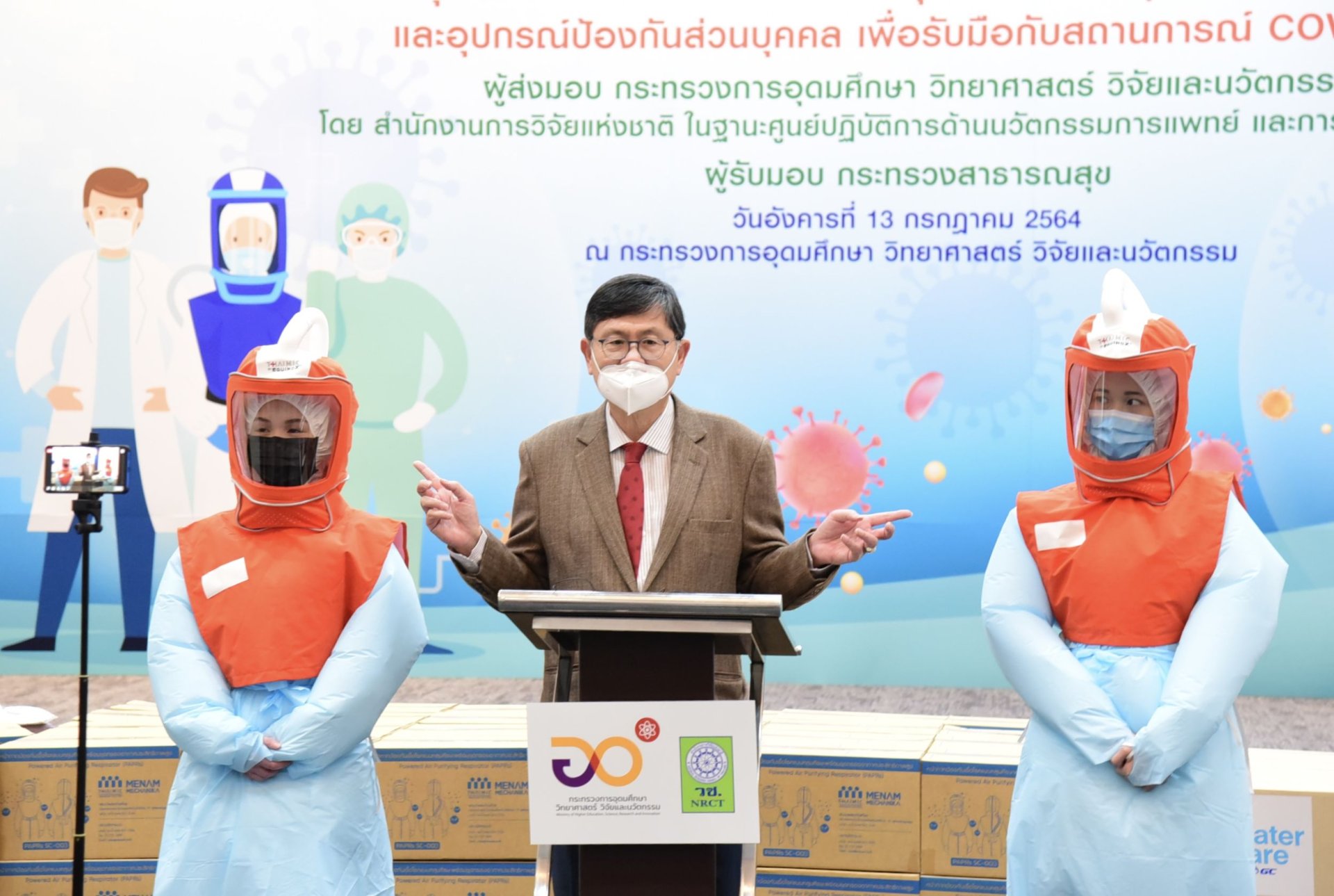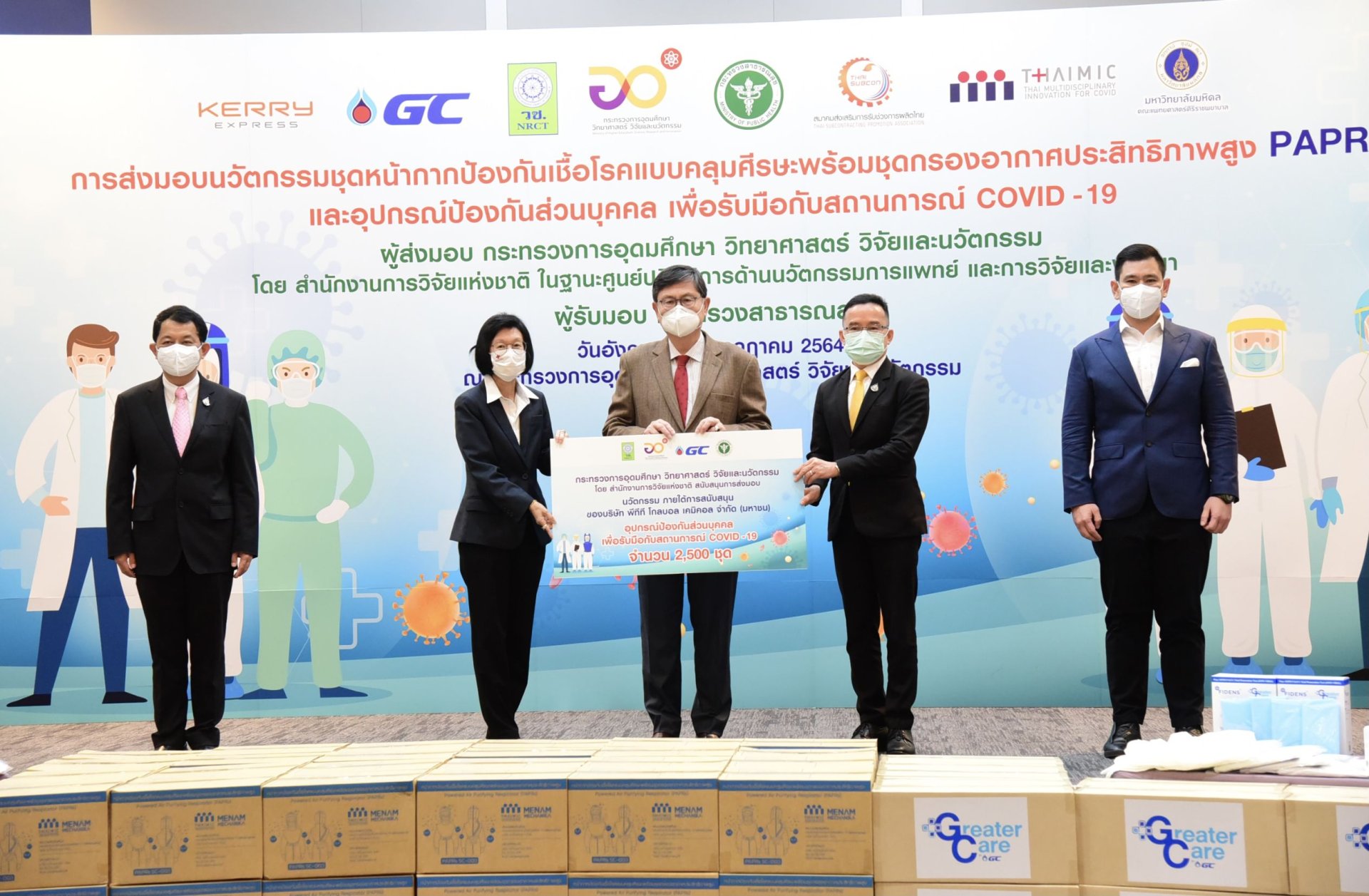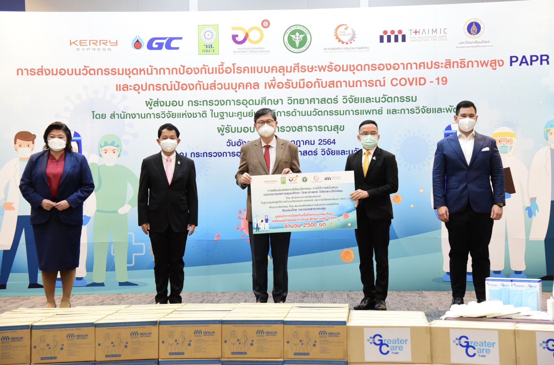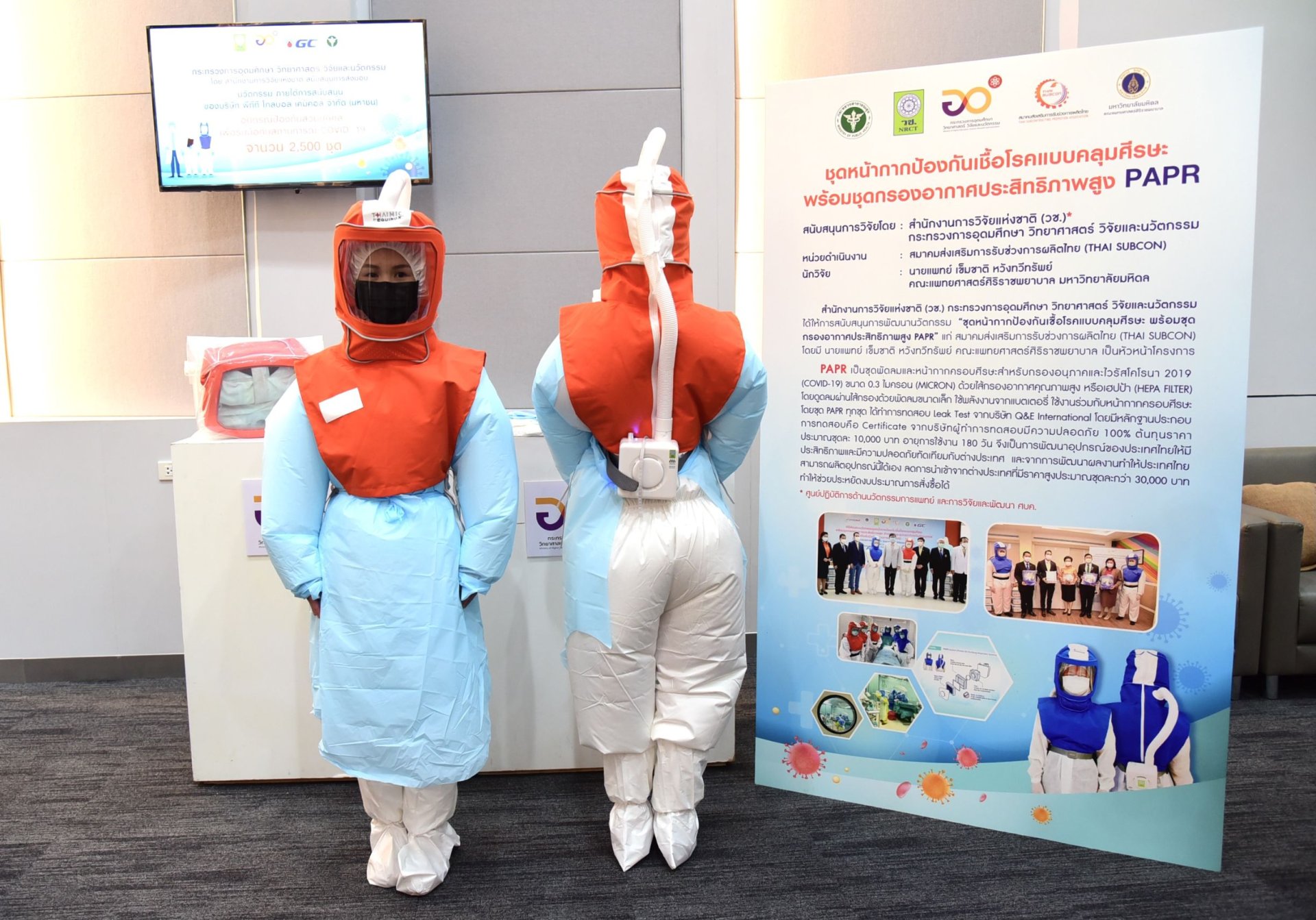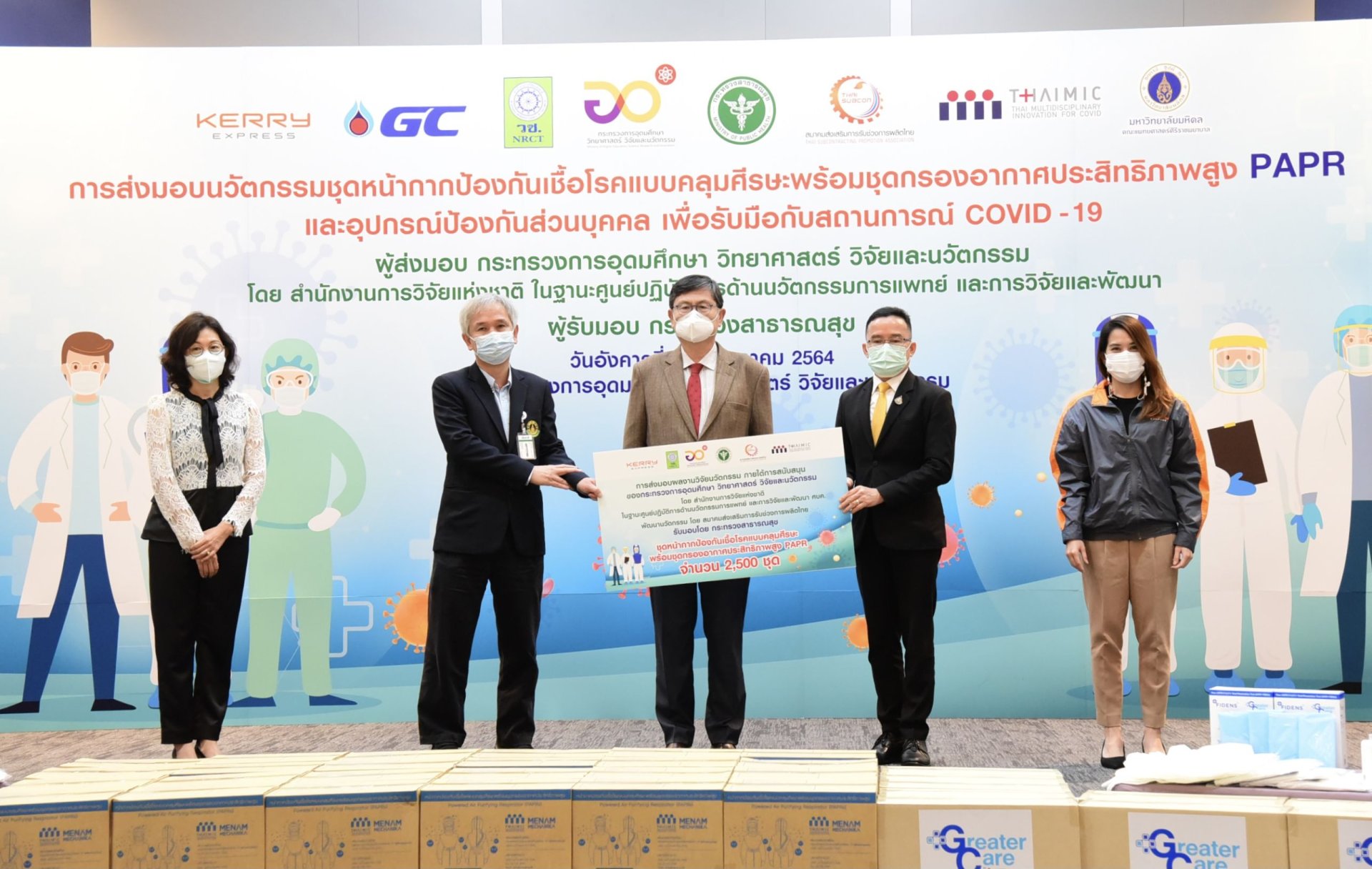 ด้าน ดร.วิภารัตน์ ดีอ่อง ผอ.สำนักงานการวิจัยแห่งชาติ(วช.) กล่าวว่า สธ.ได้มีหนังสือขอรับการสนับสนุนนวัตกรรมชุดหน้ากากป้องกันเชื้อโรคแบบคลุมศีรษะชุดกรองอากาศประสิทธิภาพสูง (PAPR) และอุปกรณ์ป้องกันส่วนบุคคล มายัง วช.ในฐานะศูนย์ปฏิบัติการด้านนวัตกรรมการแพทย์ และการวิจัยและพัฒนา วช.จึงสนับสนุนนวัตกรรมชุด PAPR จากสมาคมส่งเสริมการรับช่วงการผลิตไทยจำนวน 2,500 ชุดและบริษัท พี ทีที โกลบอล เคมิคอล จำกัด (มหาชน) มอบชุดกาวน์กันน้ำ จำนวน 2,500 ชุด และชุด Coverall จำนวน 100 ชุด โดยมี บริษัทผู้นำธุรกิจด้านการจัดส่งพัสดุด่วนทั่วไทยอย่าง เคอรี่ เอ็กซ์เพรส (ประเทศไทย) จำกัด (มหาชน) ให้การสนับสนุนจัดส่งฟรีทั้งหมด โดยไม่คิดค่าใช้จ่าย เพื่อช่วยให้แพทย์ พยาบาล รวมไปถึงเจ้าหน้าที่ที่อยู่ด่านหน้าจะได้รับชุดอย่างเร็วที่สุด ตรงตามความต้องการ และเกิดประโยชน์สูงสุด นอกจากนี้ ยังได้รับความร่วมมือจากกลุ่มสหศาสตร์นวัตกรรมไทยต้านภัยโควิด หรือ ThaiMic ในการกำหนดโรงพยาบาล และจำนวนอุปกรณ์ อีกด้วย