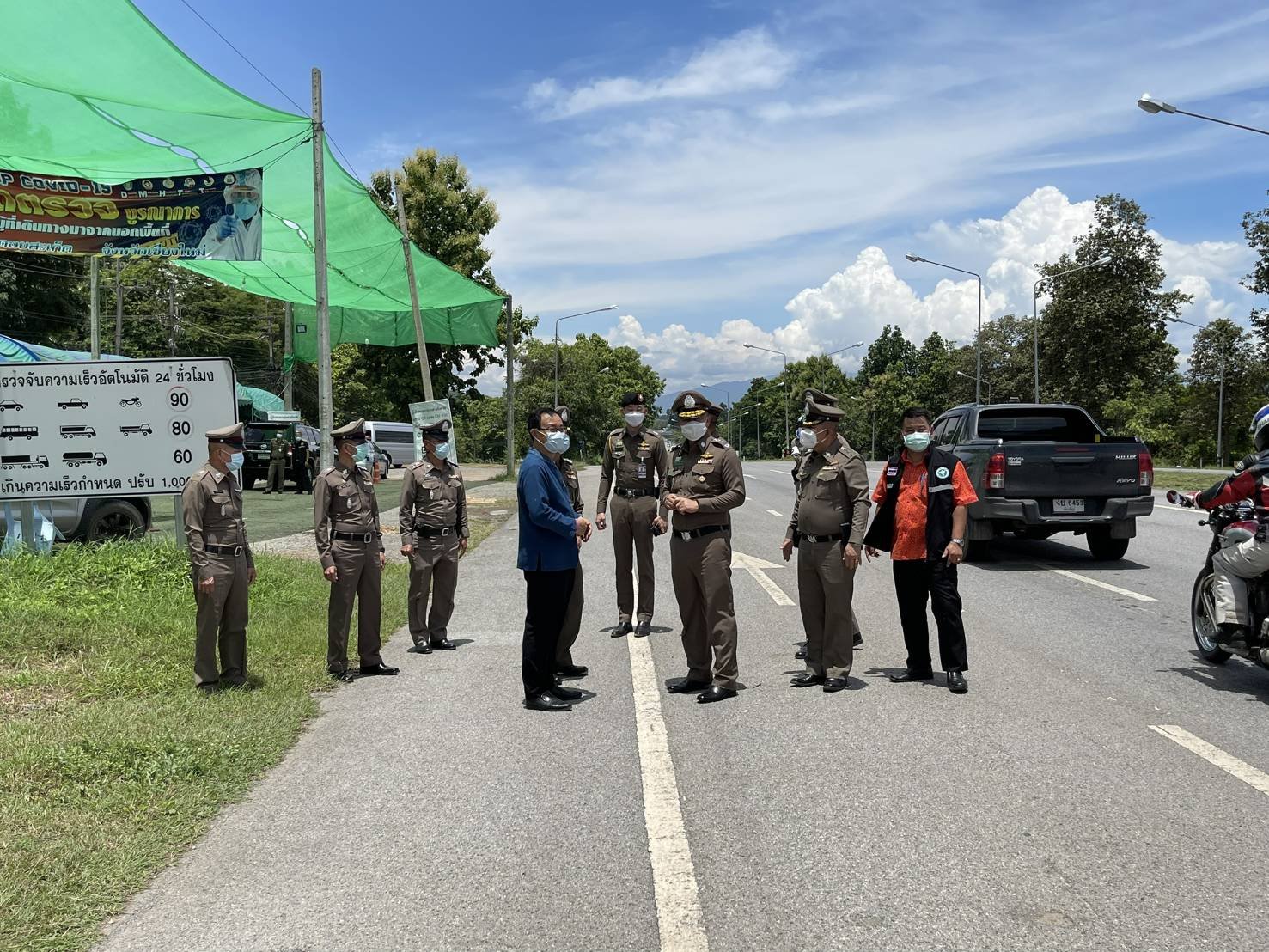 15 ก.ค.2564 เวลา 11.00 น. พล.ต.ท.ประจวบ วงศ์สุข ผบช.ภ.5,พ.ต.อ.วิสุทธ์ พุ่มจันทร์ รอง ผบก.ภ.จว.เชียงใหม่,พ.ต.อ.พงษ์เดช คำใจสู้ รอง ผบก.ภ.จว.เชียงใหม่ พร้อมคณะ ได้เดินทางมาตรวจเยี่ยมจุดตรวจบูรณาการ ควบคุมการแพร่ระบาดของเชื้อไวรัส โควิด-19 ของ สภ.ดอยสะเก็ด จ.เชียงใหม่ ถนนเชียงใหม่-เชียงราย พบ นายกิติพัฒน์ กะวัง นายอำเภอดอยสะเก็ด,