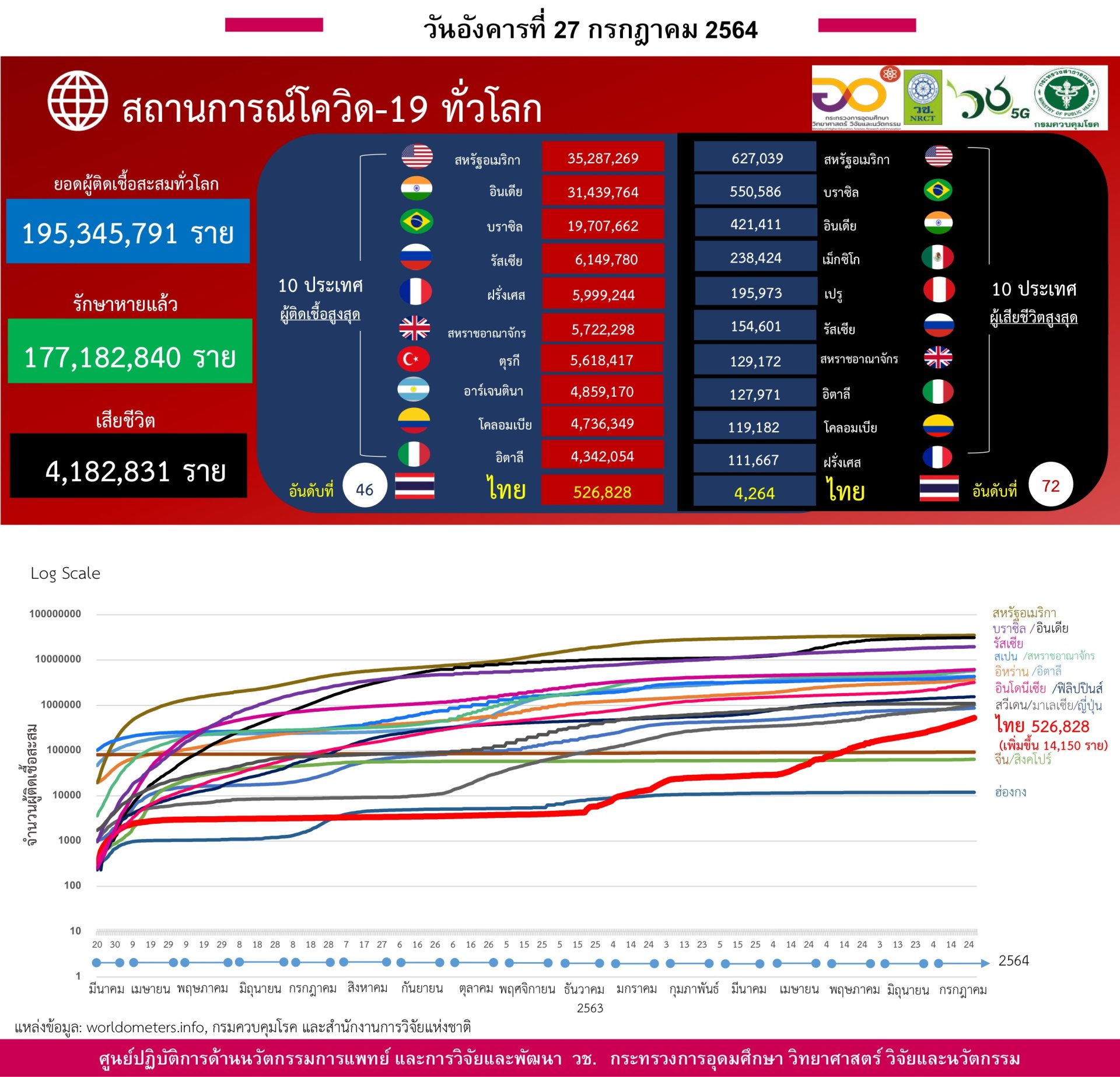 - ยอดผู้ติดเชื้อสะสมทั่วโลก 195.3 ล้านราย มีจำนวนผู้เสียชีวิตสะสมกว่า 4.1 ล้านราย