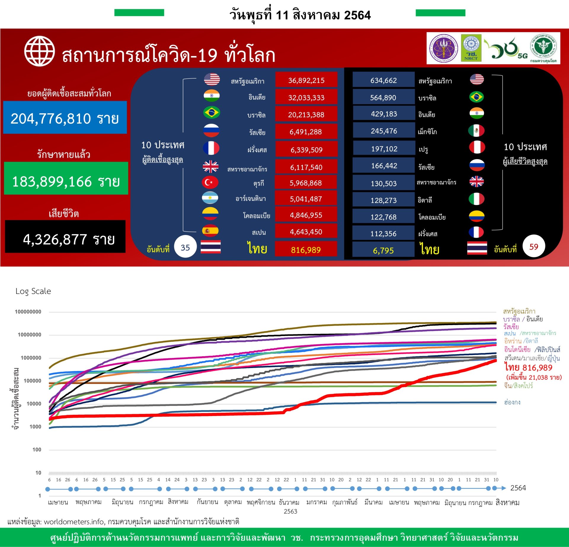 - ยอดผู้ติดเชื้อสะสมทั่วโลก 204.7 ล้านราย มีจำนวนผู้เสียชีวิตสะสมกว่า 4.3 ล้านราย