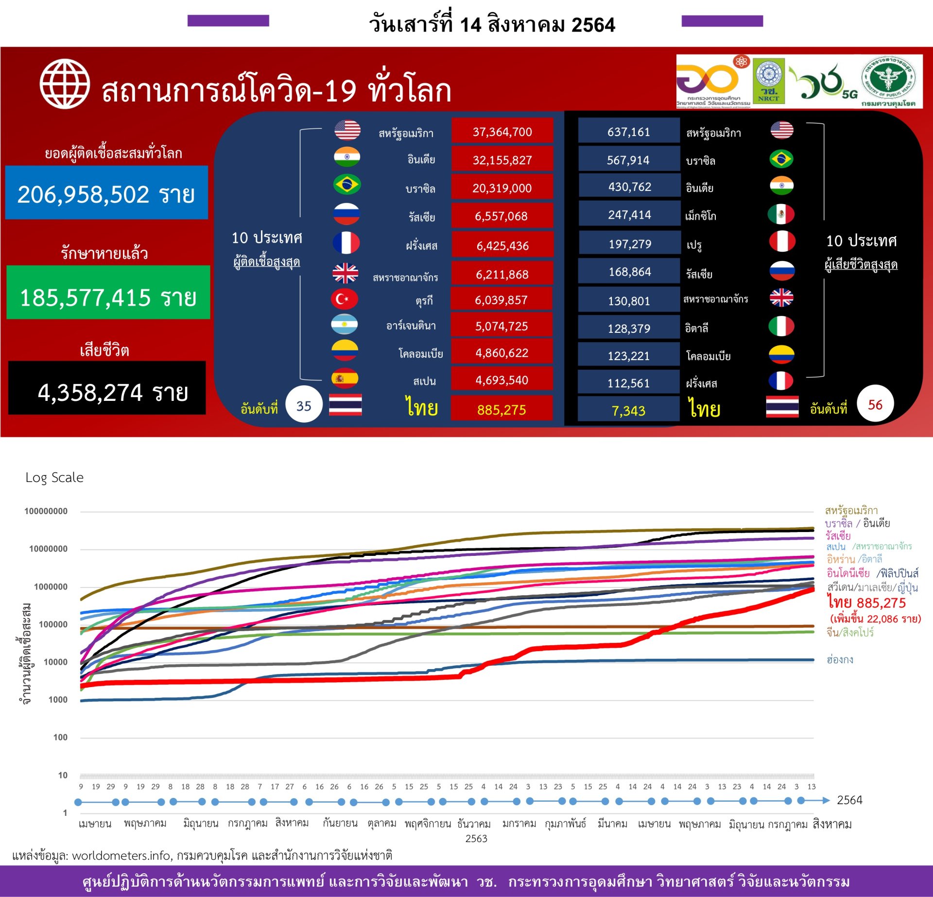 - ยอดผู้ติดเชื้อสะสมทั่วโลก 206.9 ล้านราย มีจำนวนผู้เสียชีวิตสะสมกว่า 4.3 ล้านราย