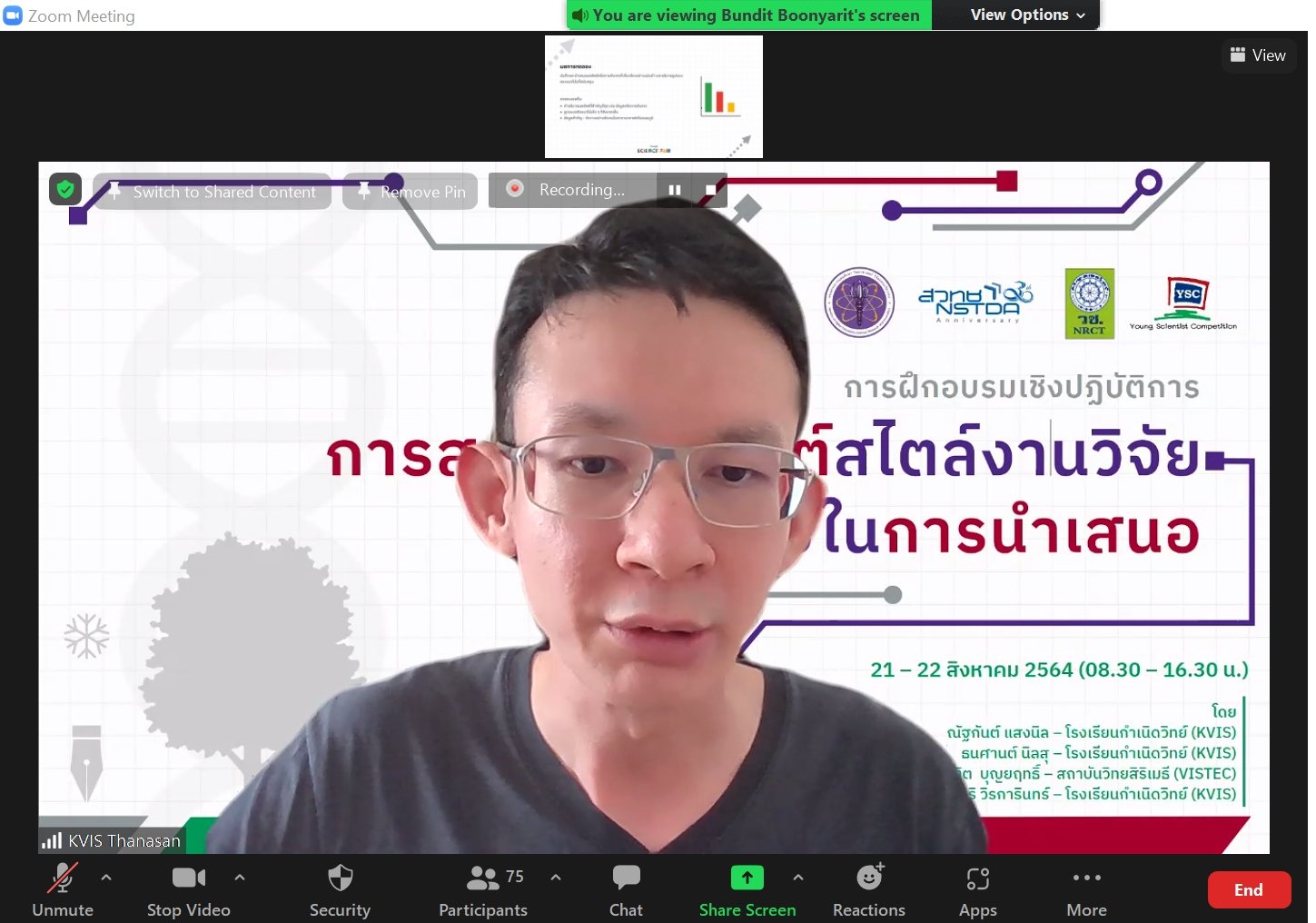 ดร.วิภารัตน์ ดีอ่อง ผู้อำนวยการสำนักงานการวิจัยแห่งชาติ กล่าวว่า วช. ได้ตระหนักถึงความสำคัญในด้านการเตรียมกำลังคนและพัฒนาบุคลากรด้านการวิจัยและนวัตกรรมในทุกช่วงวัย ตั้งแต่ระดับ มัธยมศึกษา อาชีวศึกษา อุดมศึกษา ตลอดจนระดับนักวิจัยและนักประดิษฐ์ ซึ่งเป็นกำลังสำคัญในการขับเคลื่อนประเทศด้านการวิจัยและนวัตกรรมในทักษะด้านต่าง ๆ โดยเฉพาะอย่างยิ่งด้านวิทยาศาสตร์และเทคโนโลยี รวมไปถึงด้านเทคโนโลยีสารสนเทศและการสื่อสาร จึงสนับสนุนทุนให้แก่โครงการ “การพัฒนาและเสริมศักยภาพเยาวชนในรูปแบบการจัดประกวดแข่งขัน” ในการจัดฝึกอบรมเชิงปฏิบัติการออนไลน์ เรื่อง “การสกัดคอนเทนต์สไตล์งานวิจัยเพื่อใช้ในการนำเสนอ” ขึ้น เพื่อพัฒนาศักยภาพครูและนักเรียน ให้มีทักษะในการสื่อสารให้ผู้ฟังสามารถเข้าใจเนื้อหางานวิจัย ความสำคัญของงานวิจัยที่ต้องการนำเสนอได้อย่างชัดเจน และมีประสิทธิภาพ เรียนรู้เทคนิคการวางโครงสร้างเพื่อสร้างเนื้อหาในการนำเสนองานวิจัย และจัดทำเอกสารประกอบการนำเสนอ ตลอดจนเรียนรู้เครื่องมือและเทคนิคการตัดต่อคลิปวิดีโอเพื่อใช้ในการนำเสนอผลงาน ซึ่งเป็นทักษะที่จำเป็นในการขับเคลื่อนงานวิจัยและนวัตกรรมให้มีประสิทธิภาพ ในรูปแบบออนไลน์ ตามมาตรการควบคุมและป้องกันการแพร่ระบาดของโรคติดเชื้อไวรัสโคโรนา 2019 (COVID-19) จังหวัดปทุมธานี