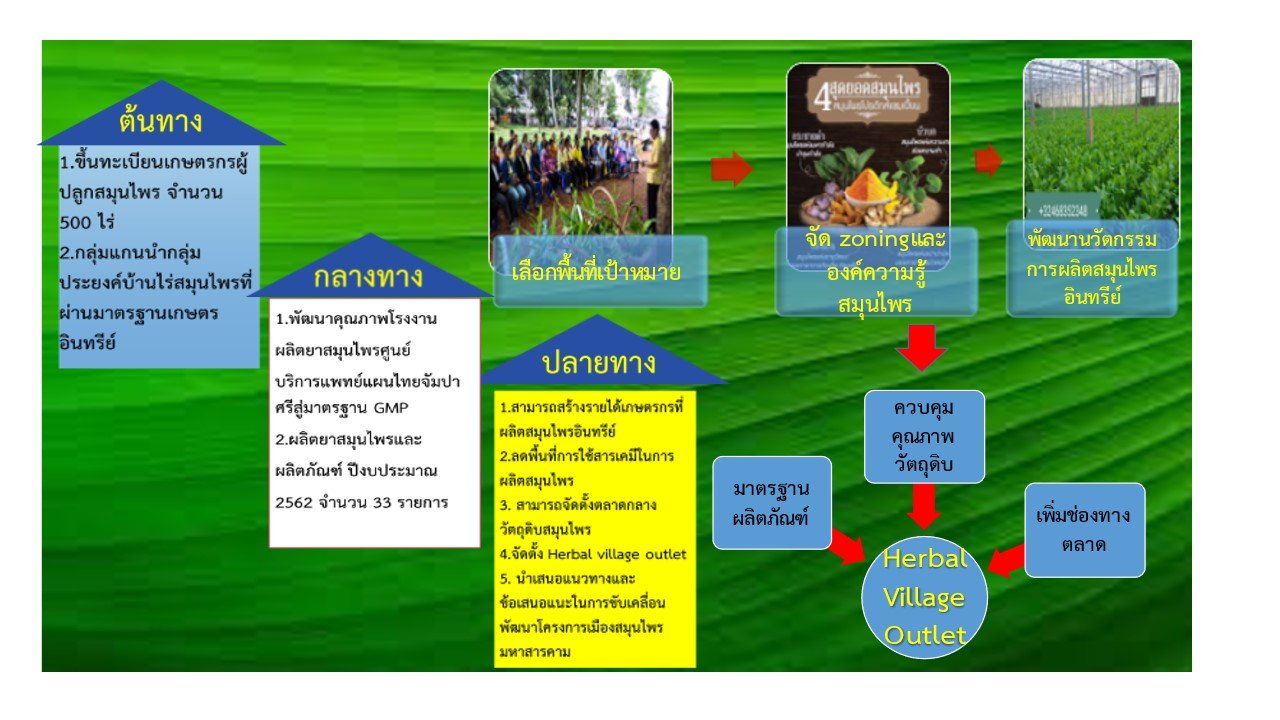การพัฒนาคุณภาพโรงงานผลิตยาสมุนไพรศูนย์บริการแพทย์ไทยจัมปาศรีสู่มาตรฐาน GMP และผลิตยาสมุนไพรและผลิตภัณฑ์ และปลายทาง ได้แก่ สามารถสร้างรายได้เกษตรกรที่ผลิตสมุนไพรอินทรีย์ ลดพื้นที่การใช้สารเคมีในการผลิตสมุนไพร สามารถจัดตั้งตลาดกลางวัตถุดิบสมุนไพร รวมถึงการจัดตั้ง Herbal village outlet และ นำเสนอแนวทางและข้อเสนอแนะในการขับเคลื่อนพัฒนาโครงการเมืองสมุนไพรมหาสารคาม จนสามารถสร้างเครือข่ายการผลิตสมุนไพรและแปรรูปผลิตภัณฑ์สมุนไพรให้มีคุณภาพได้มาตรฐาน GAP และ GACP รวมถึงสร้างรายได้ให้กับกลุ่มเกษตร โดยการหาช่องทางการตลาดในหลาย ๆ ภาค