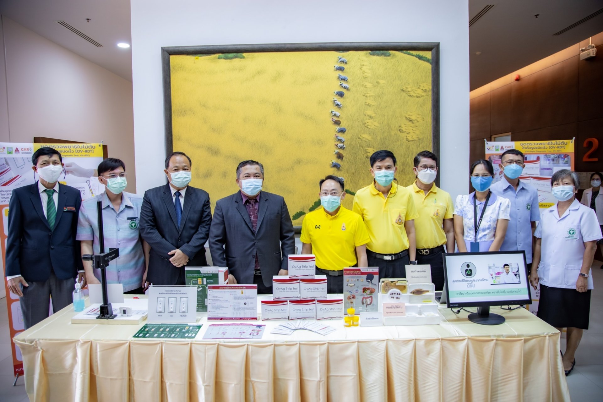 สำนักงานการวิจัยแห่งชาติ (วช.) ร่วมกับ มหาวิทยาลัยขอนแก่น กระทรวงการอุดมศึกษา วิทยาศาสตร์ วิจัยและนวัตกรรม จัดพิธีมอบชุดตรวจคัดกรองพยาธิใบไม้ตับสำเร็จรูปชนิดเร็ว (OV-Rapid diagnostic test; OV-RDT) จำนวน 100,000 ชุด ให้กับ เขตสุขภาพที่ 7 กระทรวงสาธารณสุข ณ ห้องประชุมสารสิน ชั้น 2 อาคารสิริคุณากร มหาวิทยาลัยขอนแก่น เมื่อเร็วๆ นี้ โดย ศ.ดร.มนต์ชัย ดวงจินดา รองอธิการบดีฝ่ายวิจัยและบัณฑิตศึกษา และ ศ.นพ.ณรงค์ ขันตีแก้ว รักษาการแทนผู้อำนวยการสถาบันวิจัยมะเร็งท่อน้ำดี พร้อมด้วย ศ.ดร.ไพบูลย์ สิทธิถาวร หัวหน้าคณะวิจัย เป็นผู้แทนส่งมอบฯ โดยมี นพ.สมฤกษ์ จึงสมาน ผู้ตรวจราชการกระทรวงสาธารณสุข เขตสุขภาพที่ 7 พร้อมด้วย นพ.สมาน ฟูตระกูล ผู้อำนวยการสำนักงานป้องกันควบคุมโรคที่ 7 ขอนแก่น เป็นผู้รับมอบชุดตรวจฯ โดยการจัดพิธีเป็นการจัดกิจกรรมภายใต้มาตรการการเฝ้าระวัง ป้องกัน และควบคุมโรคติดเชื้อไวรัสโคโรนา 2019 จังหวัดขอนแก่น อย่างเคร่งครัด
