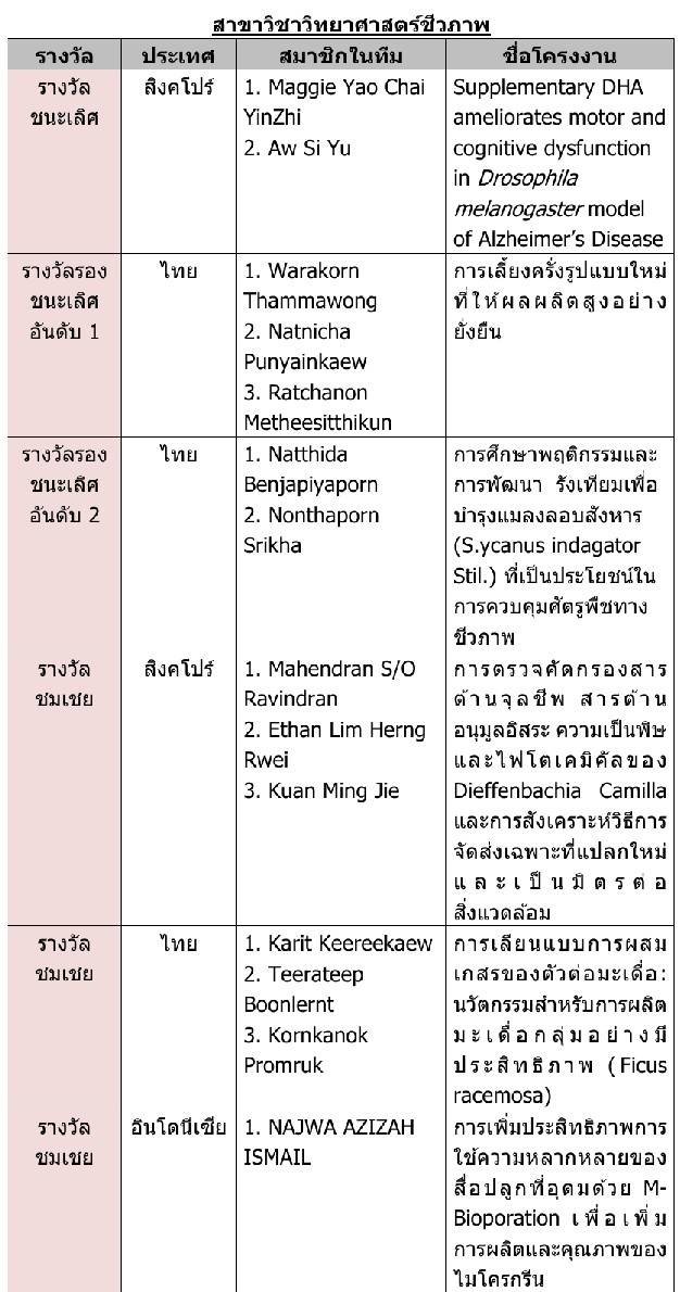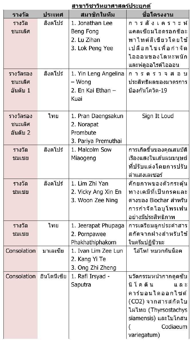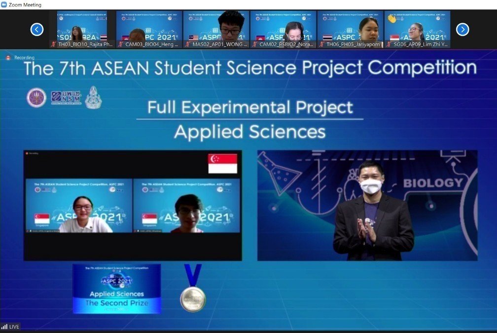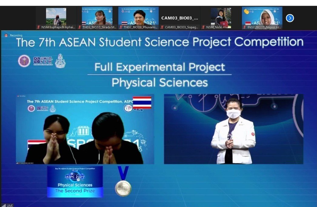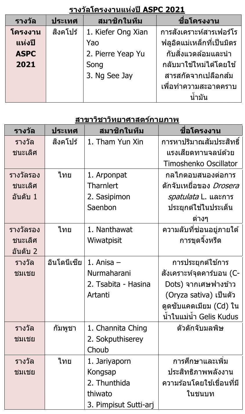 สำหรับผลรางวัล “การแข่งขันโครงงานวิทยาศาสตร์เยาวชนกลุ่มประเทศอาเซียน” The 7th ASEAN Student Science Project Competition (ASPC 2021) มีดังนี้