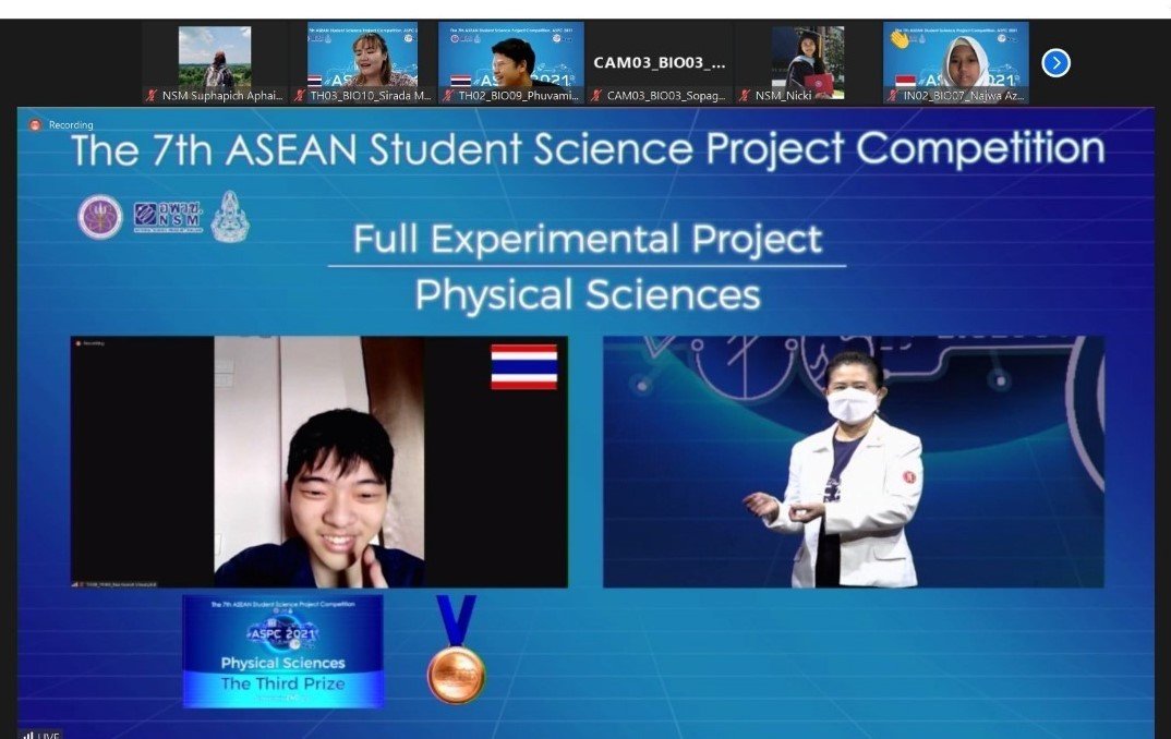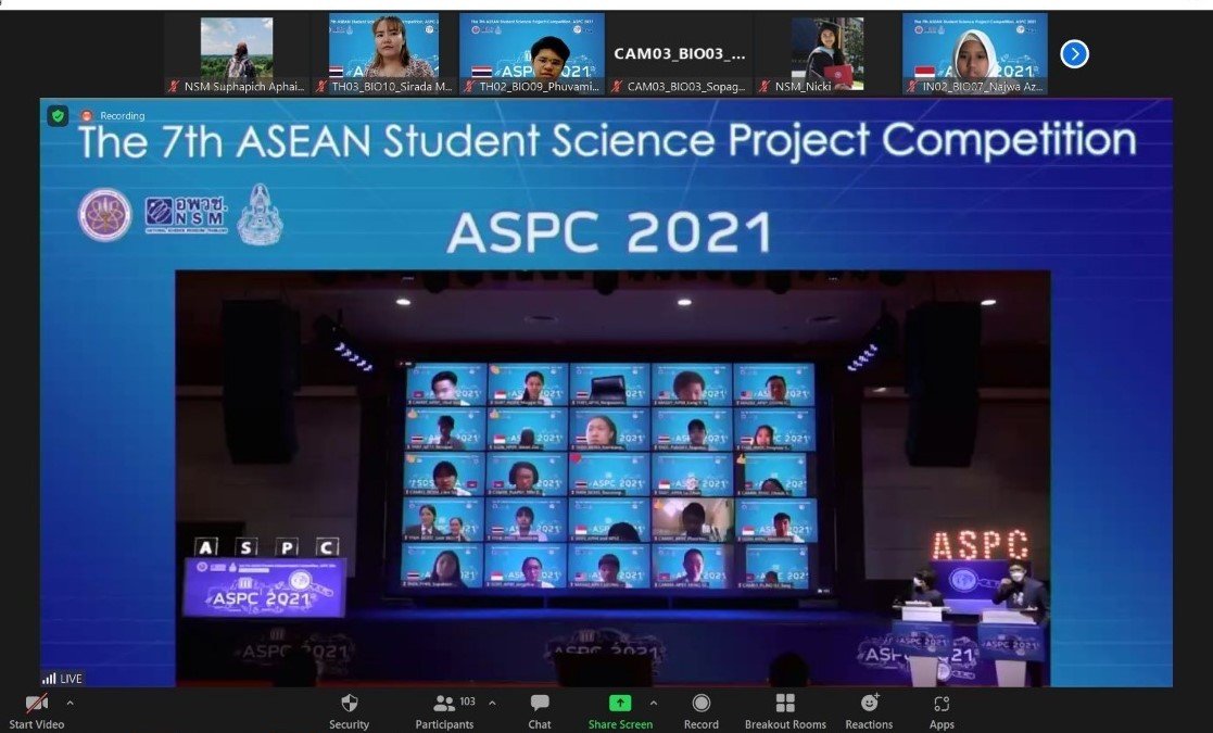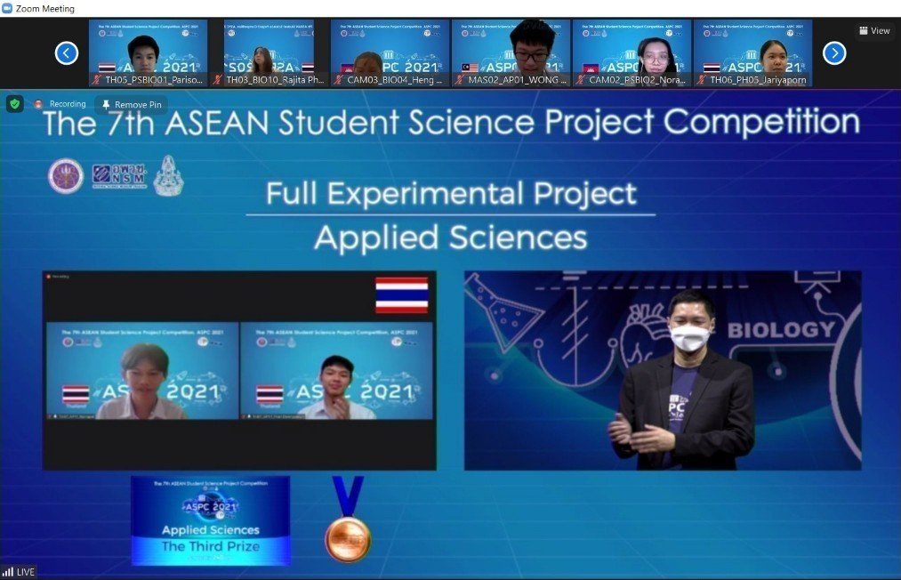 องค์การพิพิธภัณฑ์วิทยาศาสตร์แห่งชาติ (อพวช.) กระทรวงการอุดมศึกษา วิทยาศาสตร์ วิจัยและนวัตกรรม (อว.) จัดพิธีปิดและประกาศผล “การแข่งขันโครงงานวิทยาศาสตร์เยาวชนกลุ่มประเทศอาเซียน” The 7th ASEAN Student Science Project Competition (ASPC 2021) รูปแบบออนไลน์ เมื่อวันที่ 5 กันยายนที่ผ่านมา โดยได้รับเกียรติจาก ศาสตราจารย์ ดร.นายแพทย์สิริฤกษ์ ทรงศิวิไล ปลัดกระทรวงการอุดมศึกษา วิทยาศาสตร์ วิจัยและนวัตกรรม เป็นประธานในพิธีปิดฯ พร้อมด้วย ผศ.ดร.รวิน ระวิวงศ์ ผู้อำนวยการองค์การพิพิธภัณฑ์วิทยาศาสตร์แห่งชาติ และ ศ.ดร.ศุภวรรณ ตันตยานนท์ นายกสมาคมวิทยาศาสตร์แห่งประเทศไทย ในพระบรมราชูปถัมภ์ ร่วมในพิธีปิดฯ ดังกล่าว ซึ่งมีเยาวชนจาก 5 ประเทศอาเซียนเข้าร่วม ได้แก่ ไทย มาเลเซีย กัมพูชา อินโดนีเซีย และสิงคโปร์