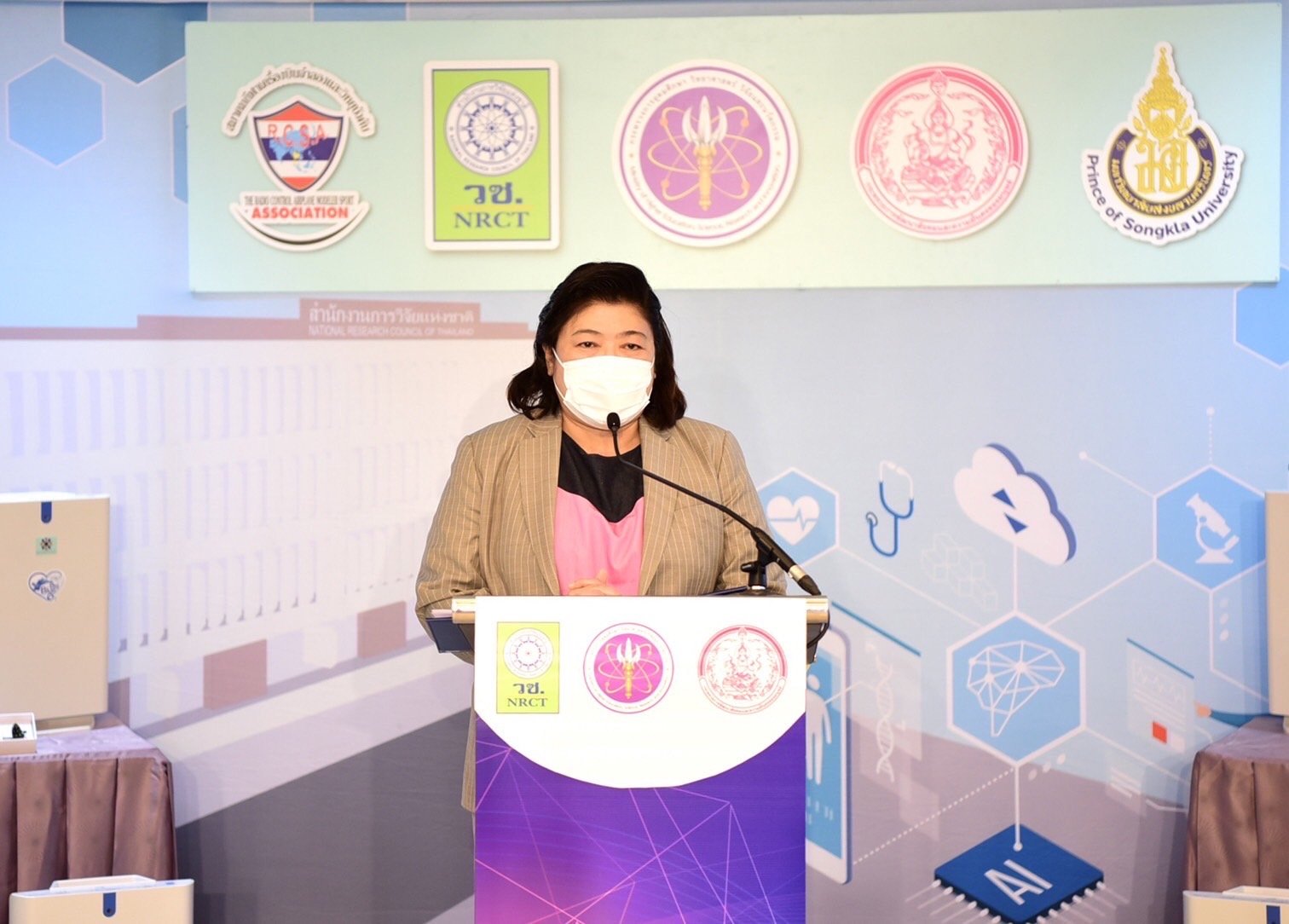 ดร.วิภารัตน์ ดีอ่อง ผู้อำนวยการสำนักงานการวิจัยแห่งชาติ กล่าวว่า วช. ได้ให้ความสำคัญต่อการนำเทคโนโลยีปัญญาประดิษฐ์ (AI : Arificial Inteligence) มาใช้ประโยชน์ในการร่วมป้องกันโควิด -19 โดยได้สนับสนุนทุนวิจัยแก่สถาบันเทคโนโลยีนานาชาติสิรินธร มหาวิทยาลัยธรรมศาสตร์ เพื่อดำเนินการโครงการเรื่อง “ปัญญาประดิษฐ์เพื่อประเมินพฤติกรรมการดูแลสุขภาพของประชาชนในช่วงโควิด-19" และในระยะแรกได้รับการสนับสนุนจากกรุงเทพมหานครและบริษัทโทรคมนาคมแห่งชาติ จำกัด (มหาชน) ในการสร้างระบบวิเคราะห์ภาพจากกล้องโทรทัศน์วงจรปิด (CCTV) เพื่อวิเคราะห์การสวมหน้ากากอนามัยและการสัญจรของภาคประชาชนในสถานที่ต่าง ๆ โดยมีการรายงานผลการวิเคราะห์ไปยังศูนย์บริหารสถานการณ์แพร่ระบาดของโรคติดต่อเชื้อไวรัสโคโรนา 2019 (ศบค.) และมีการสื่อสารต่อสาธารณชนอย่างต่อเนื่อง วช.เห็นความสำคัญของการพัฒนาระบบปัญญาประดิษฐ์เพื่อป้องกันโควิด–19 ภาย ในกรุงเทพฯ ปริมณฑล และส่วนภูมิภาค โดยนำระบบปัญญาประดิษฐ์/เทคโนโลยีดิจิทัลมาช่วยในการคัดกรองและสนับสนุนการป้องกันสุขภาพประชาชน ได้แก่ การส่งเสริมการสวมใส่หน้ากากอนามัยอย่างถูกต้อง การส่งเสริมการเว้นระยะห่าง การให้ความรู้เพื่อหลีกเลี่ยงการสัมผัสเพื่อการรับรู้สุขภาพของประชาชน ทั้งนี้ระบบปัญญาประดิษฐ์ หรือ AI สามารถพัฒนาระบบตรวจจับหน้ากากอนามัย การพัฒนาระบบการเว้นระยะห่าง และระบบหลังบ้านที่ใช้ในการบริหารการเฝ้าระวัง โดยจะมีการนำเสนอข้อมูลหรือดาต้าวิชวลไลเซชั่น (Data Visualization) จากข้อมูลปัญญาประดิษฐ์ ในการประเมินพฤติกรรมการสวมหน้ากากอนามัยของประชาชน ทั้งในกรุงเทพฯ ปริมณฑล และส่วนภูมิภาค เพื่อส่งเสริมและขอความร่วมมือในการใส่หน้ากากอนามัยอย่างต่อเนื่อง ซึ่งระบบประเมินและติดตามการใส่หน้ากากอนามัย ระบบวัดการเว้นระยะห่างจะช่วยทำให้มีข้อมูลนำเสนอต่อภาครัฐ รวมไปถึงภาคประชาชน ในการให้ความร่วมมือในการป้องกันตัวจากโรคระบาดในเขตกรุงเทพมหานคร ปริมณฑล และส่วนภูมิภาคต่าง ๆ